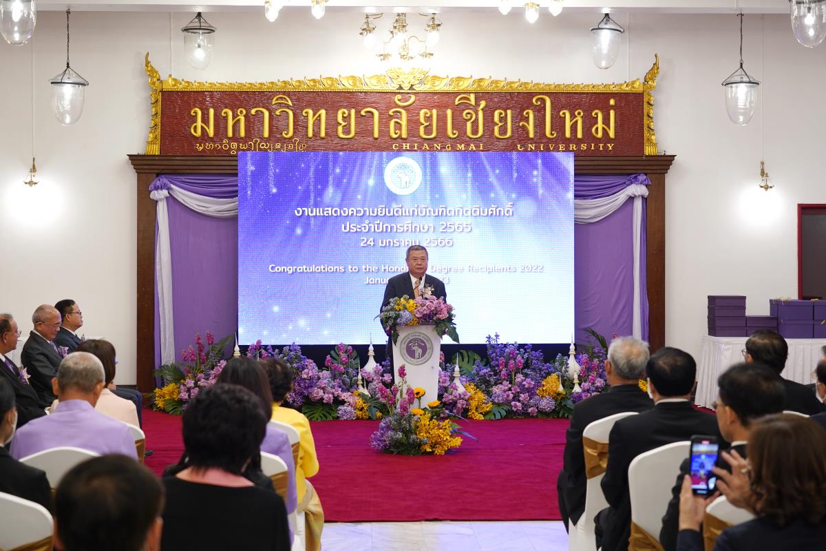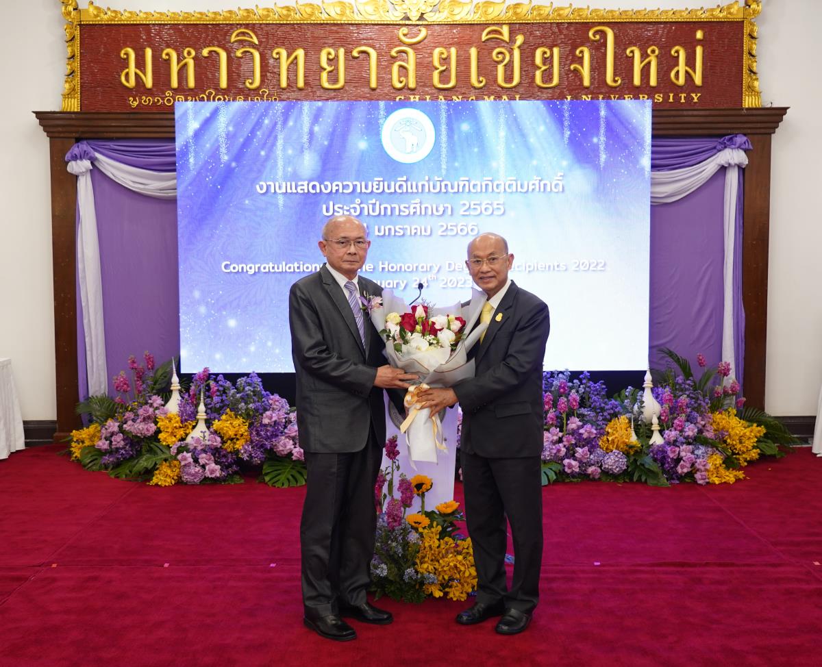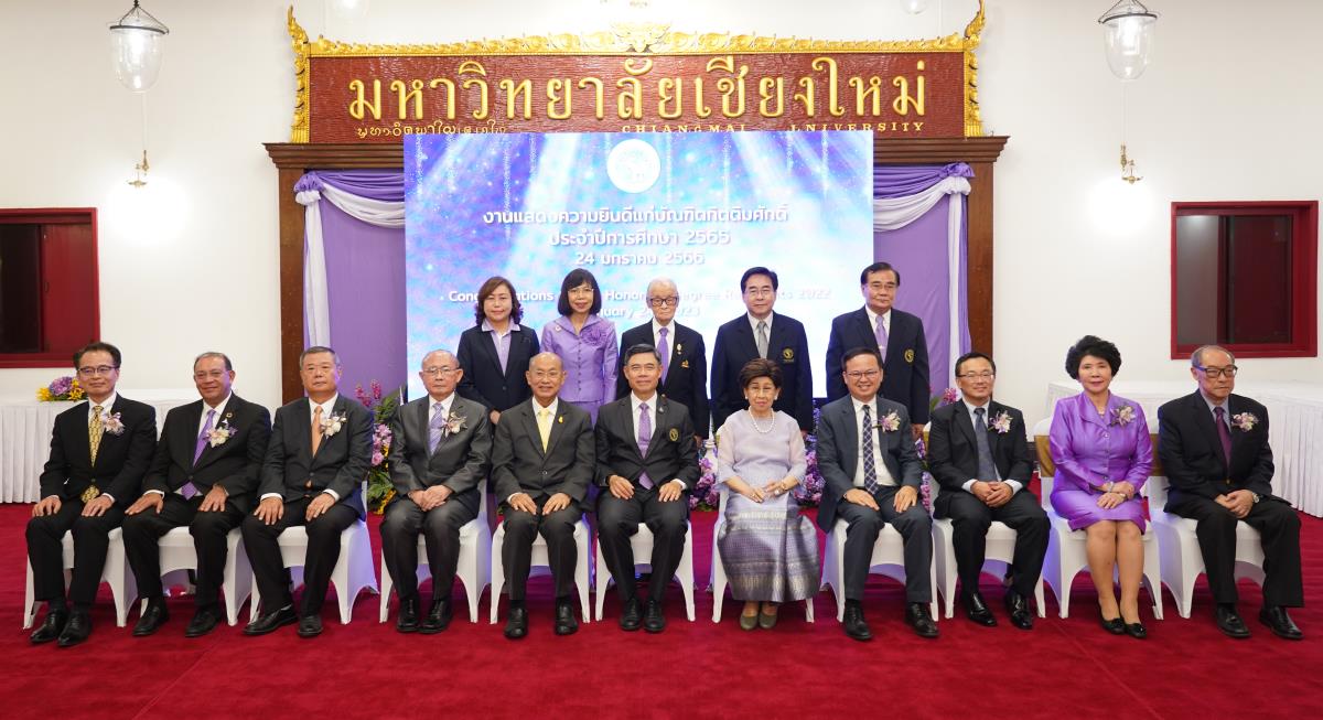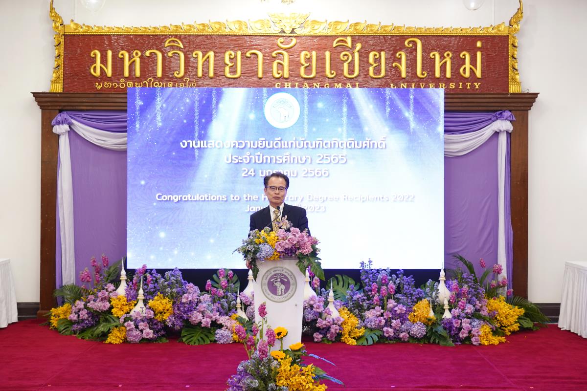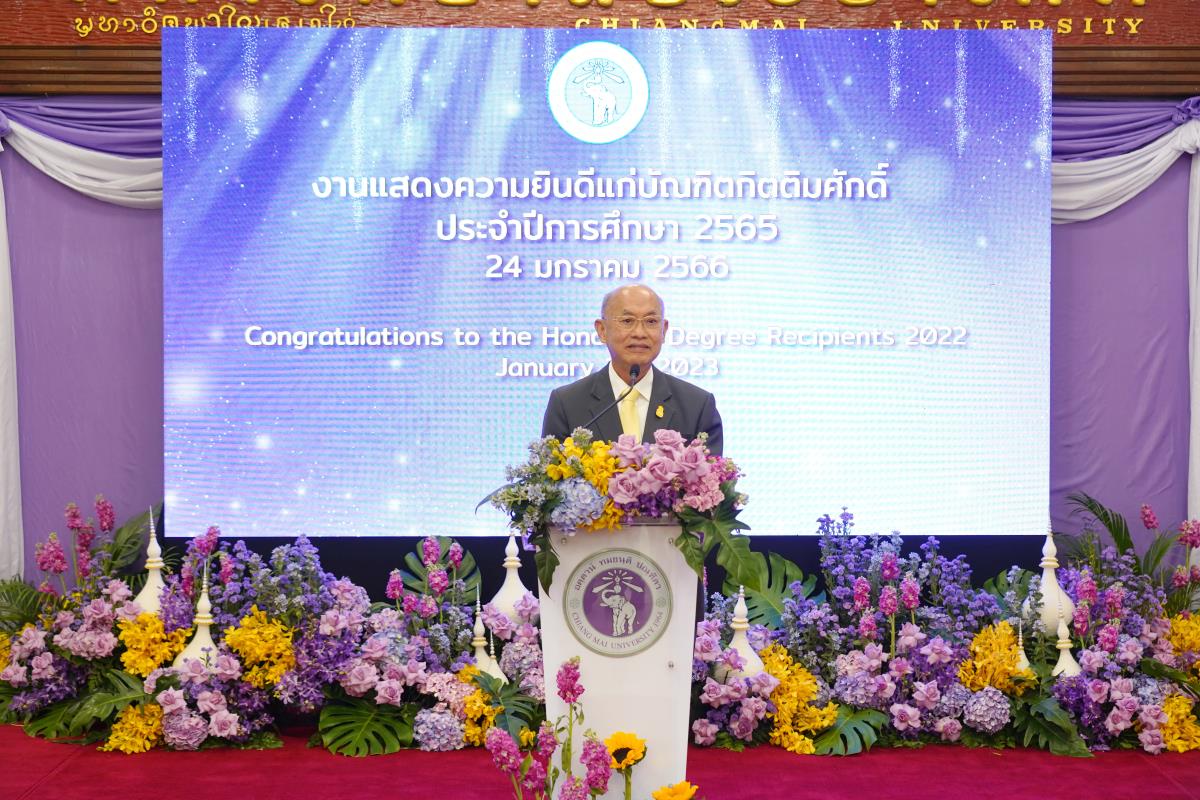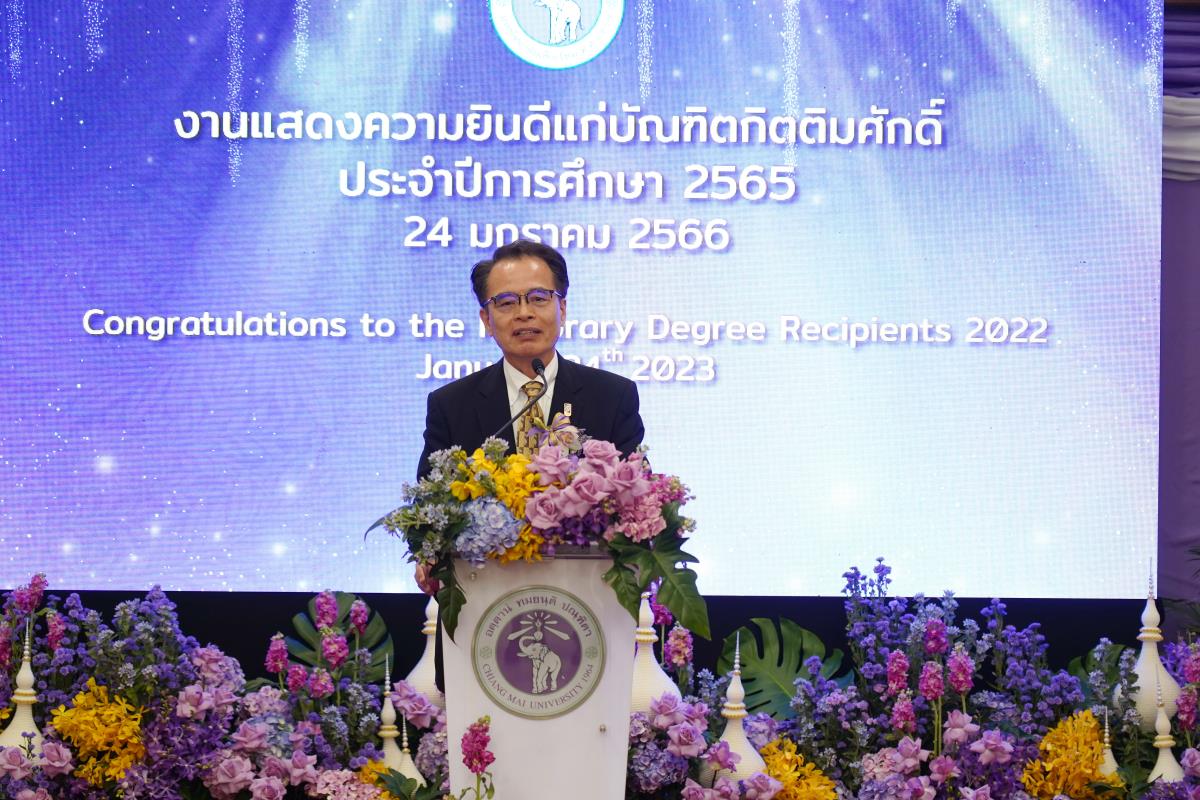 มหาวิทยาลัยเชียงใหม่ จัดงานแสดงความยินดีผู้ที่ได้รับพระราชทานปริญญากิตติมศักดิ์ ในงานพิธีพระราชทานปริญญาบัตร ครั้งที่ 57 ประจำปีการศึกษา 2564-2565 โดยมีศาสตราจารย์เกียรติคุณ นายแพทย์เกษม วัฒนชัย นายกสภามหาวิทยาลัยเชียงใหม่ กล่าวแสดงความยินดี มอบเกียรติบัตร และมอบดอกไม้ ศาสตราจารย์ ดร.นพ.พงษ์รักษ์ ศรีบัณฑิตมงคล อธิการบดีมหาวิทยาลัยเชียงใหม่ กล่าวต้อนรับและมอบของที่ระลึก แก่ผู้ที่ได้รับพระราชทานปริญญากิตติมศักดิ์ ณ ศาลาธรรม มหาวิทยาลัยเชียงใหม่ เมื่อวันอังคารที่ 24 มกราคม 2566