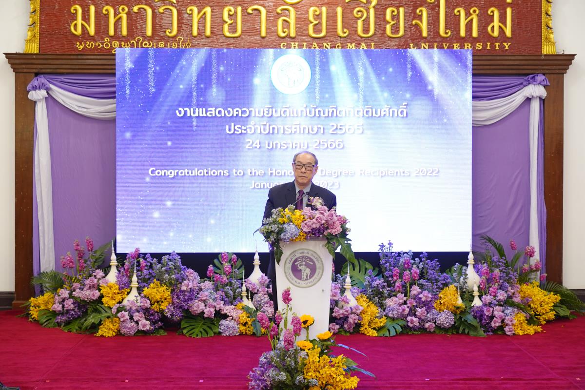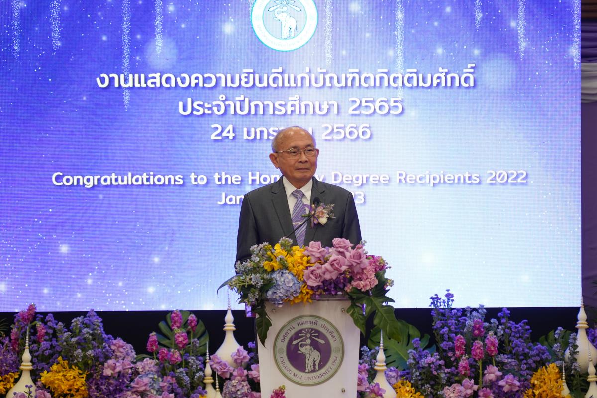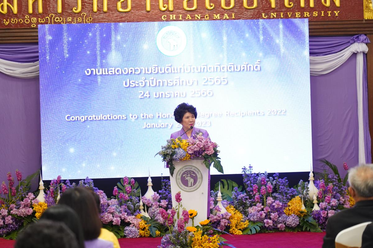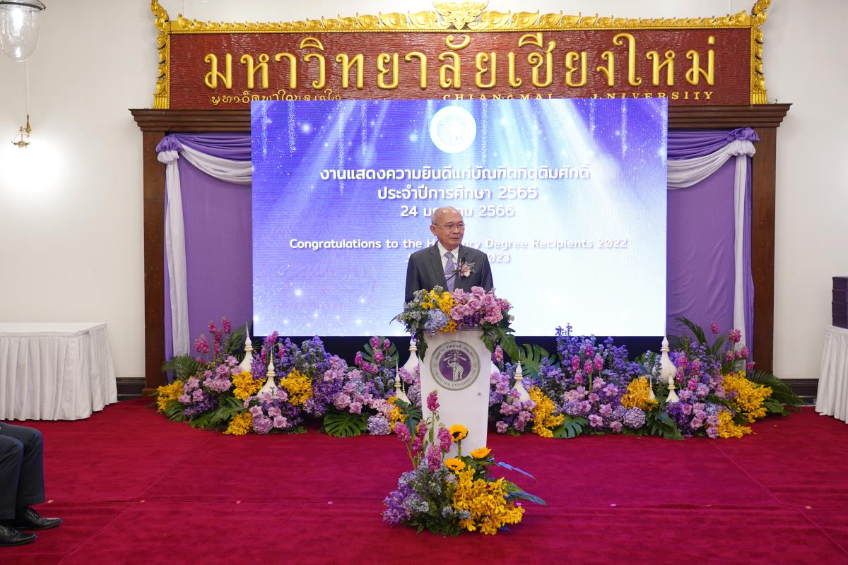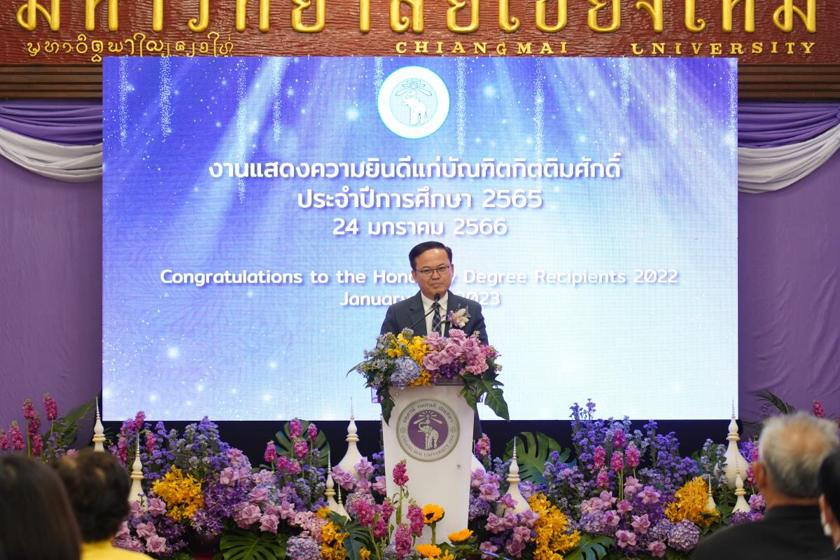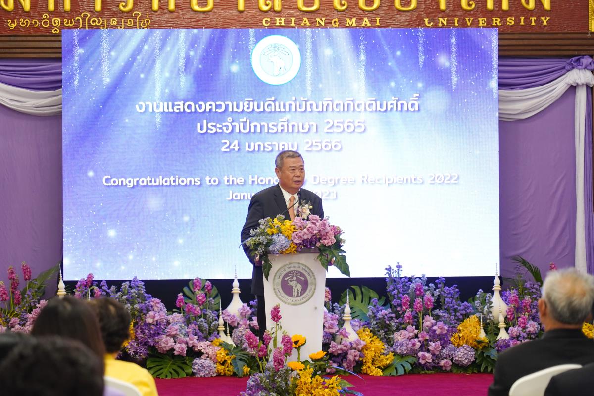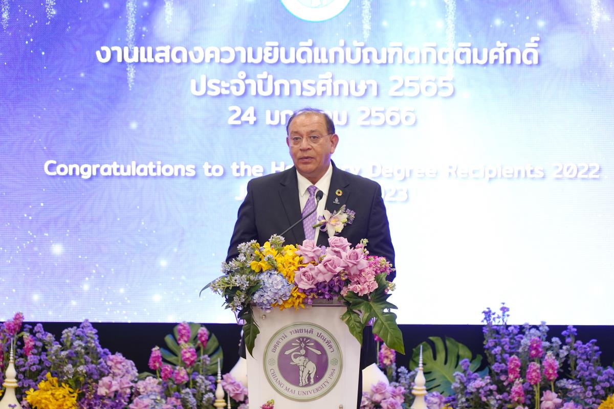 มหาวิทยาลัยเชียงใหม่ จัดงานแสดงความยินดีผู้ที่ได้รับพระราชทานปริญญากิตติมศักดิ์ ในงานพิธีพระราชทานปริญญาบัตร ครั้งที่ 57 ประจำปีการศึกษา 2564-2565 โดยมีศาสตราจารย์เกียรติคุณ นายแพทย์เกษม วัฒนชัย นายกสภามหาวิทยาลัยเชียงใหม่ กล่าวแสดงความยินดี มอบเกียรติบัตร และมอบดอกไม้ ศาสตราจารย์ ดร.นพ.พงษ์รักษ์ ศรีบัณฑิตมงคล อธิการบดีมหาวิทยาลัยเชียงใหม่ กล่าวต้อนรับและมอบของที่ระลึก แก่ผู้ที่ได้รับพระราชทานปริญญากิตติมศักดิ์ ณ ศาลาธรรม มหาวิทยาลัยเชียงใหม่ เมื่อวันอังคารที่ 24 มกราคม 2566