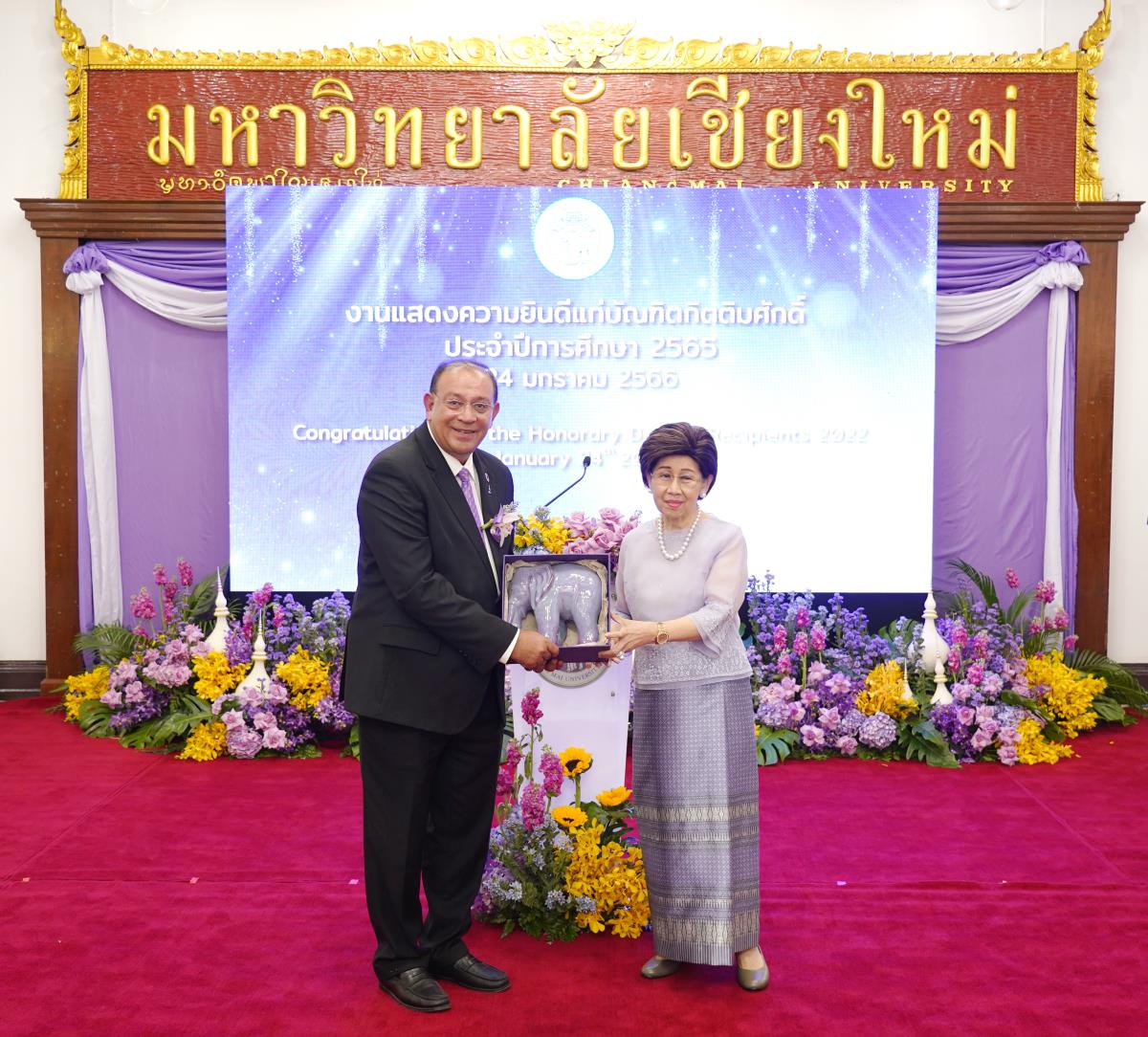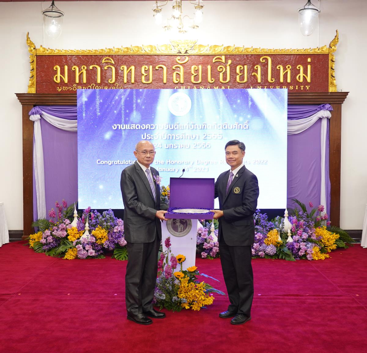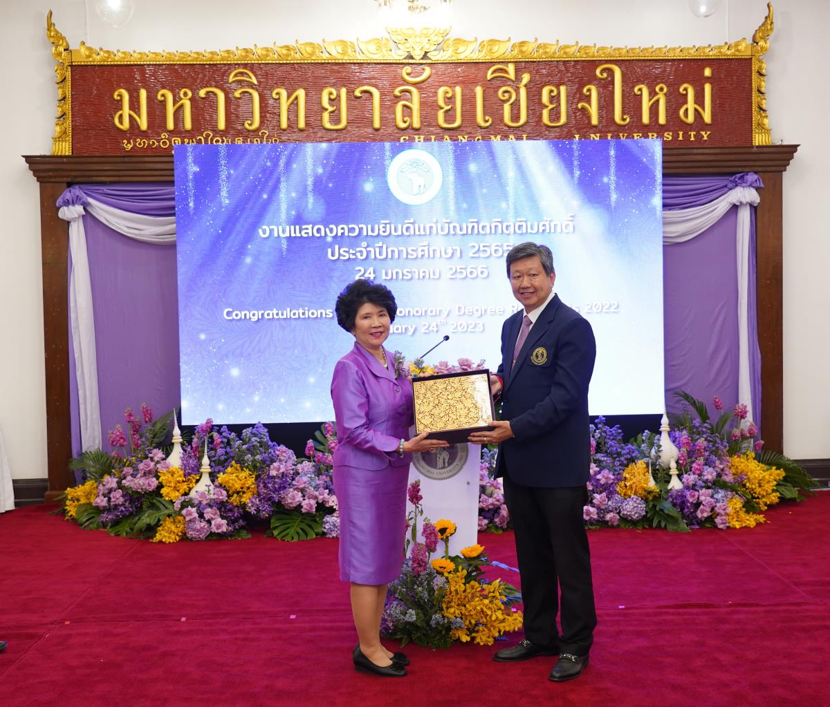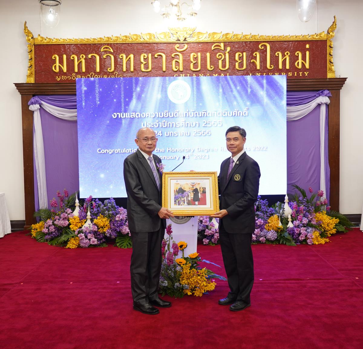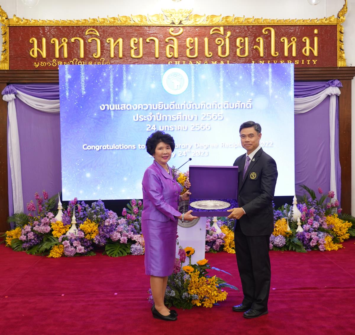 มหาวิทยาลัยเชียงใหม่ จัดงานแสดงความยินดีผู้ที่ได้รับพระราชทานปริญญากิตติมศักดิ์ ในงานพิธีพระราชทานปริญญาบัตร ครั้งที่ 57 ประจำปีการศึกษา 2564-2565 โดยมีศาสตราจารย์เกียรติคุณ นายแพทย์เกษม วัฒนชัย นายกสภามหาวิทยาลัยเชียงใหม่ กล่าวแสดงความยินดี มอบเกียรติบัตร และมอบดอกไม้ ศาสตราจารย์ ดร.นพ.พงษ์รักษ์ ศรีบัณฑิตมงคล อธิการบดีมหาวิทยาลัยเชียงใหม่ กล่าวต้อนรับและมอบของที่ระลึก แก่ผู้ที่ได้รับพระราชทานปริญญากิตติมศักดิ์ ณ ศาลาธรรม มหาวิทยาลัยเชียงใหม่ เมื่อวันอังคารที่ 24 มกราคม 2566