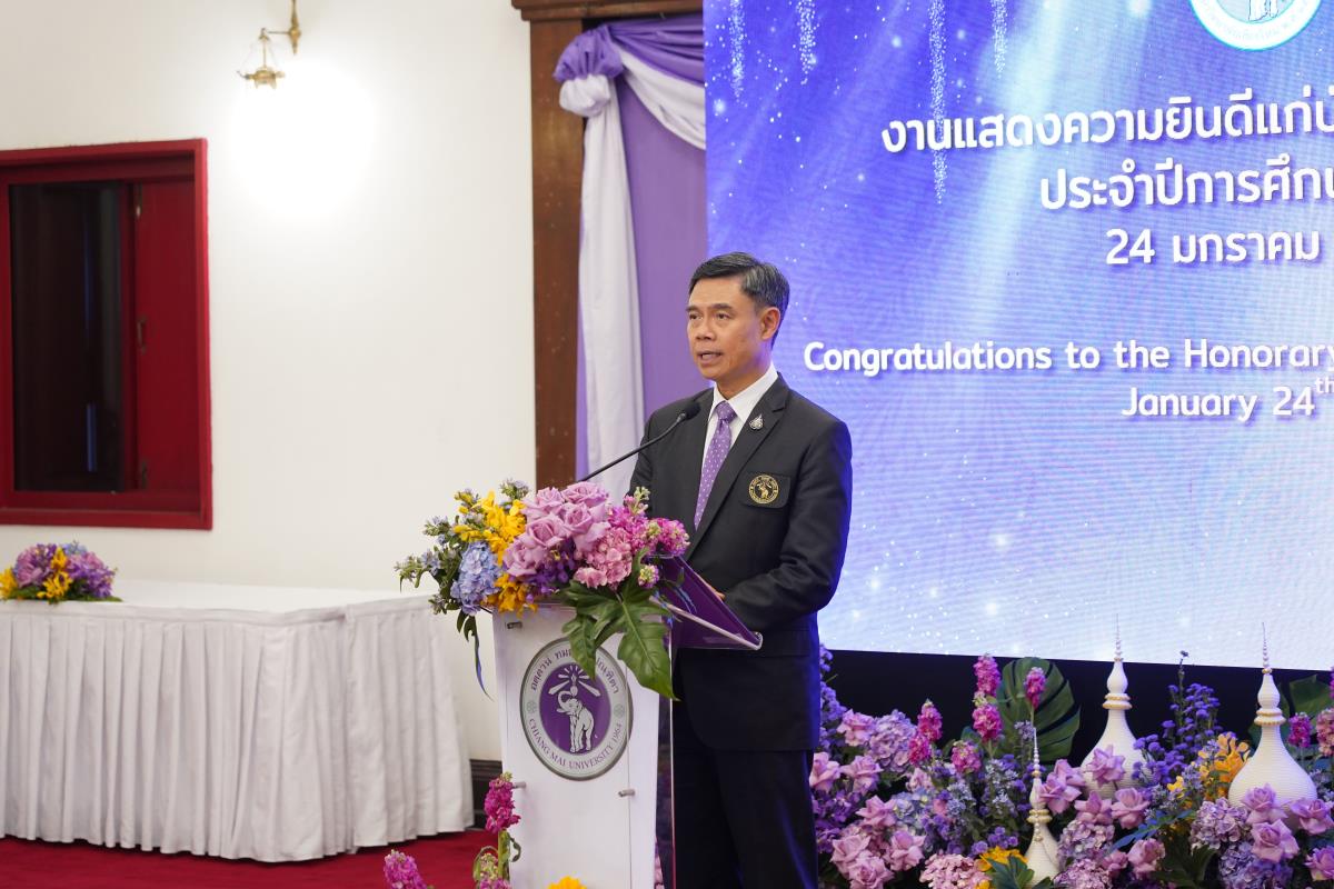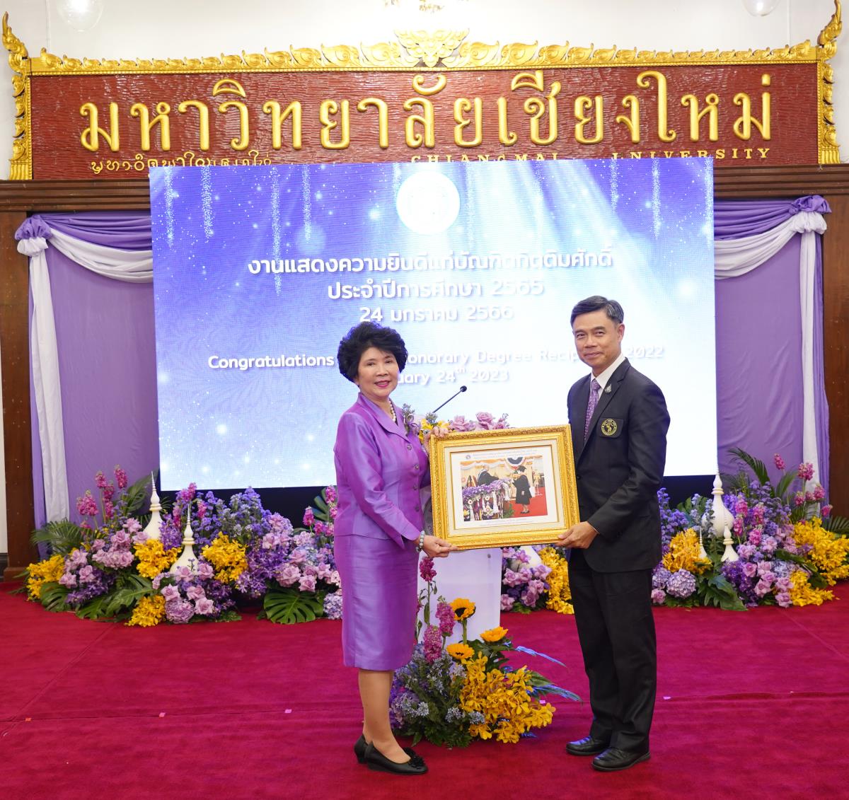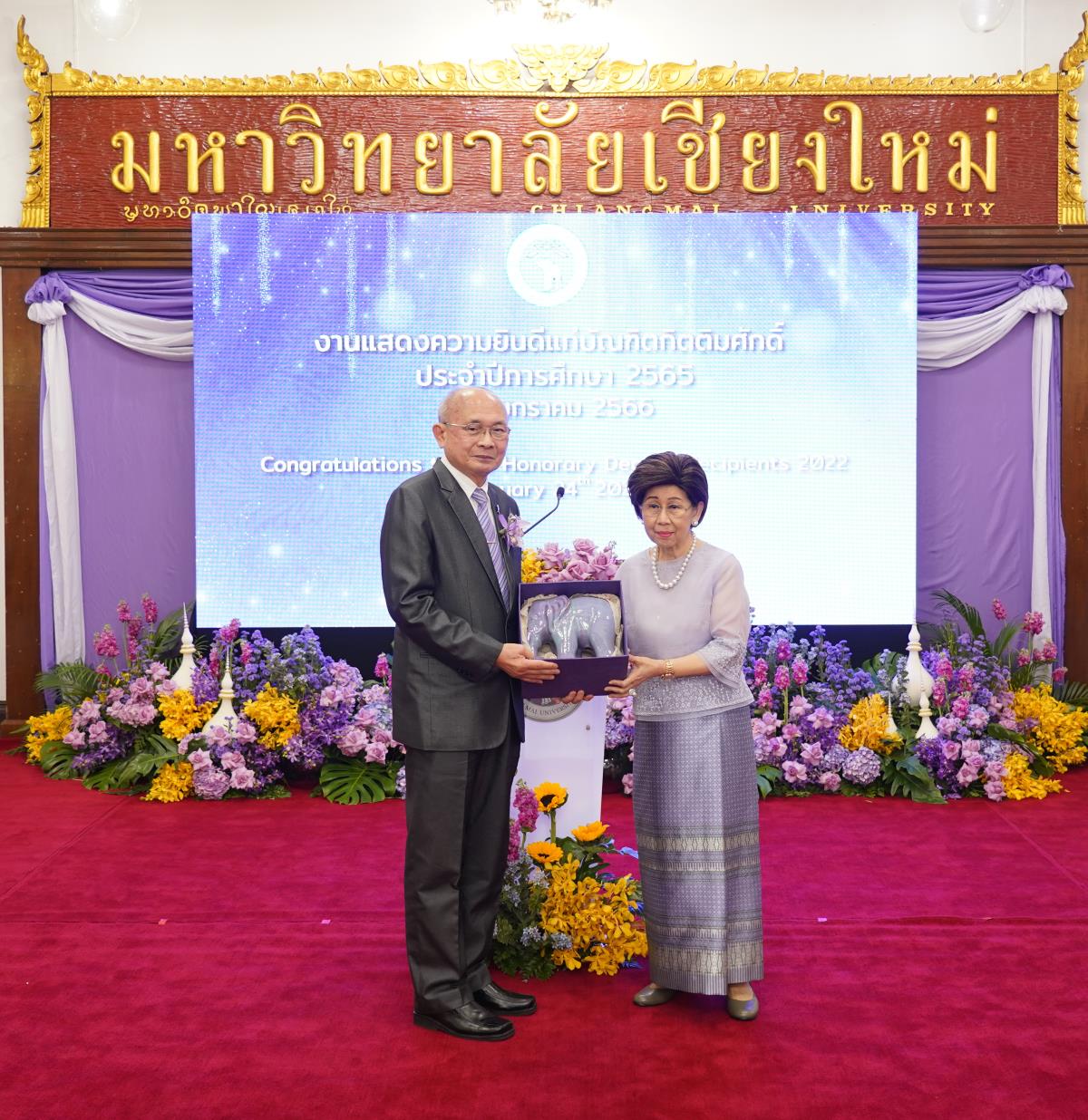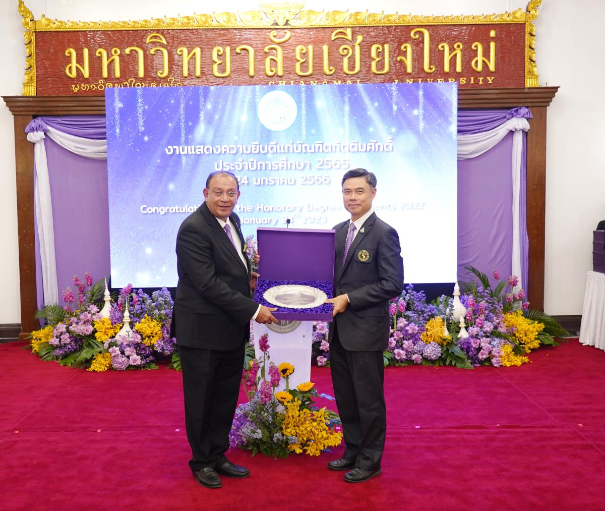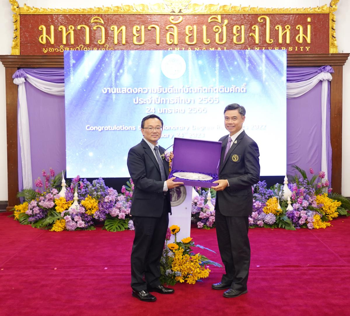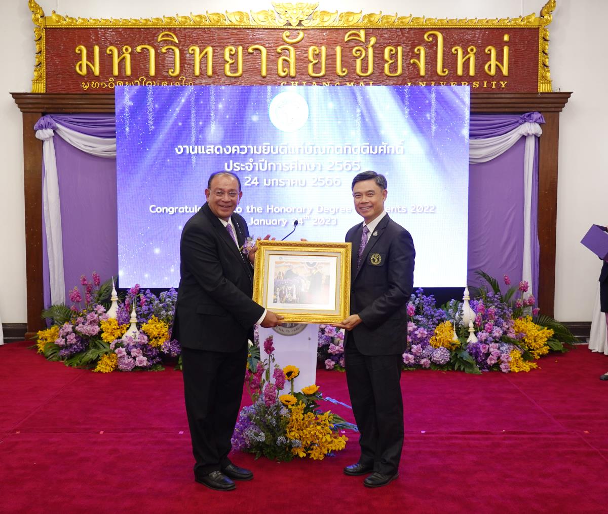 มหาวิทยาลัยเชียงใหม่ จัดงานแสดงความยินดีผู้ที่ได้รับพระราชทานปริญญากิตติมศักดิ์ ในงานพิธีพระราชทานปริญญาบัตร ครั้งที่ 57 ประจำปีการศึกษา 2564-2565 โดยมีศาสตราจารย์เกียรติคุณ นายแพทย์เกษม วัฒนชัย นายกสภามหาวิทยาลัยเชียงใหม่ กล่าวแสดงความยินดี มอบเกียรติบัตร และมอบดอกไม้ ศาสตราจารย์ ดร.นพ.พงษ์รักษ์ ศรีบัณฑิตมงคล อธิการบดีมหาวิทยาลัยเชียงใหม่ กล่าวต้อนรับและมอบของที่ระลึก แก่ผู้ที่ได้รับพระราชทานปริญญากิตติมศักดิ์ ณ ศาลาธรรม มหาวิทยาลัยเชียงใหม่ เมื่อวันอังคารที่ 24 มกราคม 2566