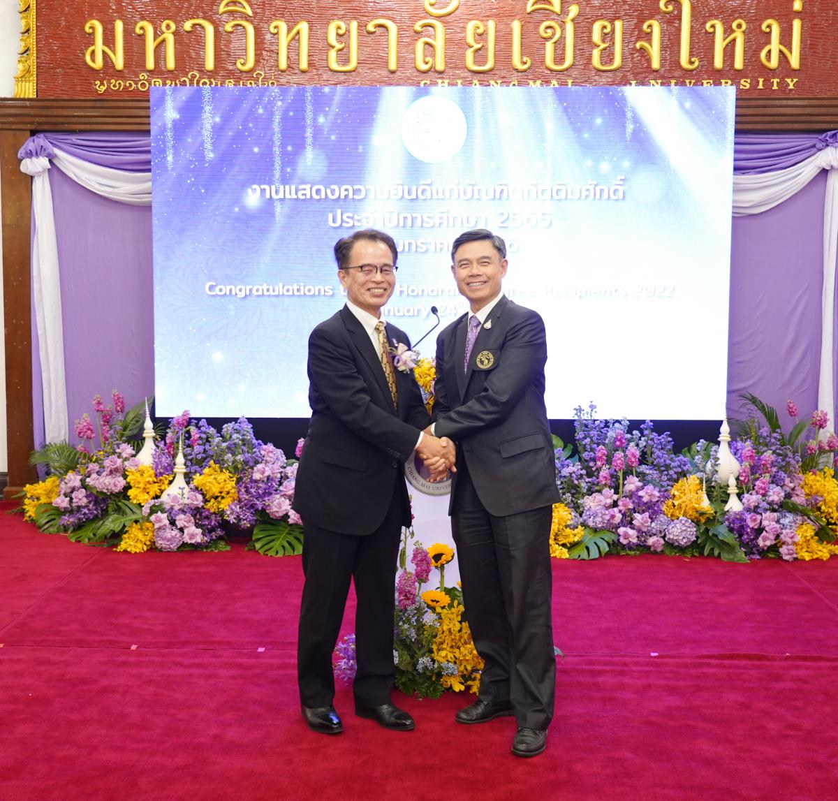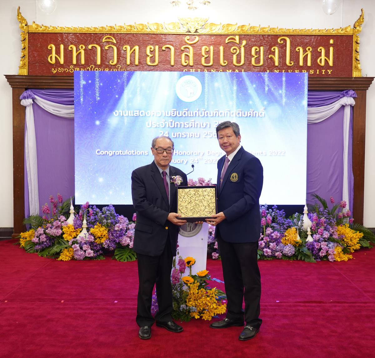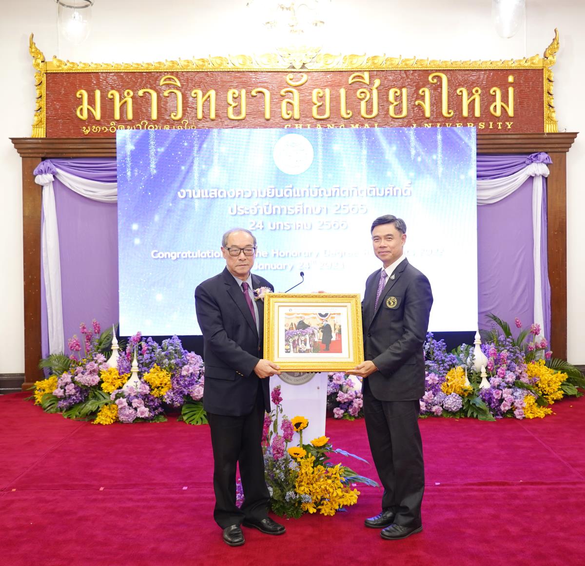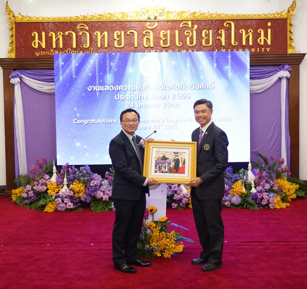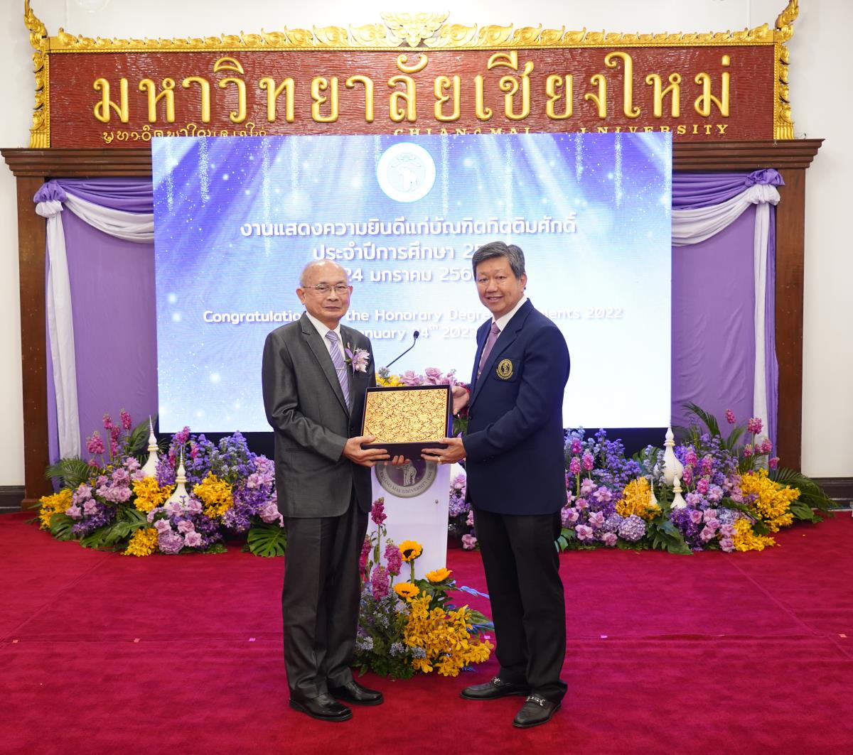 มหาวิทยาลัยเชียงใหม่ จัดงานแสดงความยินดีผู้ที่ได้รับพระราชทานปริญญากิตติมศักดิ์ ในงานพิธีพระราชทานปริญญาบัตร ครั้งที่ 57 ประจำปีการศึกษา 2564-2565 โดยมีศาสตราจารย์เกียรติคุณ นายแพทย์เกษม วัฒนชัย นายกสภามหาวิทยาลัยเชียงใหม่ กล่าวแสดงความยินดี มอบเกียรติบัตร และมอบดอกไม้ ศาสตราจารย์ ดร.นพ.พงษ์รักษ์ ศรีบัณฑิตมงคล อธิการบดีมหาวิทยาลัยเชียงใหม่ กล่าวต้อนรับและมอบของที่ระลึก แก่ผู้ที่ได้รับพระราชทานปริญญากิตติมศักดิ์ ณ ศาลาธรรม มหาวิทยาลัยเชียงใหม่ เมื่อวันอังคารที่ 24 มกราคม 2566