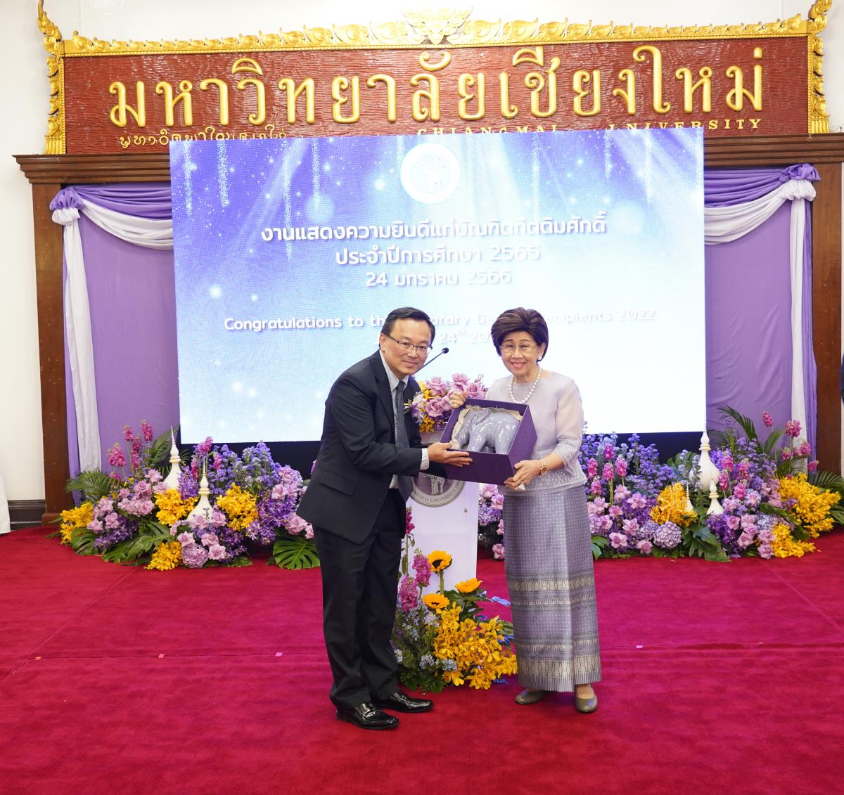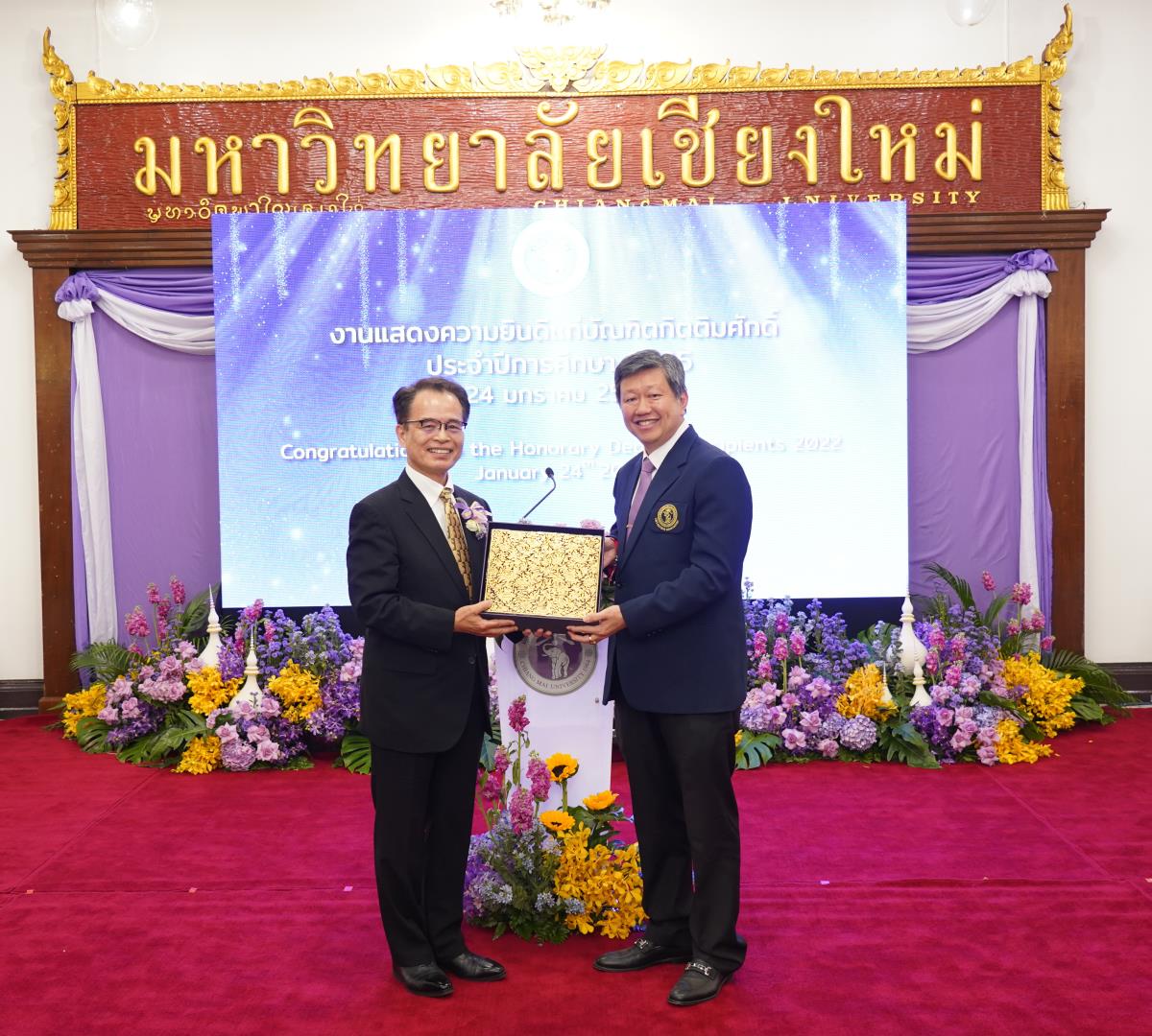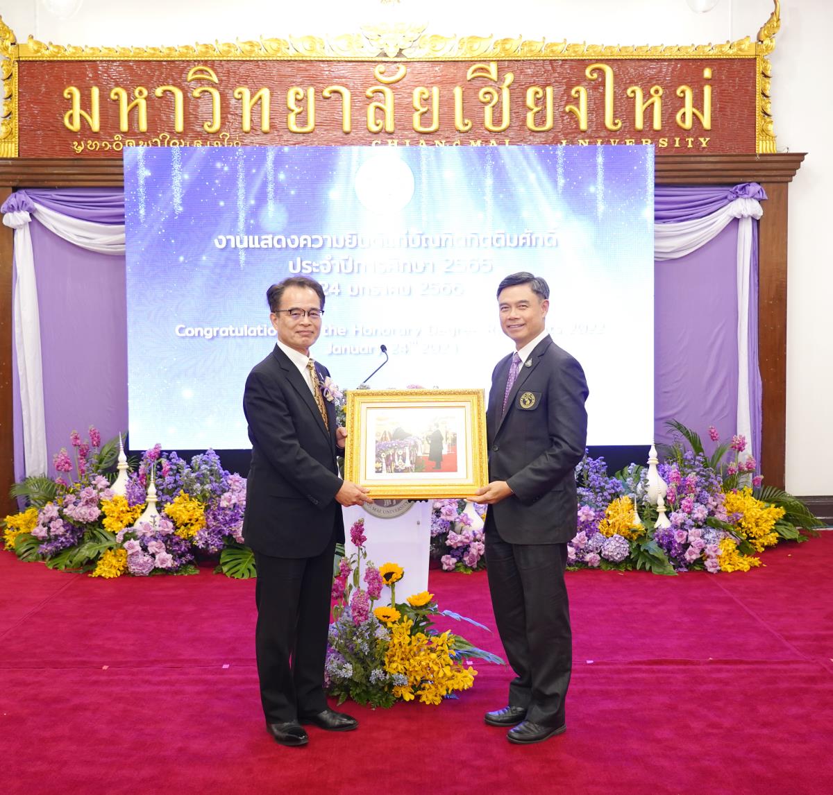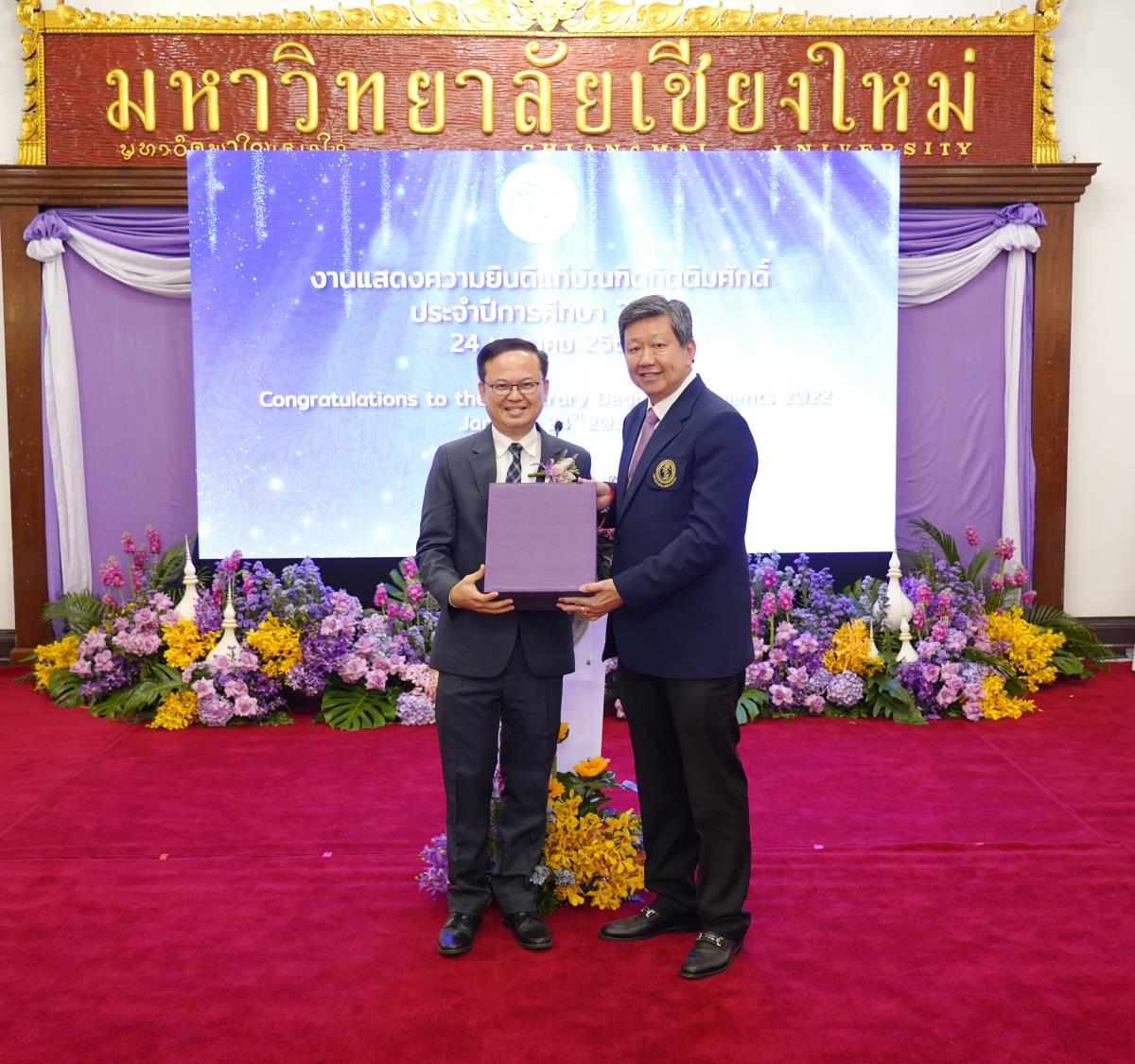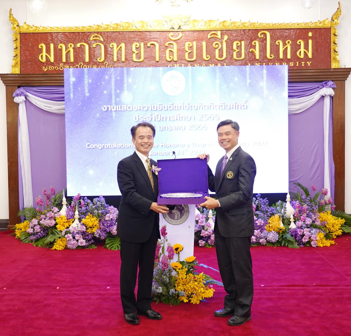 มหาวิทยาลัยเชียงใหม่ จัดงานแสดงความยินดีผู้ที่ได้รับพระราชทานปริญญากิตติมศักดิ์ ในงานพิธีพระราชทานปริญญาบัตร ครั้งที่ 57 ประจำปีการศึกษา 2564-2565 โดยมีศาสตราจารย์เกียรติคุณ นายแพทย์เกษม วัฒนชัย นายกสภามหาวิทยาลัยเชียงใหม่ กล่าวแสดงความยินดี มอบเกียรติบัตร และมอบดอกไม้ ศาสตราจารย์ ดร.นพ.พงษ์รักษ์ ศรีบัณฑิตมงคล อธิการบดีมหาวิทยาลัยเชียงใหม่ กล่าวต้อนรับและมอบของที่ระลึก แก่ผู้ที่ได้รับพระราชทานปริญญากิตติมศักดิ์ ณ ศาลาธรรม มหาวิทยาลัยเชียงใหม่ เมื่อวันอังคารที่ 24 มกราคม 2566
