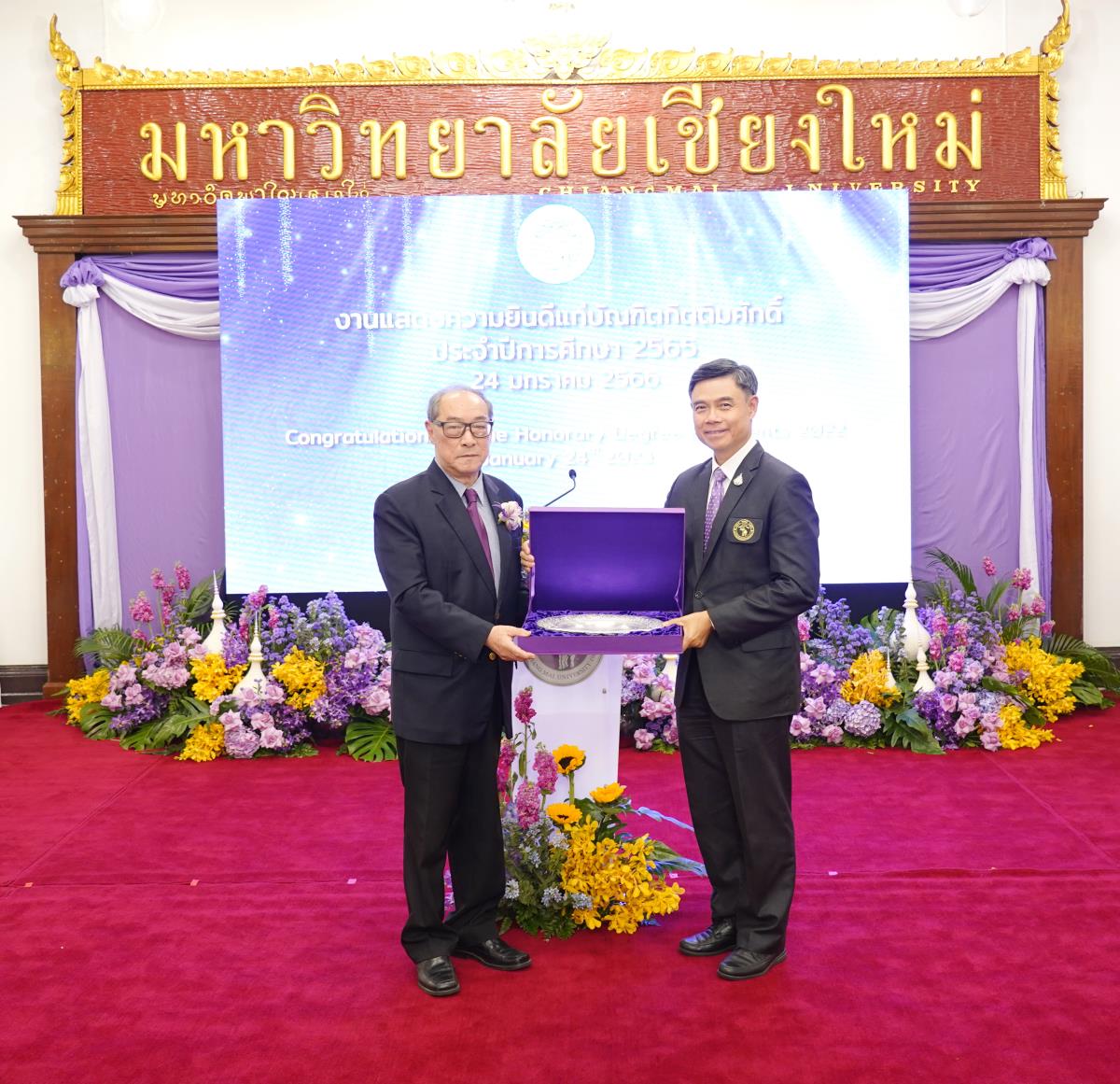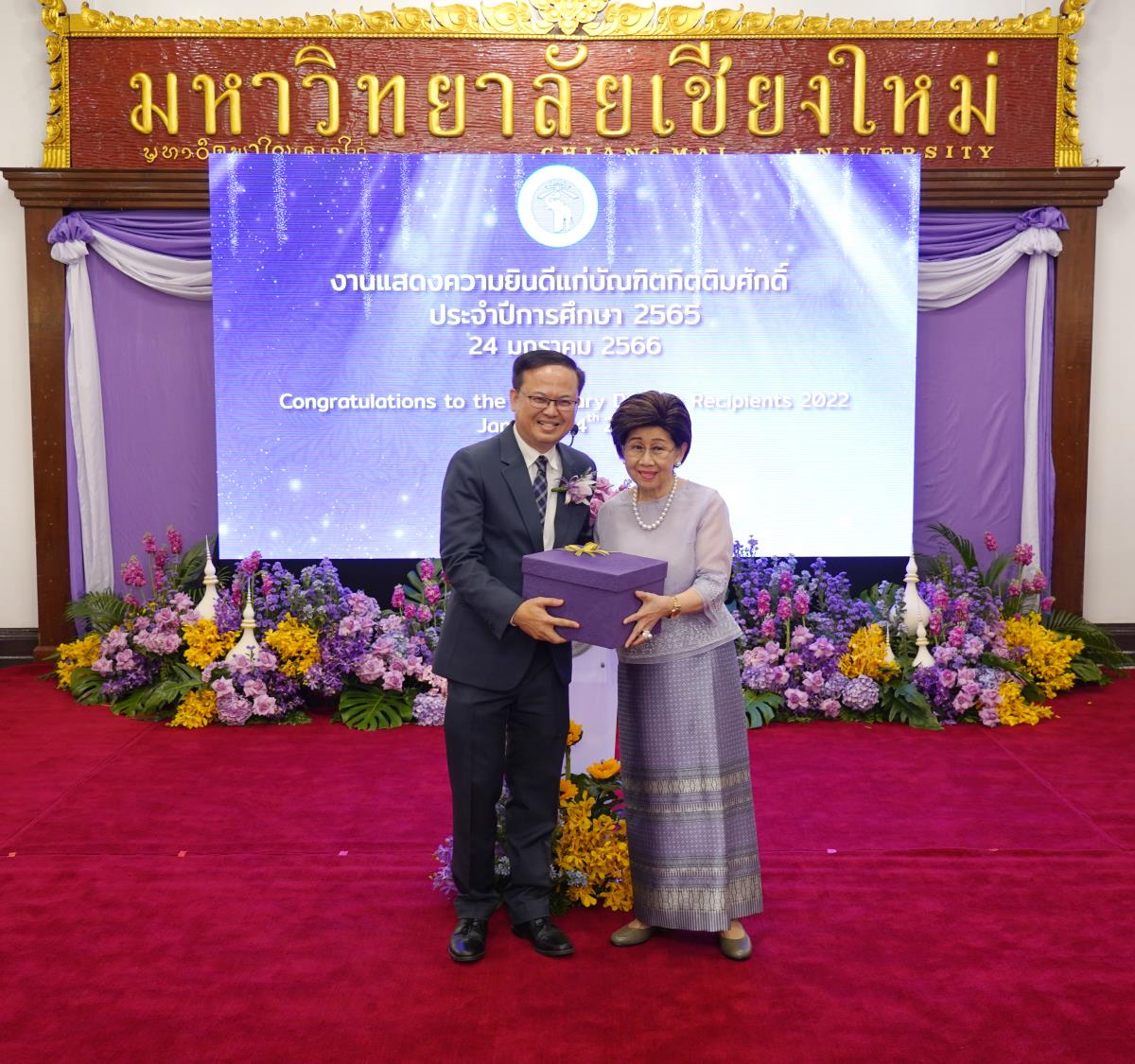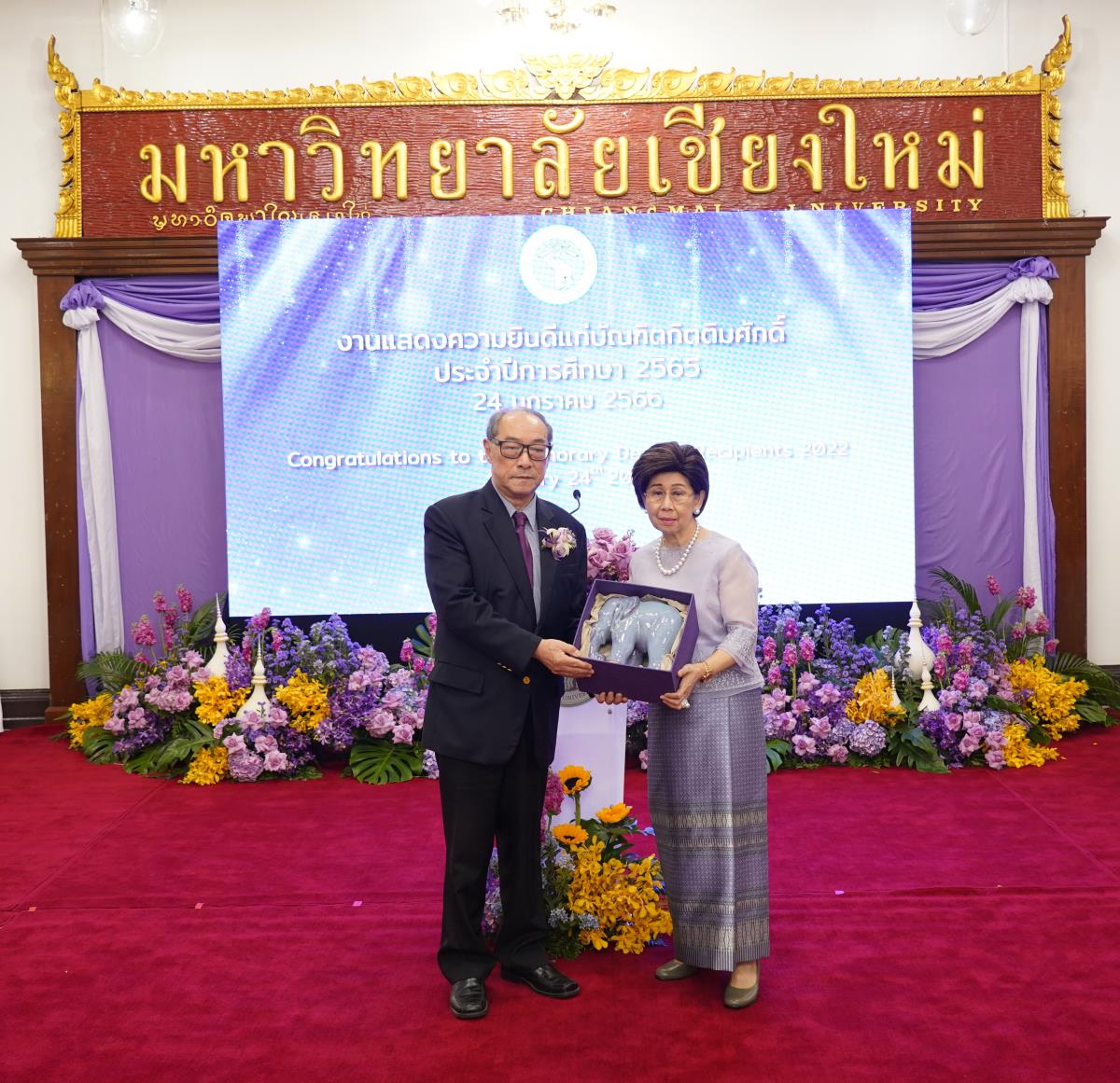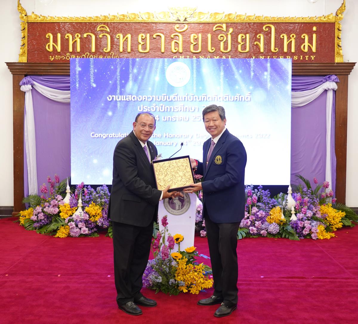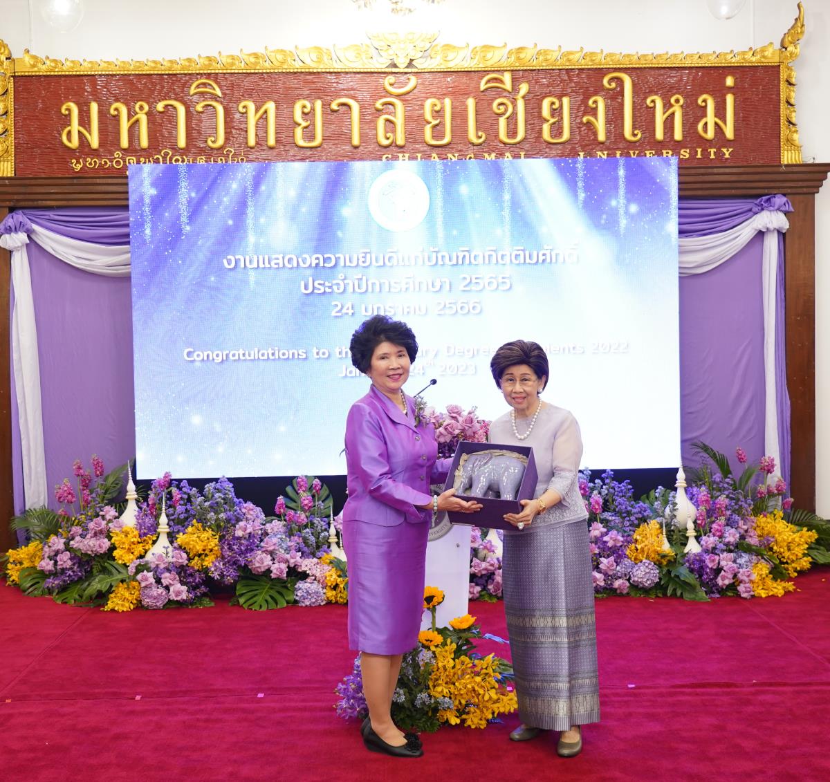 มหาวิทยาลัยเชียงใหม่ จัดงานแสดงความยินดีผู้ที่ได้รับพระราชทานปริญญากิตติมศักดิ์ ในงานพิธีพระราชทานปริญญาบัตร ครั้งที่ 57 ประจำปีการศึกษา 2564-2565 โดยมีศาสตราจารย์เกียรติคุณ นายแพทย์เกษม วัฒนชัย นายกสภามหาวิทยาลัยเชียงใหม่ กล่าวแสดงความยินดี มอบเกียรติบัตร และมอบดอกไม้ ศาสตราจารย์ ดร.นพ.พงษ์รักษ์ ศรีบัณฑิตมงคล อธิการบดีมหาวิทยาลัยเชียงใหม่ กล่าวต้อนรับและมอบของที่ระลึก แก่ผู้ที่ได้รับพระราชทานปริญญากิตติมศักดิ์ ณ ศาลาธรรม มหาวิทยาลัยเชียงใหม่ เมื่อวันอังคารที่ 24 มกราคม 2566