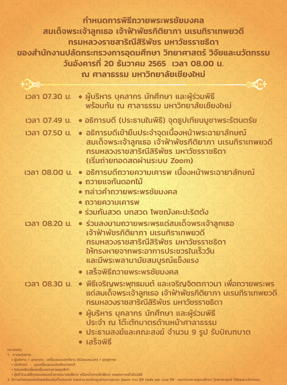 กำหนดการพิธีถวายพระพรชัยมงคล สมเด็จพระเจ้าลูกเธอ เจ้าฟ้าพัชรกิติยาภา นเรนทิราเทพยวดี กรมหลวงราชสาริณีสิริพัชร มหาวัชรราชธิดา