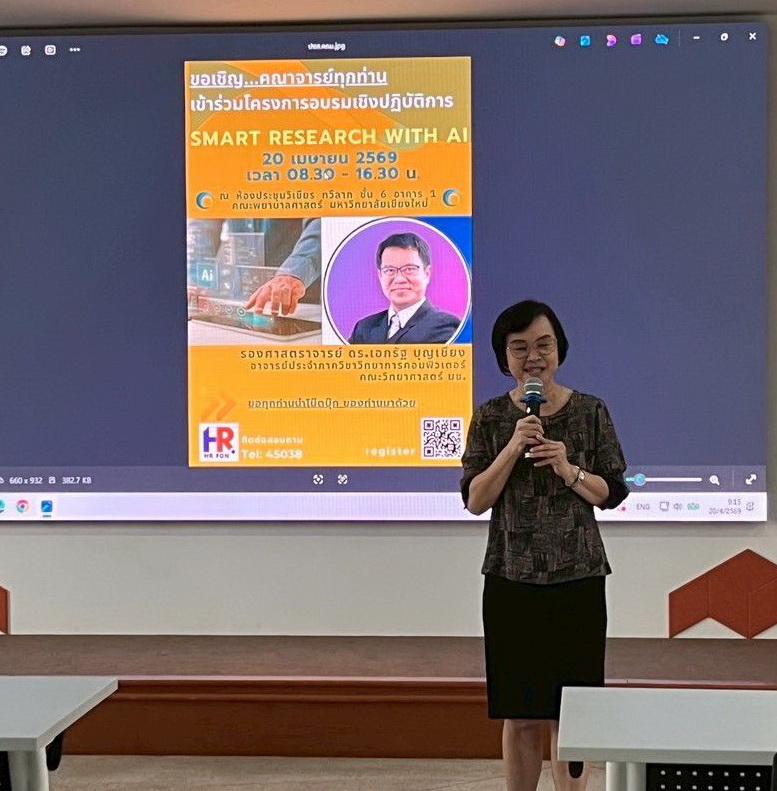 ผู้ช่วยศาสตราจารย์ ดร.สุภารัตน์ วังศรีคูณ คณบดีคณะพยาบาลศาสตร์ มหาวิทยาลัยเชียงใหม่ เป็นประธานกล่าวเปิดโครงการ 'Smart Research with AI' โดยมี รองศาสตราจารย์ ดร.เพชรสุนีย์ ทั้งเจริญกุล รองคณบดี กล่าวรายงาน วิทยากรรับเชิญ ได้แก่ รองศาสตราจารย์ ดร.เอกรัฐ บุญเชียง คณะวิทยาศาสตร์ มหาวิทยาลัยเชียงใหม่ เป้าหมายเพื่อให้คณาจารย์และนักวิจัยของคณะฯ ได้รับความรู้และทักษะด้านเทคโนโลยีดิจิทัลเพื่อดำเนินการวิจัย วิเคราะห์ข้อมูล สามารถต่อยอด สร้างสรรค์นวัตกรรม รวมทั้งนำไปใช้ในการทำผลงานวิจัยที่ตอบโจทย์ความต้องการของสังคมและชุมชนอย่างมีคุณภาพทันสมัย ณ ห้องประชุมวิเชียร ทวีลาภ อาคาร 1 เมื่อวันจันทร์ที่ 20 เมษายน 2569