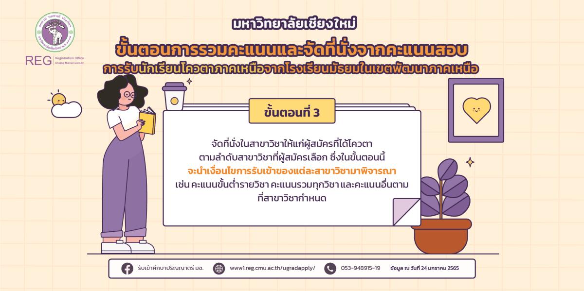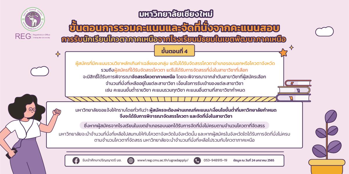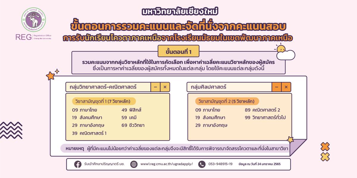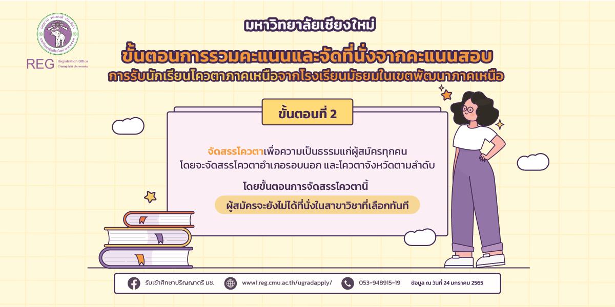ขั้นตอนการรวมคะแนนและจัดที่นั่งจากคะแนนสอบโดยสังเขป การรับสมัครคัดเลือกบุคคลเข้าศึกษาในมหาวิทยาลัยเชียงใหม่ ระดับปริญญาตรี ปีการศึกษา 2565 TCAS รอบที่ 2 แบบที่ 2 โควตา Quota (การรับนักเรียนโควตาภาคเหนือจากโรงเรียนมัธยมในเขตพัฒนาภาคเหนือ)