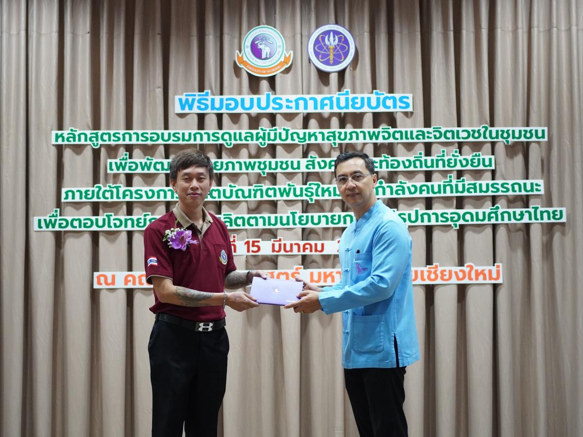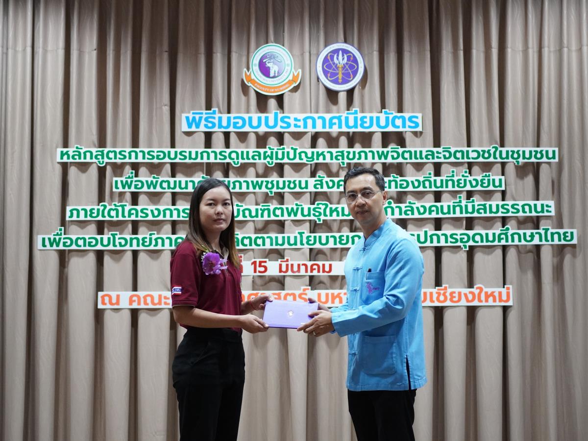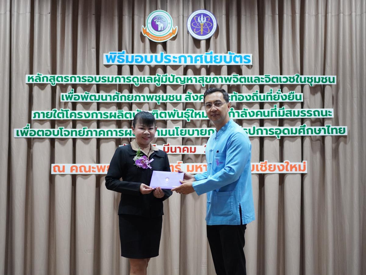 คณะพยาบาลศาสตร์ มหาวิทยาลัยเชียงใหม่ จัดพิธีปิดและมอบประกาศนียบัตรโครงการอบรมหลักสูตรการดูแลผู้มีปัญหาสุขภาพจิตและจิตเวชในชุมชน เพื่อพัฒนาศักยภาพชุมชน สังคมและท้องถิ่นที่ยั่งยืน (รุ่นที่ 2) ภายใต้โครงการผลิตบัณฑิตพันธุ์ใหม่และกำลังคนที่มีสมรรถนะเพื่อตอบโจทย์ภาคการผลิตตามนโยบายการปฏิรูปอุดมศึกษาไทย ประเภทประกาศนียบัตร (Non-Degree) โดยมี ผู้ช่วยศาสตราจารย์ ดร.ธานี แก้วธรรมานุกูล คณบดี เป็นประธานมอบและกล่าวแสดงความยินดี อาจารย์ ดร.หรรษา เศรษฐบุปผา ประธานคณะกรรมการบริหารหลักสูตรฯ กล่าวรายงาน ณ ห้องประชุมชั้น 5 อาคาร 4 คณะพยาบาลศาสตร์ เมื่อวันศุกร์ที่ 15 มีนาคม 2567