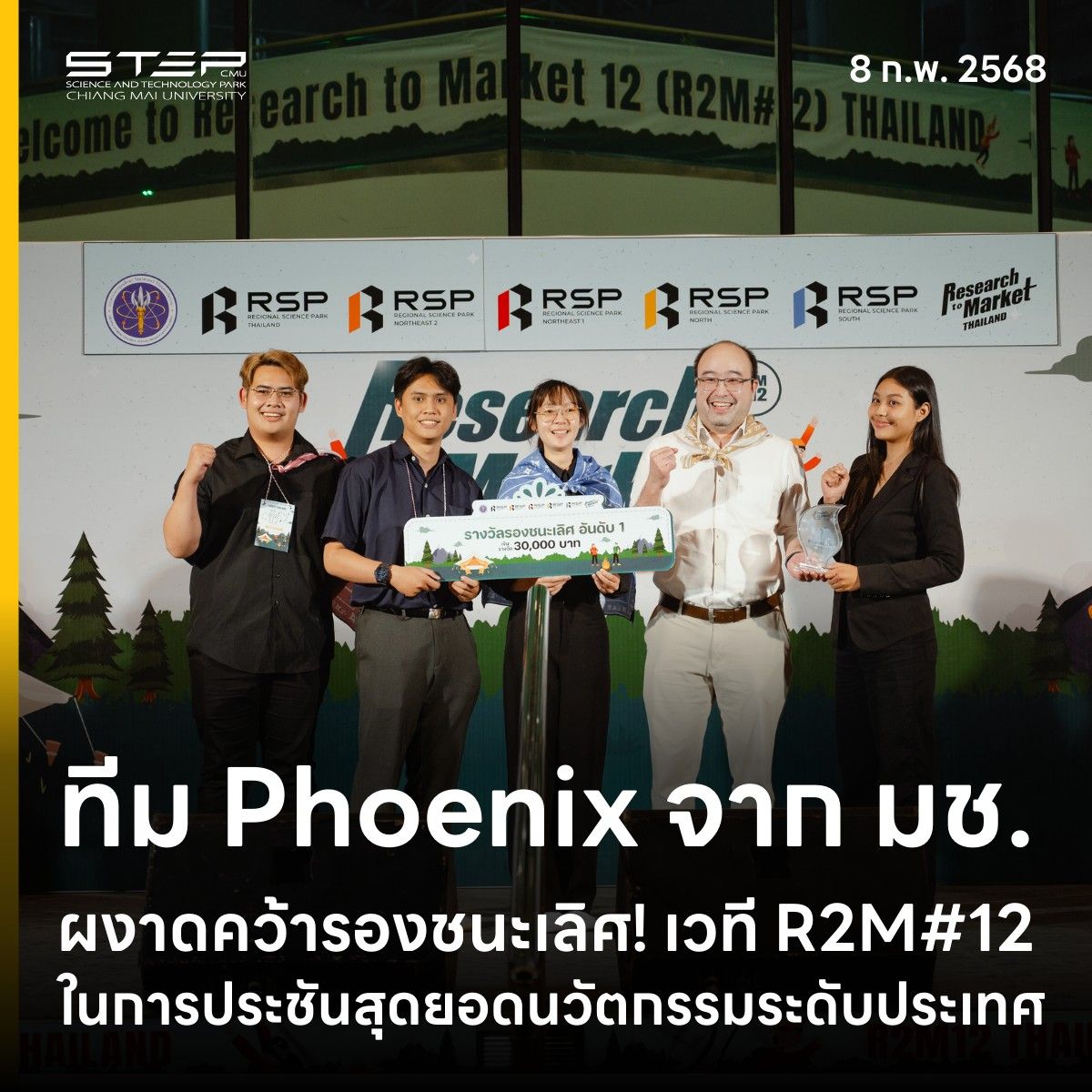 อุทยานวิทยาศาสตร์และเทคโนโลยี มหาวิทยาลัยเชียงใหม่ส่งทีมตัวแทนนักศึกษาจากมหาวิทยาลัยเชียงใหม่จำนวน 2 ทีม ได้แก่ทีม Phoenix และ ทีม MedTBac เข้าร่วมแข่งขัน "เส้นทางสู่นวัตวณิชย์" (Research to Market - R2M#12) ระดับประเทศ ที่รวบรวม 22 ทีมสุดแกร่งจาก 16 สถาบันทั่วประเทศ ซึ่งปีนี้จัดขึ้นในวันที่ 8 กุมภาพันธ์ 2568 ณ อุทยานวิทยาศาสตร์ภูมิภาค ภาคตะวันออกเฉียงเหนือ 2 และมีผลการแข่งขันดังนี้