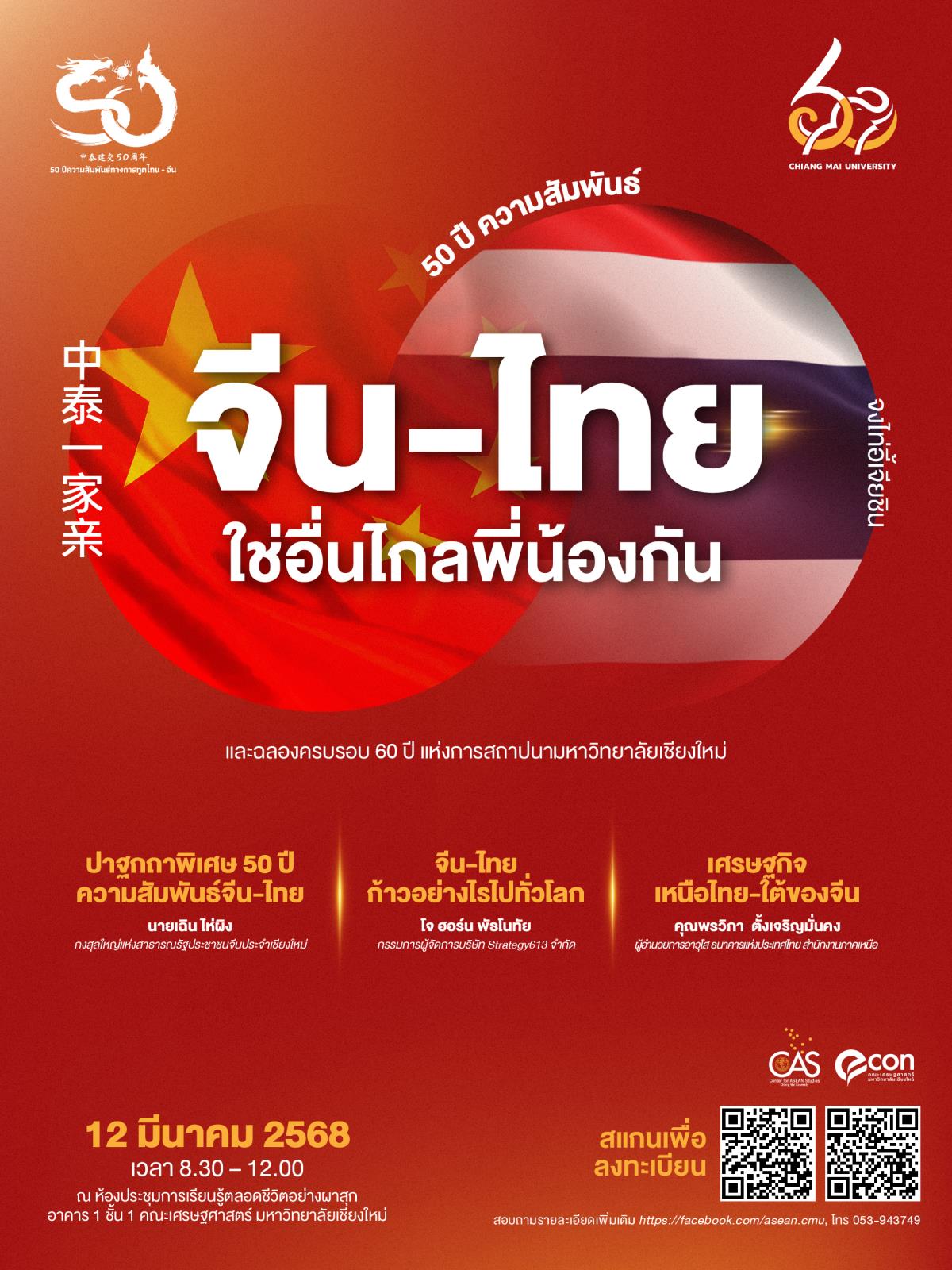 มช. ขอเชิญสัมมนา 50 ปี ความสัมพันธ์จีน-ไทย ใช่อื่นไกลพี่น้องกัน ฟังปาฐกถาพิเศษ เจาะลึกมิติทางการทูต เศรษฐกิจ และยุทธศาสตร์ กับสุดยอดวิทยากร