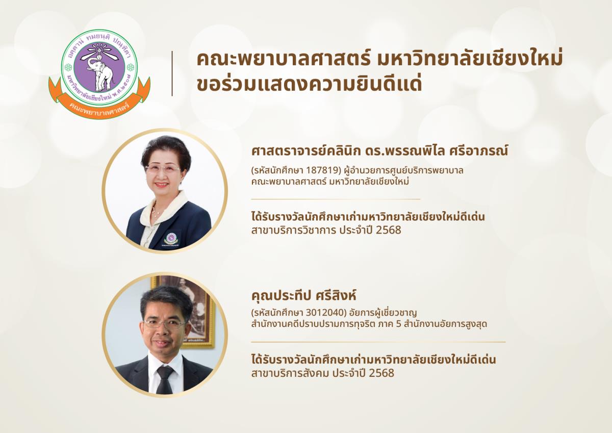 คณะพยาบาลศาสตร์ มหาวิทยาลัยเชียงใหม่ ขอร่วมแสดงความยินดีแด่ ศาสตราจารย์คลินิก ดร.พรรณพิไล ศรีอาภรณ์ (รหัสนักศึกษา 187819) ผู้อำนวยการศูนย์บริการพยาบาล คณะพยาบาลศาสตร์ มหาวิทยาลัยเชียงใหม่ ในโอกาสที่ได้รับรางวัลนักศึกษาเก่ามหาวิทยาลัยเชียงใหม่ดีเด่น สาขาบริการวิชาการ ประจำปี 2568 และ คุณประทีป ศรีสิงห์ (รหัสนักศึกษา 3012040) อัยการผู้เชี่ยวชาญ สำนักงานคดีปราบปรามการทุจริต ภาค 5 สำนักงานอัยการสูงสุด ในโอกาสที่ได้รับรางวัลนักศึกษาเก่ามหาวิทยาลัยเชียงใหม่ดีเด่น สาขาบริการสังคม ประจำปี 2568 จากสมาคมนักศึกษาเก่ามหาวิทยาลัยเชียงใหม่