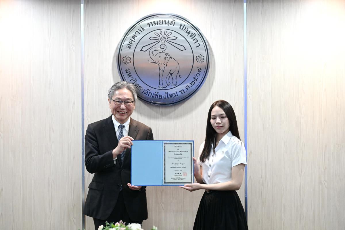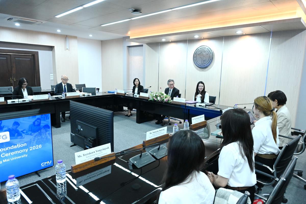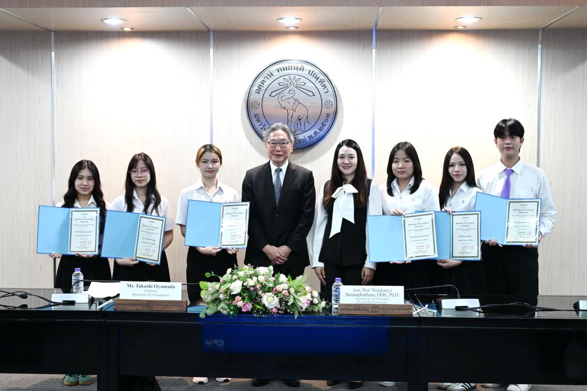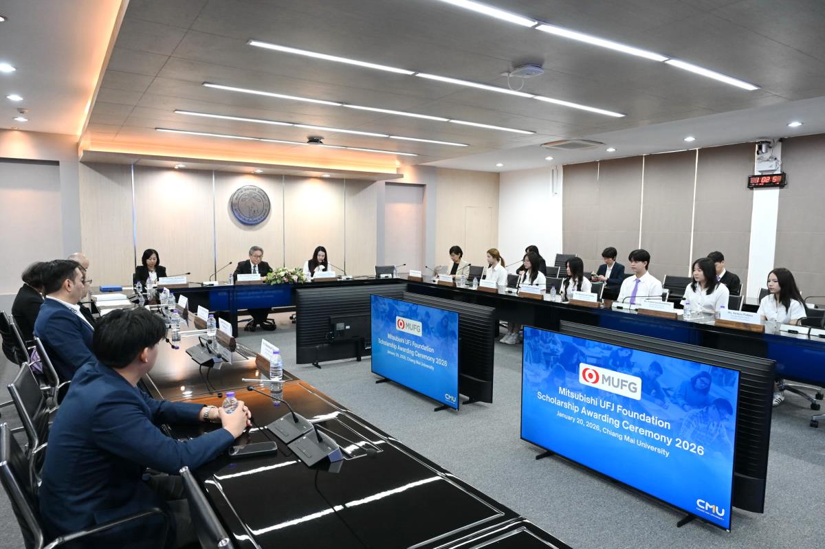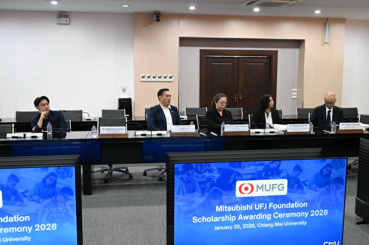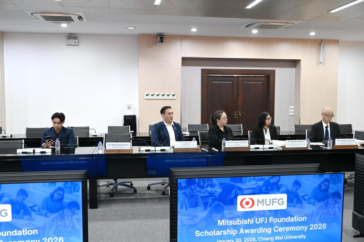 ผู้ช่วยศาสตราจารย์ ดร.ทพญ.วรกัญญา บูรณพัฒนา ผู้ช่วยอธิการบดี และคณะผู้บริหารมหาวิทยาลัยเชียงใหม่ ให้การต้อนรับ Mr. Takashi Omayada, Chairman Mitsubishi UFJ Foundation ในโอกาสที่มามอบทุนการศึกษา Mitsubishi UFJ Foundation Scholarship Awarding Ceremony 2026 ให้แก่คณะนักศึกษาคณะบริหารธุรกิจและคณะเศรษฐศาสตร์มหาวิทยาลัยเชียงใหม่ โดยมีคุณเสาวณีย์ รัตนกิจ ผู้บริหารฝ่ายกิจกรรมเพื่อสังคม ธนาคารกรุงศรีอยุธยา จำกัด (มหาชน) และผู้แทนจาก Mitsubishi UFJ Foundation ร่วมพิธีมอบทุน ณ ห้องประชุมพระยาศรีวิสารวาจา อาคารสำนักงานมหาวิทยาลัย 1 มหาวิทยาลัยเชียงใหม่ วันอังคารที่ 20 มกราคม พ.ศ. 2569