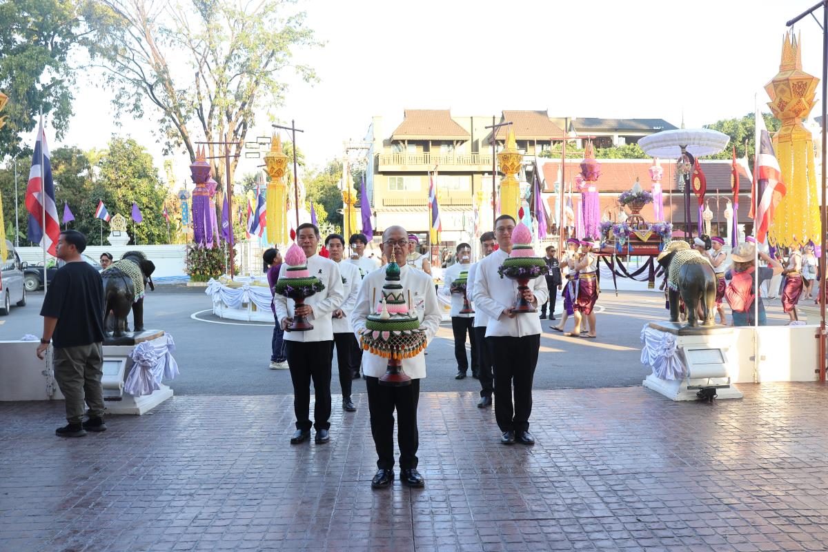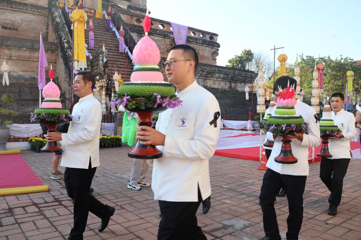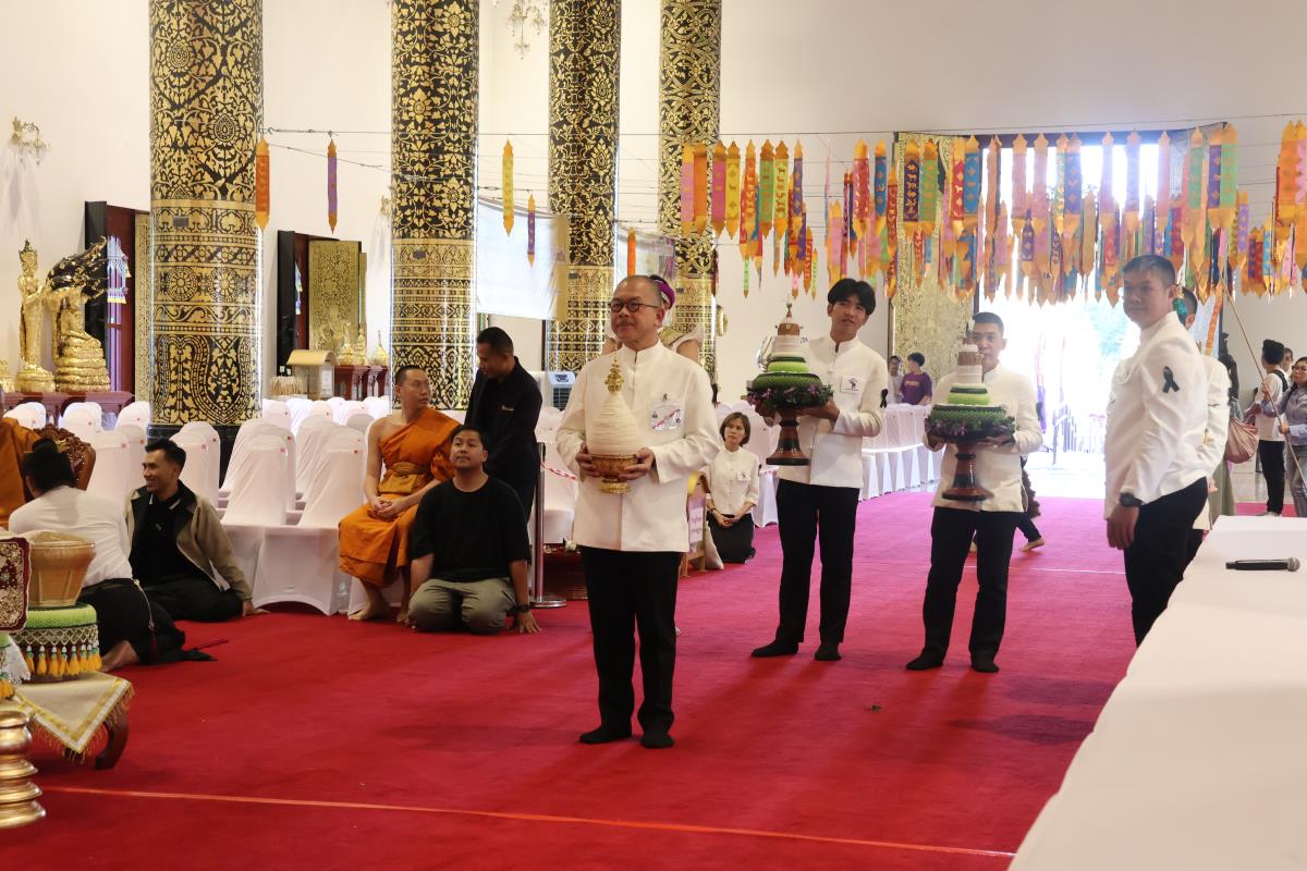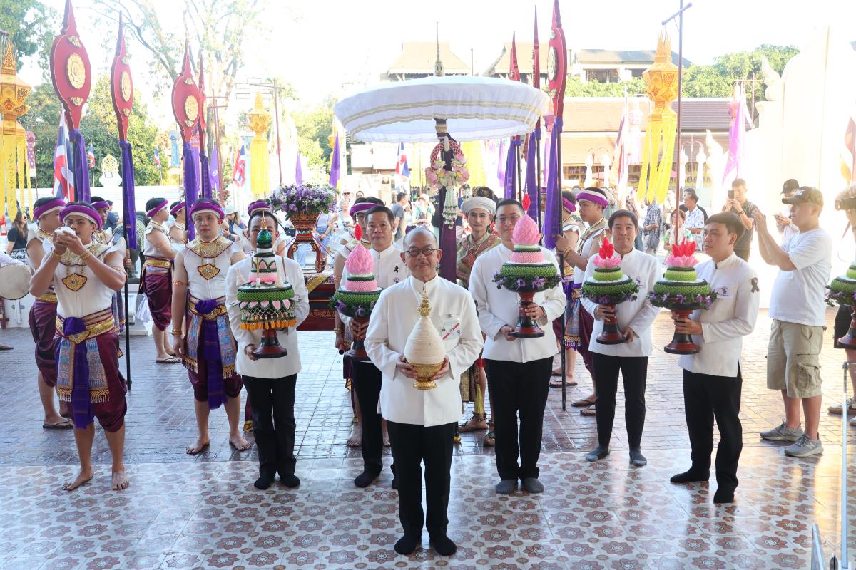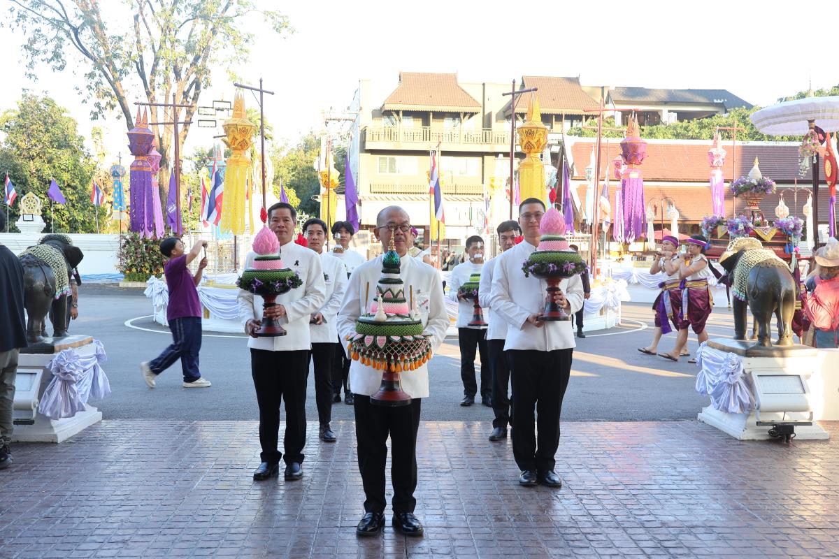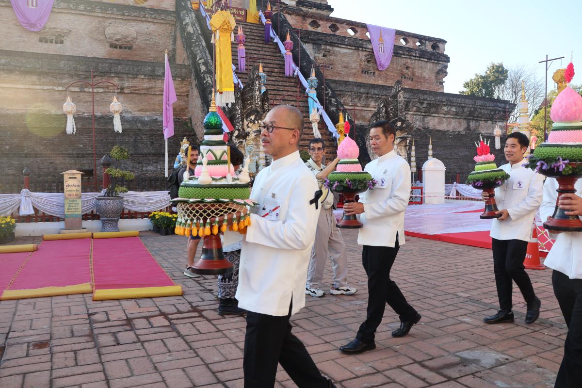 ศาสตราจารย์ปฏิบัติ ดร. เอกชัย มหาเอก รองอธิการบดี เป็นผู้แทนมหาวิทยาลัยเชียงใหม่ อันเชิญฝ้ายมงคลผูกข้อพระกร สมเด็จพระกนิษฐาธิราชเจ้า กรมสมเด็จพระเทพรัตนราชสุดาฯ สยามบรมราชกุมารี ในพิธีทูลพระขวัญ มหาวิทยาลัยเชียงใหม่ น้อมเกล้าจัดถวาย ณ วัดเจดีย์หลวงวรวิหาร สู่แท่นพิธี ภายในพระวิหารหลวง วัดเจดีย์หลวงวรวิหาร ในวันที่ 21 มกราคม 2568