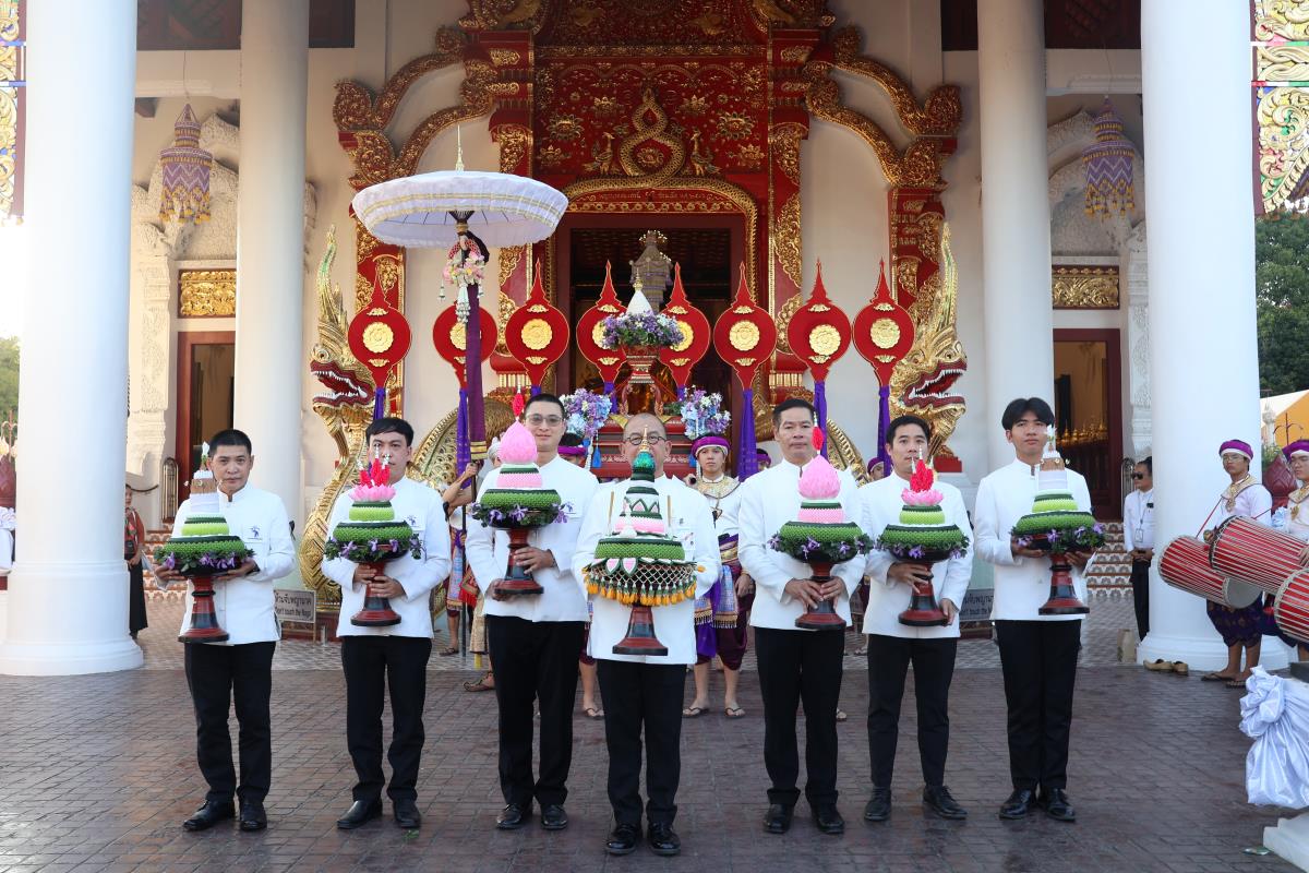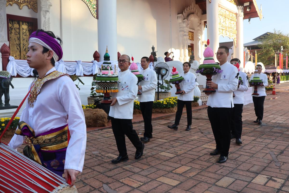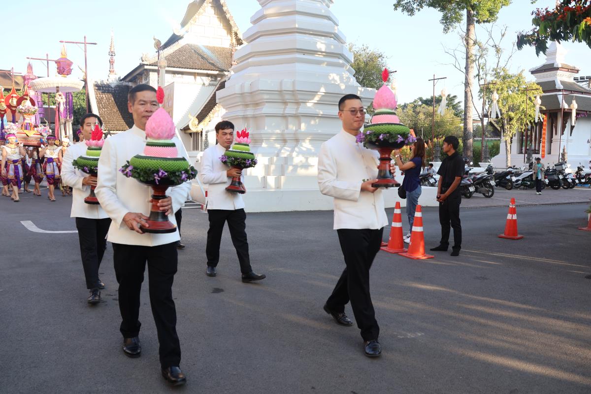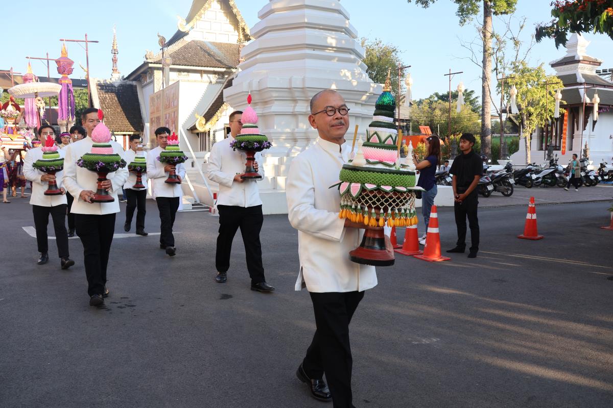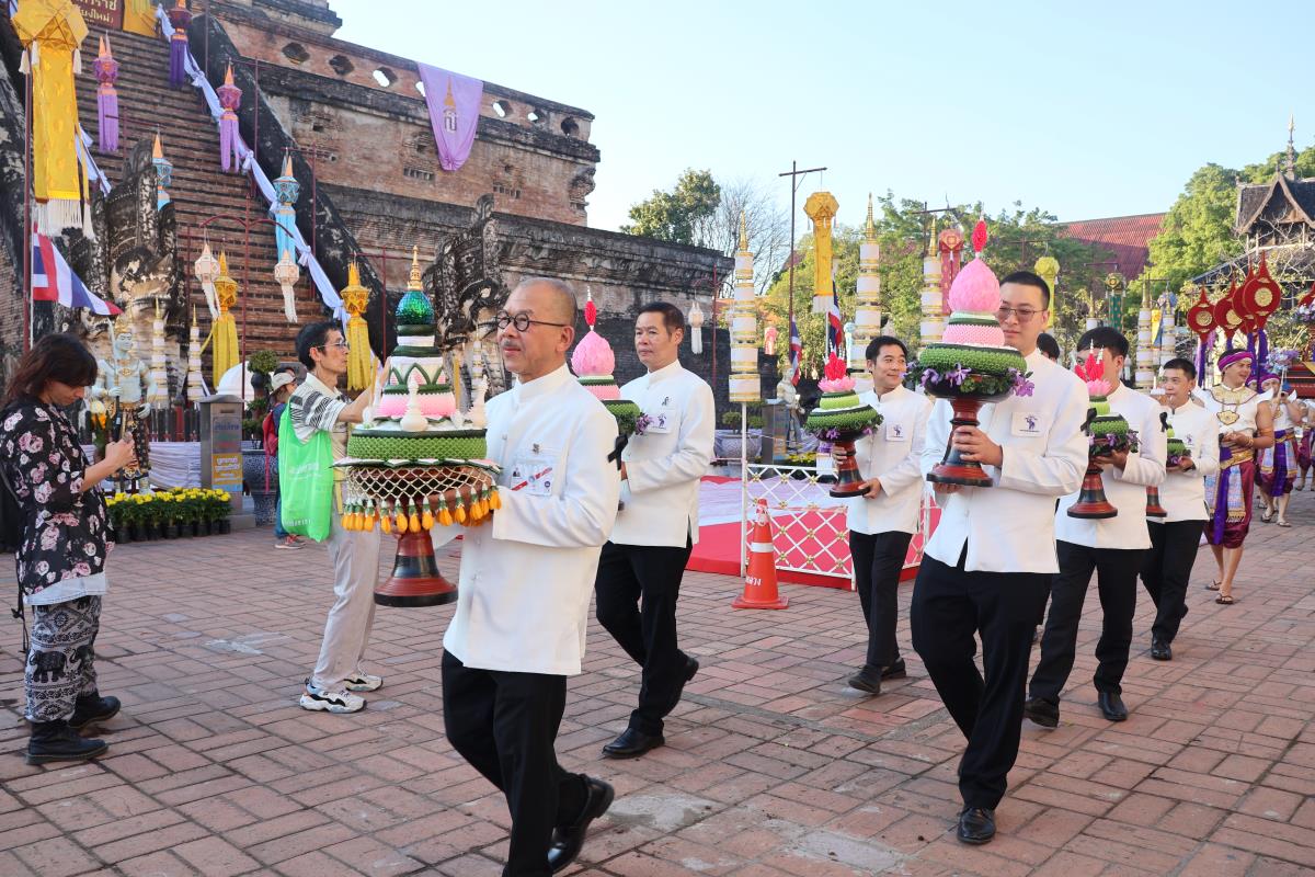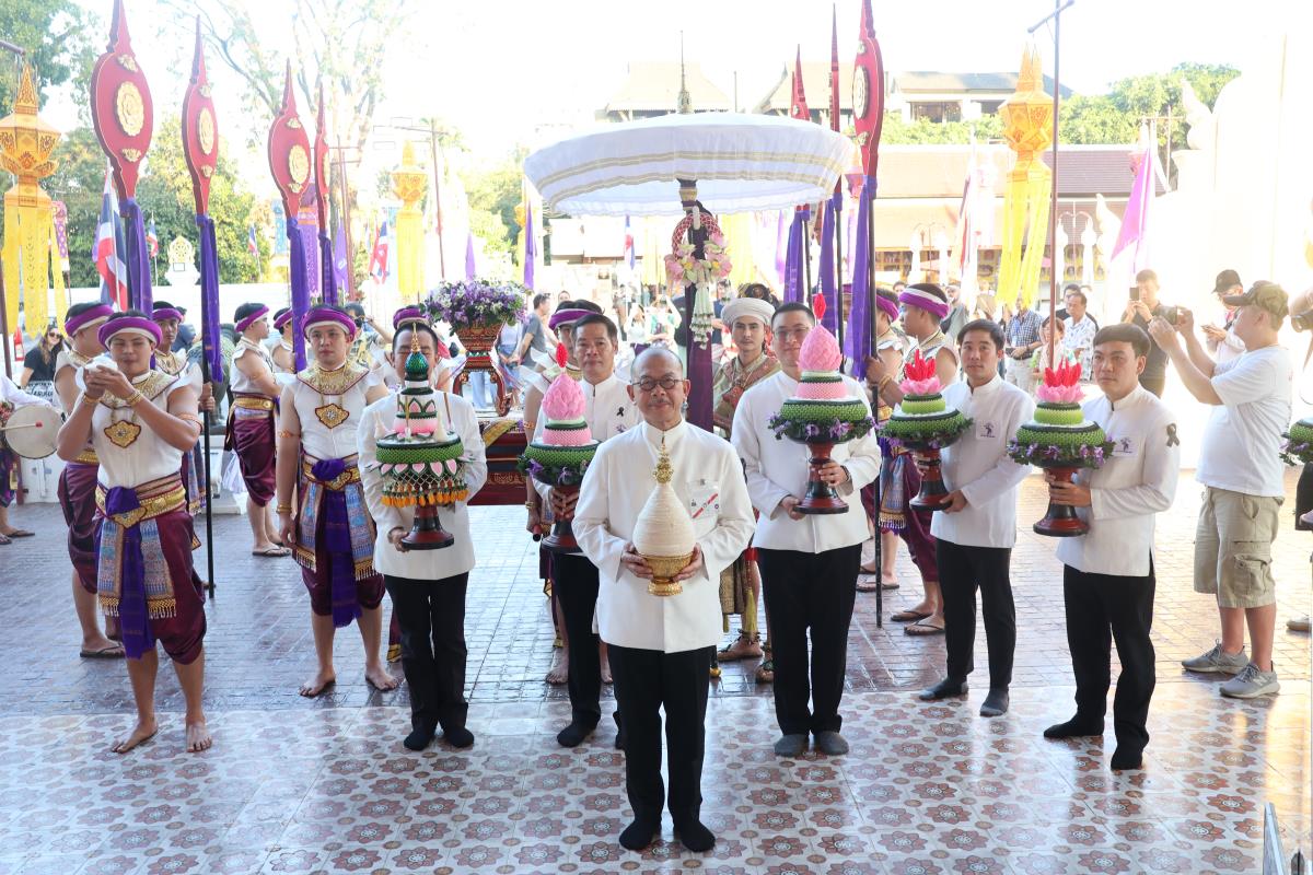 ศาสตราจารย์ปฏิบัติ ดร. เอกชัย มหาเอก รองอธิการบดี เป็นผู้แทนมหาวิทยาลัยเชียงใหม่ อันเชิญฝ้ายมงคลผูกข้อพระกร สมเด็จพระกนิษฐาธิราชเจ้า กรมสมเด็จพระเทพรัตนราชสุดาฯ สยามบรมราชกุมารี ในพิธีทูลพระขวัญ มหาวิทยาลัยเชียงใหม่ น้อมเกล้าจัดถวาย ณ วัดเจดีย์หลวงวรวิหาร สู่แท่นพิธี ภายในพระวิหารหลวง วัดเจดีย์หลวงวรวิหาร ในวันที่ 21 มกราคม 2568