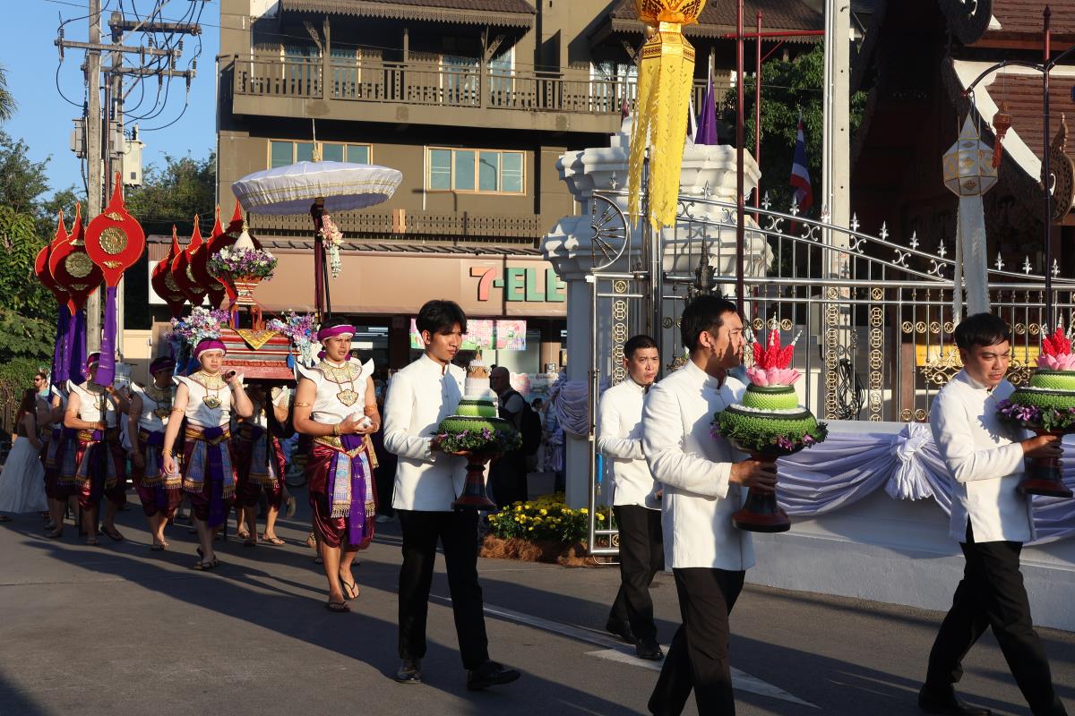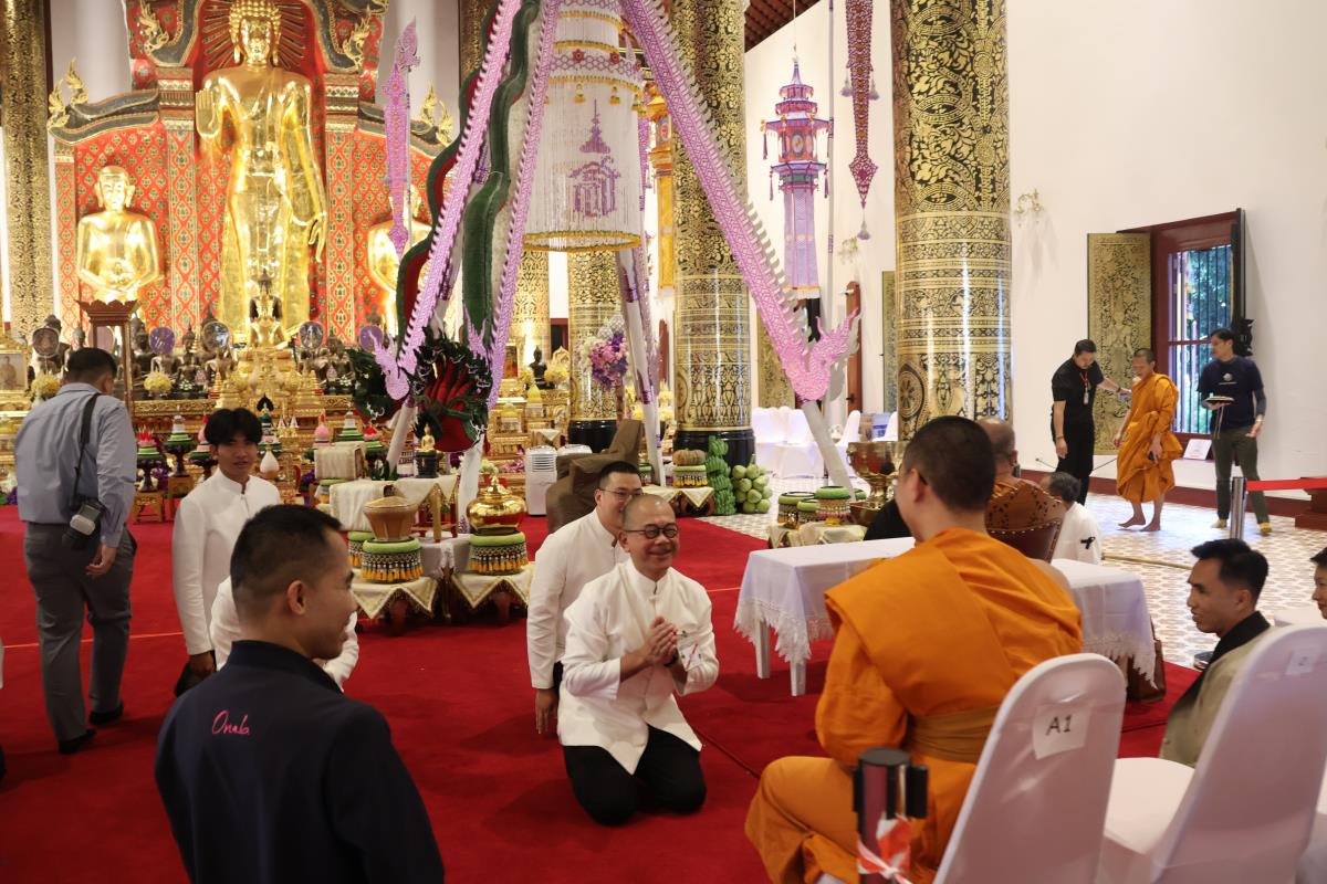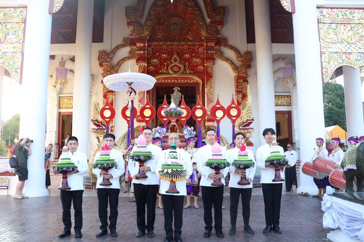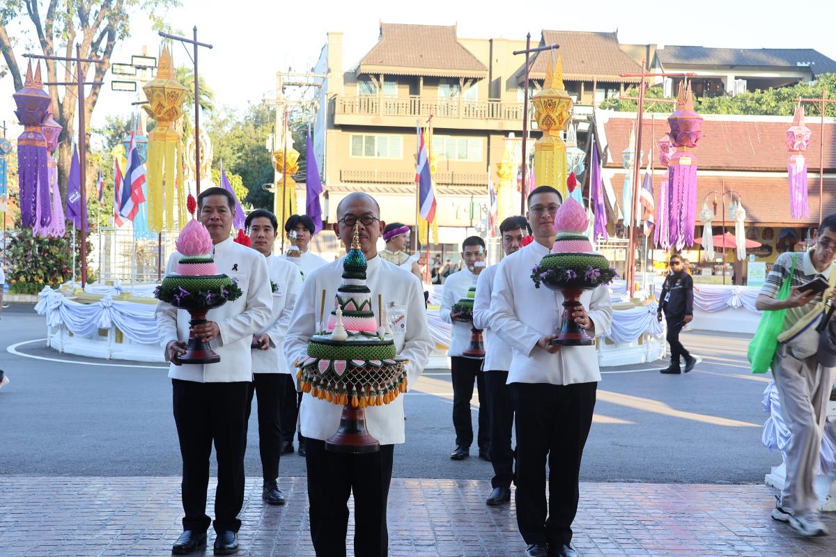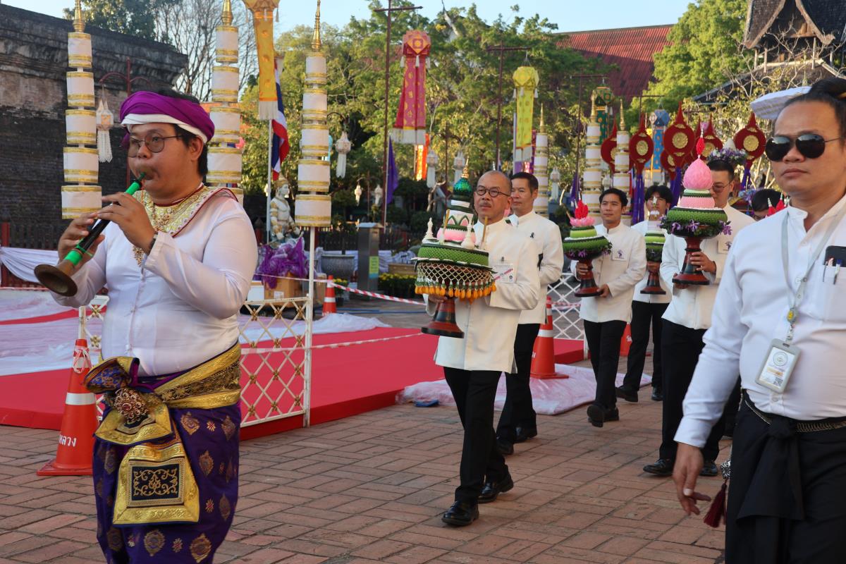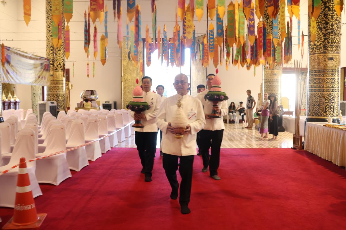 ศาสตราจารย์ปฏิบัติ ดร. เอกชัย มหาเอก รองอธิการบดี เป็นผู้แทนมหาวิทยาลัยเชียงใหม่ อันเชิญฝ้ายมงคลผูกข้อพระกร สมเด็จพระกนิษฐาธิราชเจ้า กรมสมเด็จพระเทพรัตนราชสุดาฯ สยามบรมราชกุมารี ในพิธีทูลพระขวัญ มหาวิทยาลัยเชียงใหม่ น้อมเกล้าจัดถวาย ณ วัดเจดีย์หลวงวรวิหาร สู่แท่นพิธี ภายในพระวิหารหลวง วัดเจดีย์หลวงวรวิหาร ในวันที่ 21 มกราคม 2568