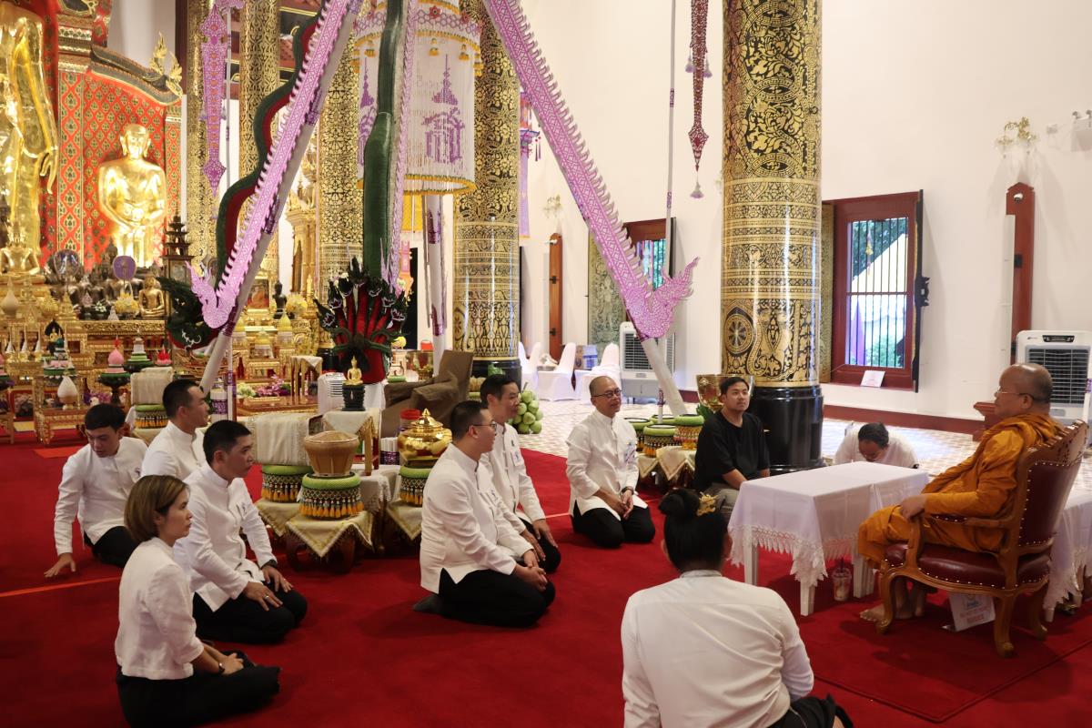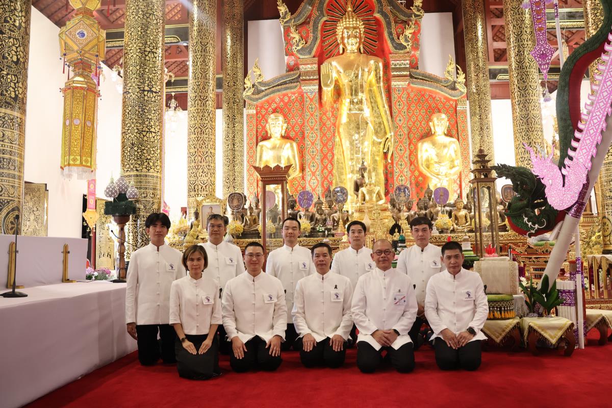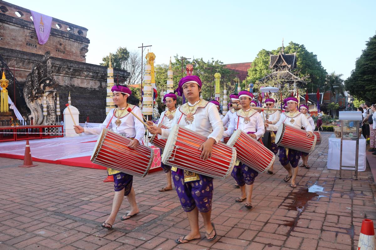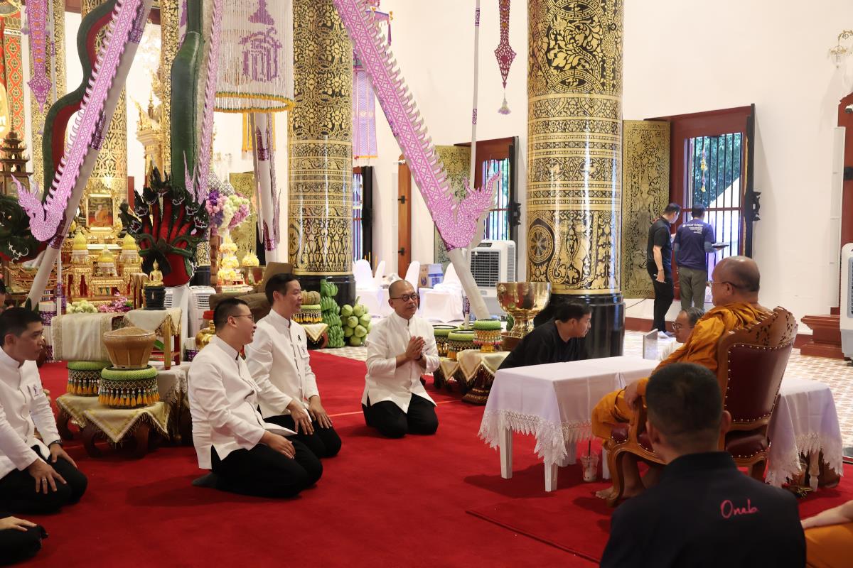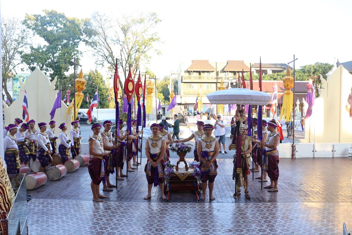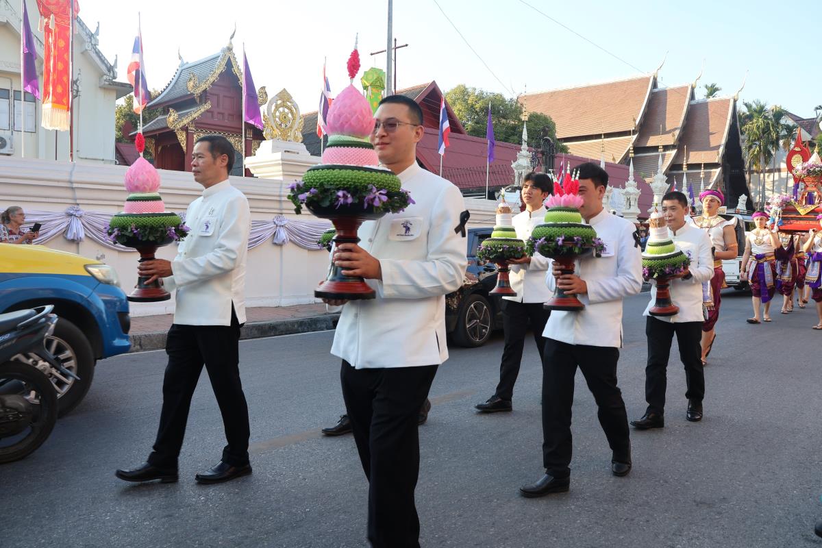 ศาสตราจารย์ปฏิบัติ ดร. เอกชัย มหาเอก รองอธิการบดี เป็นผู้แทนมหาวิทยาลัยเชียงใหม่ อันเชิญฝ้ายมงคลผูกข้อพระกร สมเด็จพระกนิษฐาธิราชเจ้า กรมสมเด็จพระเทพรัตนราชสุดาฯ สยามบรมราชกุมารี ในพิธีทูลพระขวัญ มหาวิทยาลัยเชียงใหม่ น้อมเกล้าจัดถวาย ณ วัดเจดีย์หลวงวรวิหาร สู่แท่นพิธี ภายในพระวิหารหลวง วัดเจดีย์หลวงวรวิหาร ในวันที่ 21 มกราคม 2568