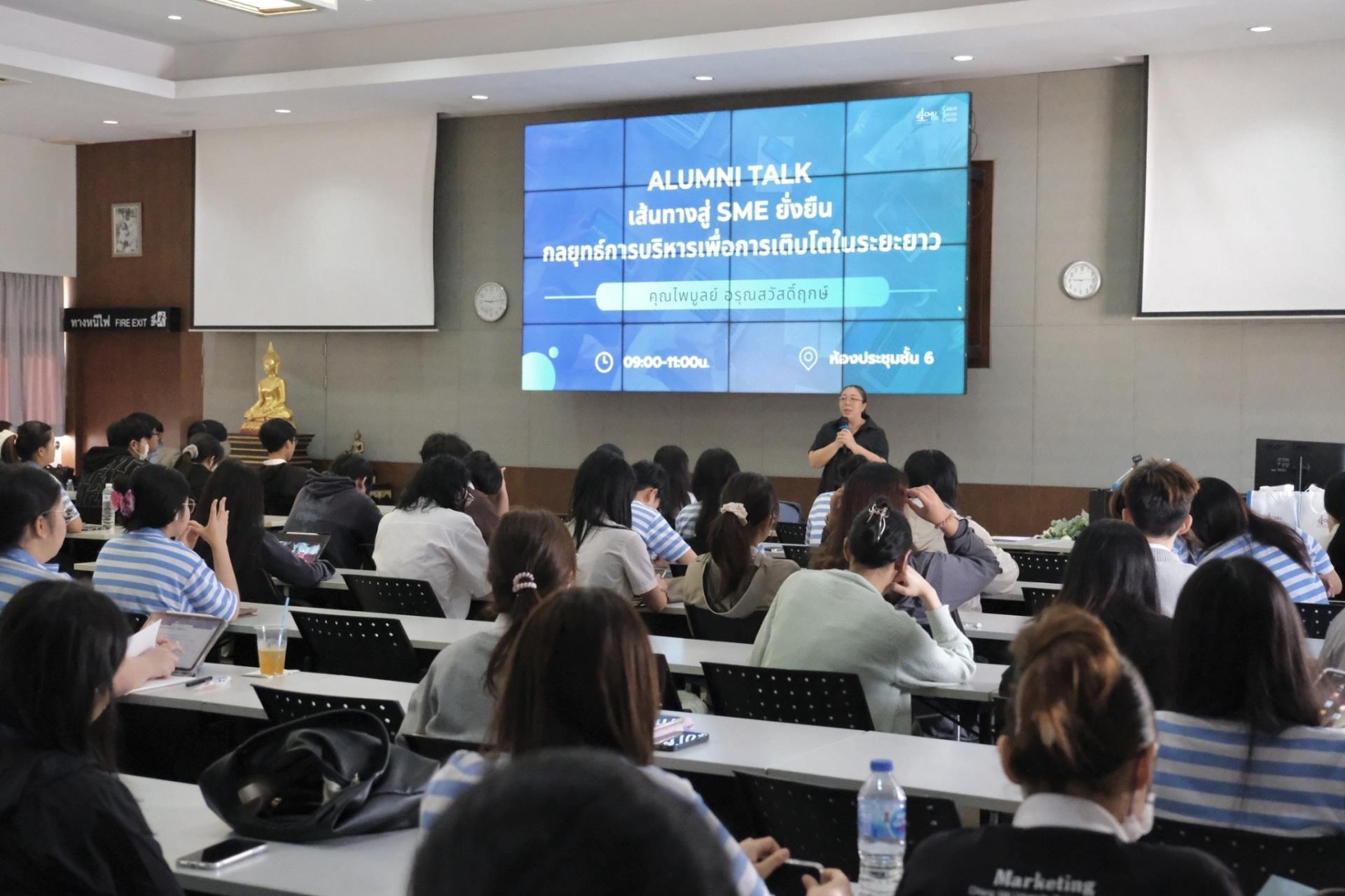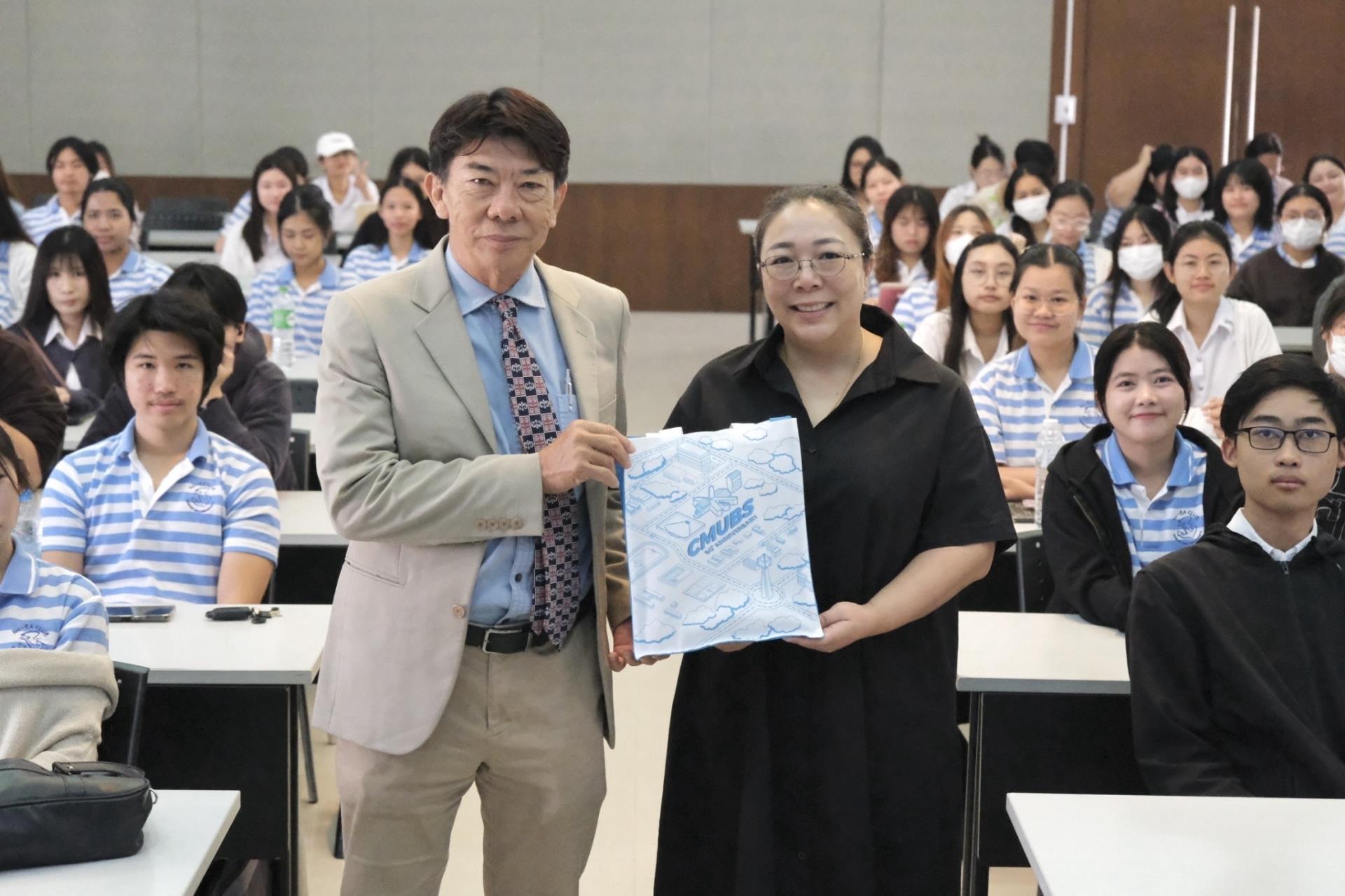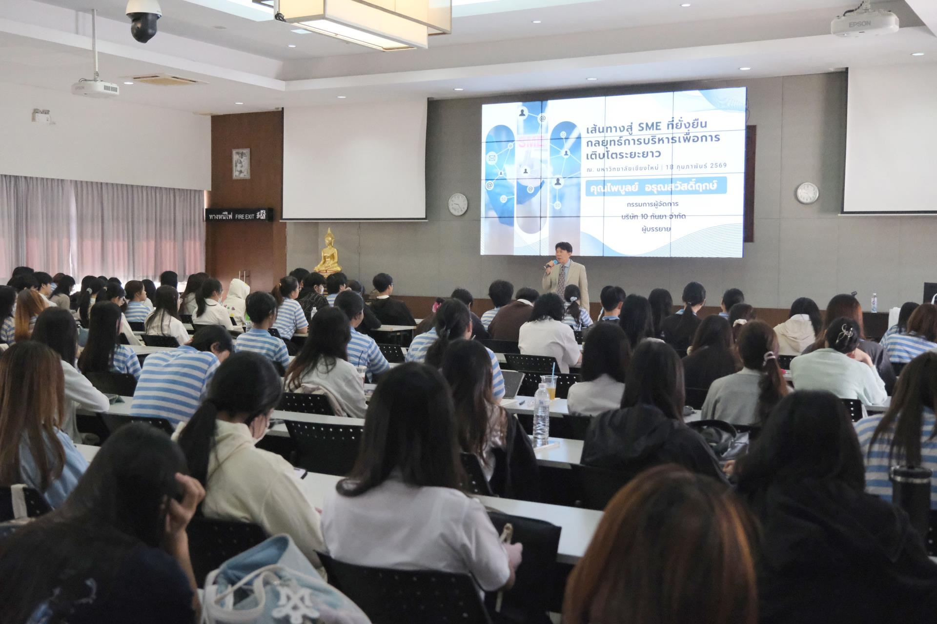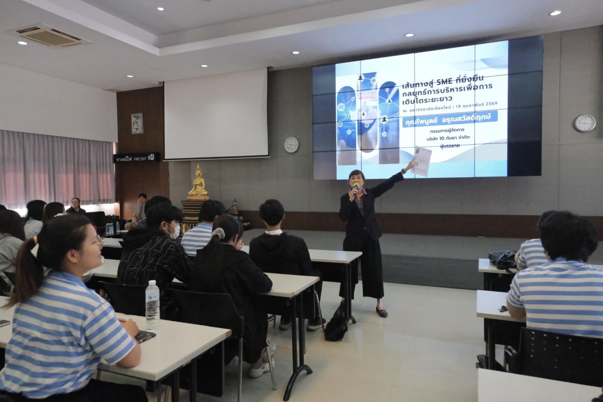 การบรรยายดังกล่าว ได้รับเกียรติจากคุณไพบูลย์ อรุณสวัสดิ์ฤกษ์ ศิษย์เก่าคณะบริหารธุรกิจ มหาวิทยาลัยเชียงใหม่ ปัจจุบันดำรงตำแหน่งกรรมการผู้จัดการบริษัท 10 กันยา จำกัด ร่วมถ่ายทอดประสบการณ์ด้านการดำเนินธุรกิจ SME อย่างรอบด้าน ทั้งด้านการเตรียมความพร้อม การปรับตัวให้ทันต่อการเปลี่ยนแปลงของเศรษฐกิจและพฤติกรรมผู้บริโภคในยุคปัจจุบัน ฯลฯ นอกจากนี้ยังมีการแลกเปลี่ยนมุมมองและตอบข้อซักถามจากนักศึกษาอย่างใกล้ชิด สร้างบรรยากาศการเรียนรู้เชิงโต้ตอบที่ช่วยเสริมทั้งแรงบันดาลใจและวิสัยทัศน์ทางธุรกิจ ซึ่งถือเป็นอีกหนึ่งกิจกรรมสำคัญที่ช่วยเตรียมความพร้อมให้นักศึกษาได้เห็นภาพเส้นทางอาชีพจริง และสามารถนำองค์ความรู้ที่ได้รับไปประยุกต์ใช้ในการพัฒนาศักยภาพตนเองและวางแผนอนาคตได้อย่างมีประสิทธิภาพ