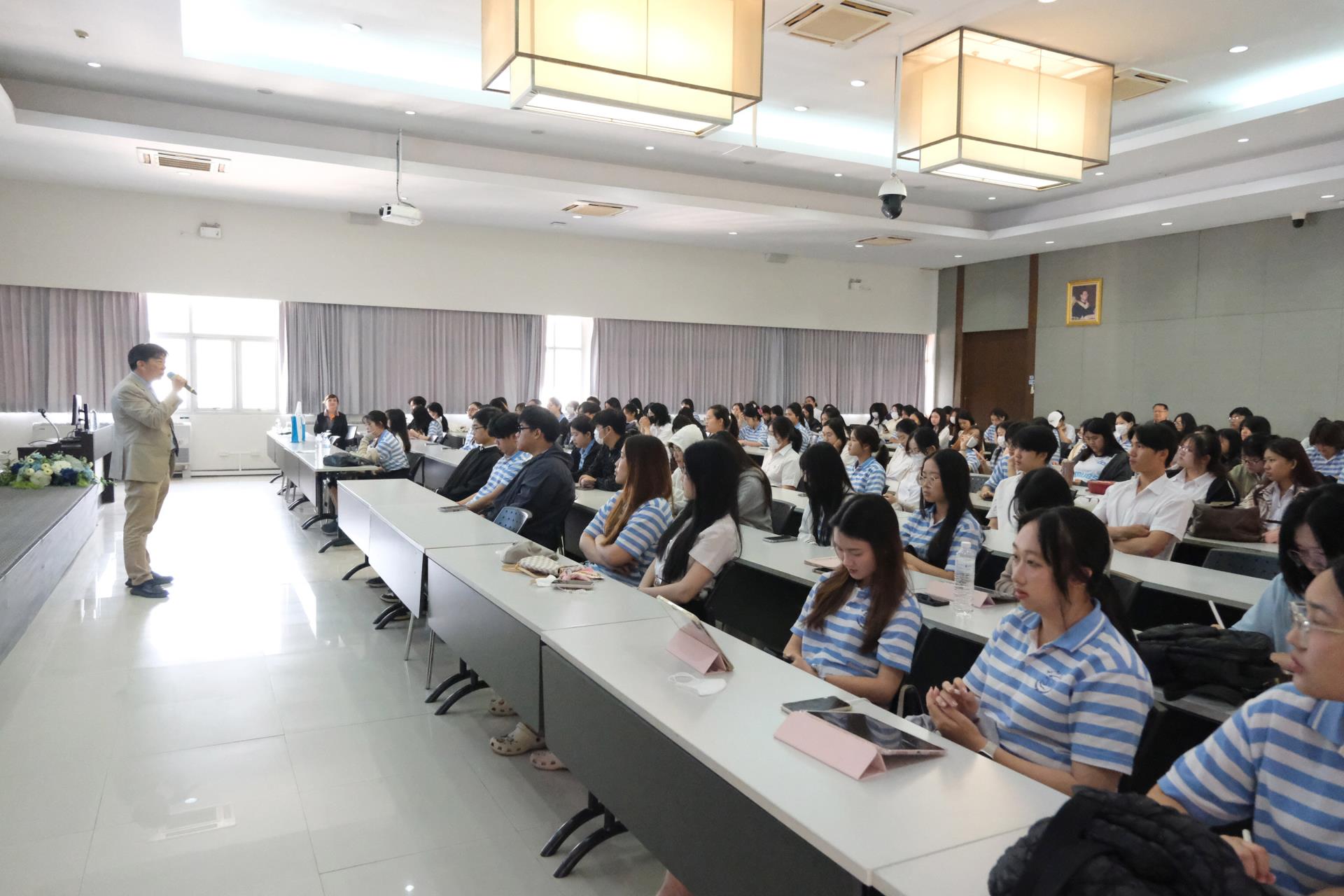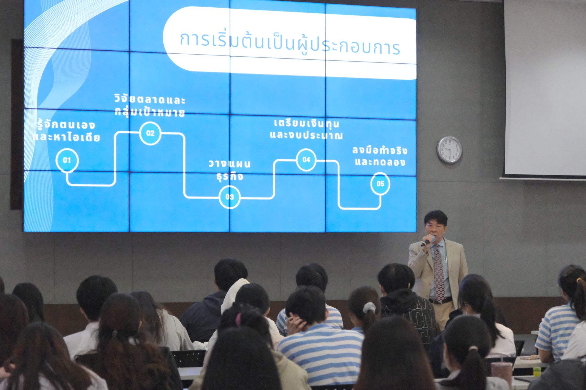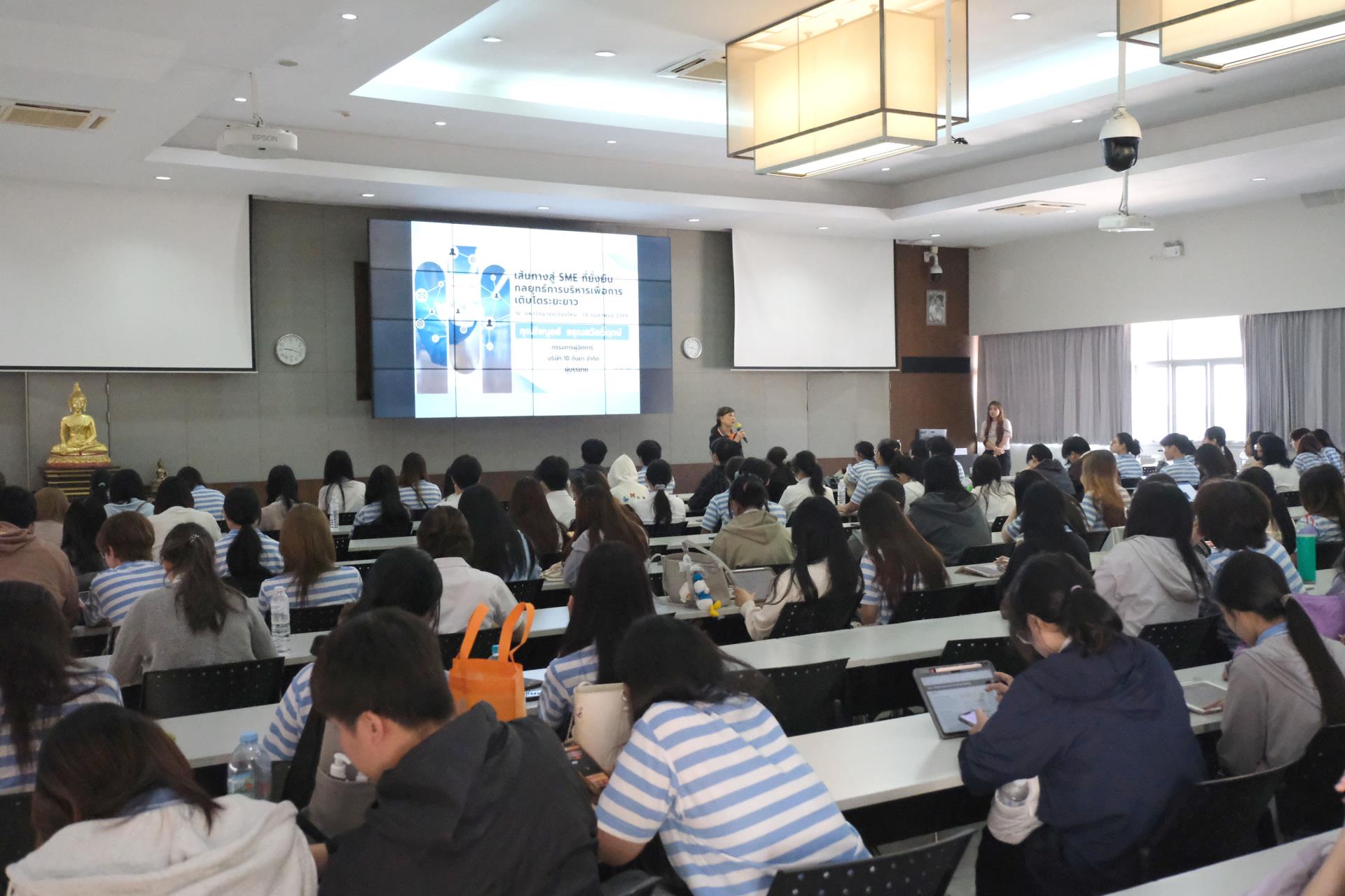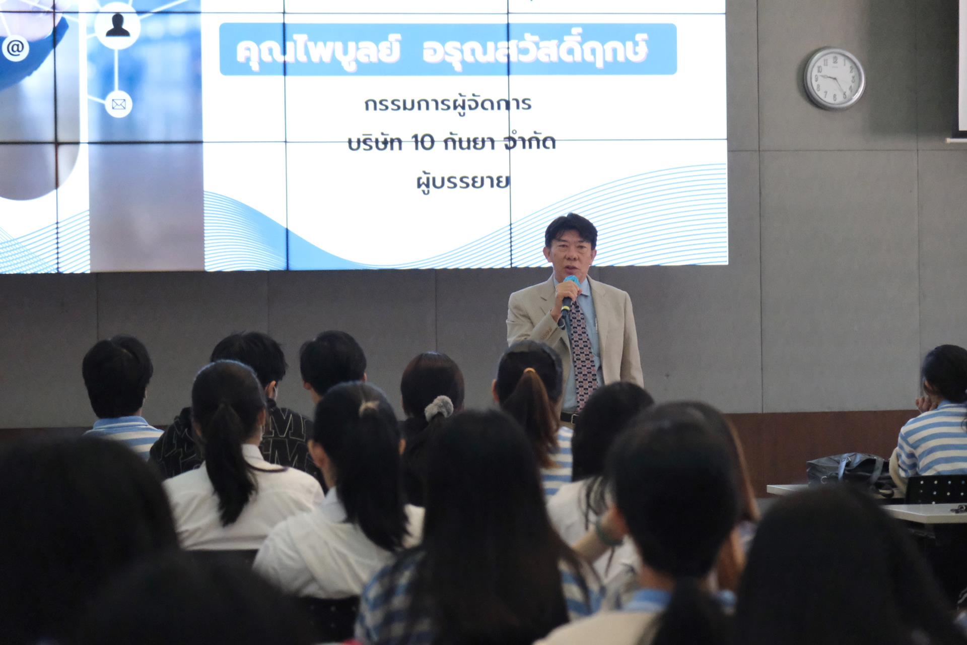 การบรรยายดังกล่าว ได้รับเกียรติจากคุณไพบูลย์ อรุณสวัสดิ์ฤกษ์ ศิษย์เก่าคณะบริหารธุรกิจ มหาวิทยาลัยเชียงใหม่ ปัจจุบันดำรงตำแหน่งกรรมการผู้จัดการบริษัท 10 กันยา จำกัด ร่วมถ่ายทอดประสบการณ์ด้านการดำเนินธุรกิจ SME อย่างรอบด้าน ทั้งด้านการเตรียมความพร้อม การปรับตัวให้ทันต่อการเปลี่ยนแปลงของเศรษฐกิจและพฤติกรรมผู้บริโภคในยุคปัจจุบัน ฯลฯ นอกจากนี้ยังมีการแลกเปลี่ยนมุมมองและตอบข้อซักถามจากนักศึกษาอย่างใกล้ชิด สร้างบรรยากาศการเรียนรู้เชิงโต้ตอบที่ช่วยเสริมทั้งแรงบันดาลใจและวิสัยทัศน์ทางธุรกิจ ซึ่งถือเป็นอีกหนึ่งกิจกรรมสำคัญที่ช่วยเตรียมความพร้อมให้นักศึกษาได้เห็นภาพเส้นทางอาชีพจริง และสามารถนำองค์ความรู้ที่ได้รับไปประยุกต์ใช้ในการพัฒนาศักยภาพตนเองและวางแผนอนาคตได้อย่างมีประสิทธิภาพ