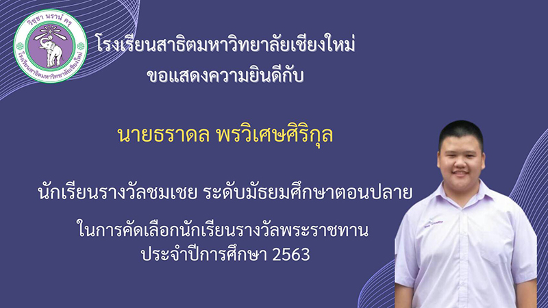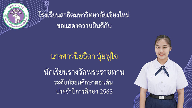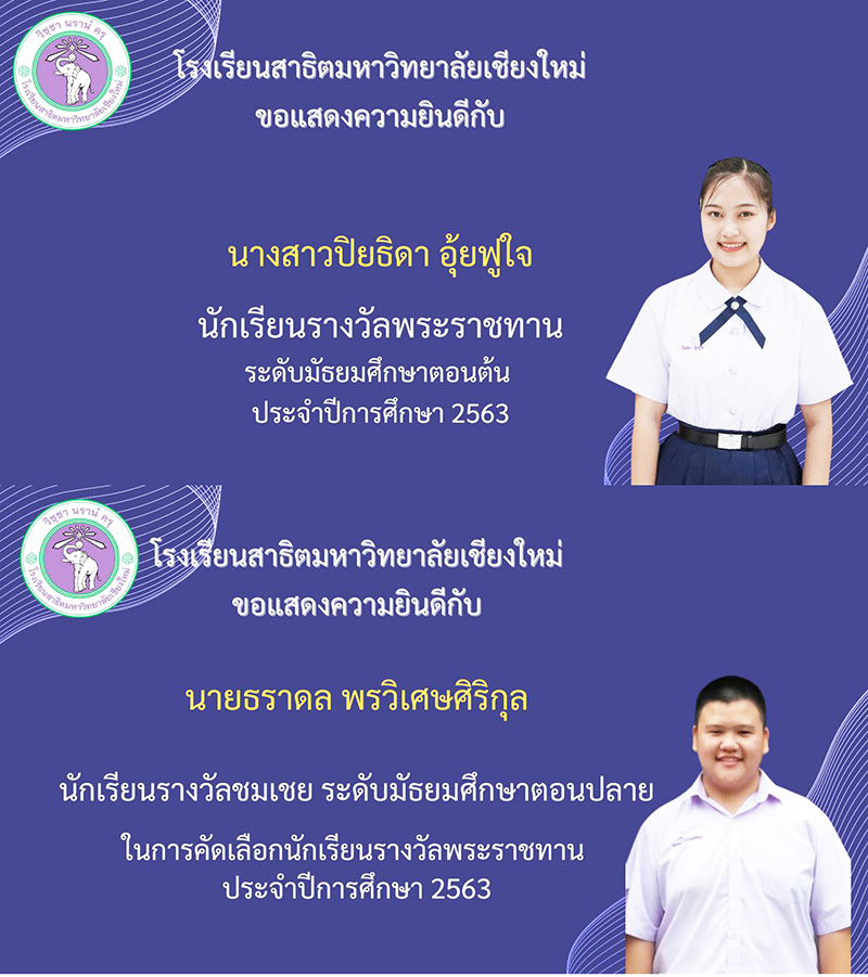 โรงเรียนสาธิต มหาวิทยาลัยเชียงใหม่ ขอแสดงความยินดีกับ นางสาวปิยธิดา อุ้ยฟูใจ นักเรียนรางวัลพระราชทาน ระดับมัธยมศึกษาตอนต้น ประจำปีการศึกษา 2563 และ นายธราดล พรวิเศษศิริกุล นักเรียนรางวัลชมเชย ระดับมัธยมศึกษาตอนปลาย ในการคัดเลือกนักเรียนเพื่อรับรางวัลพระราชทาน ประจำปีการศึกษา 2563 กลุ่มจังหวัดที่ 8 โรงเรียนขนาดกลาง