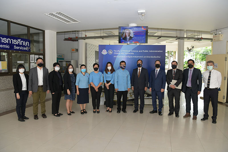 รองศาสตราจารย์โรม จิรานุกรม รองอธิการบดีมหาวิทยาลัยเชียงใหม่ พร้อมด้วยผู้ช่วยศาสตราจารย์ ดร.ปิติพงษ์ ยอดมงคล ผู้ช่วยอธิการบดี ร่วมต้อนรับนายไมเคิล ฮีธ อุปทูตรักษาการเอกอัครราชทูตสหรัฐอเมริกาประจำประเทศไทย และนายฌอน โอนีลส์ กงสุลใหญ่สหรัฐอเมริกาประจำเชียงใหม่ และคณะฯ ในโอกาสเดินทางมาเยี่ยมชม ห้องศูนย์ข้อมูลและวัฒนธรรมอเมริกัน (American Corner) คณะรัฐศาสตร์และรัฐประศาสนศาสตร์ มหาวิทยาลัยเชียงใหม่ โดยมี ผู้ช่วยศาสตราจารย์ ดร.ไพลิน ภู่จีนาพันธุ์ คณบดี พร้อมด้วยคณะผู้บริหารและเจ้าหน้าที่ ร่วมต้อนรับ ณ ห้องศูนย์ข้อมูลและวัฒนธรรมอเมริกัน (American Corner) ชั้น 1 คณะรัฐศาสตร์และรัฐประศาสนศาสตร์ เมื่อวันศุกร์ที่ 15 ตุลาคม พ.ศ. 2564