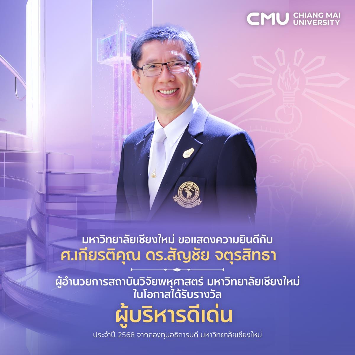 มหาวิทยาลัยเชียงใหม่ ประกาศผลการคัดเลือกผู้ได้รับรางวัลทรงคุณค่า “รางวัลผู้บริหารดีเด่น จากกองทุนอธิการบดีมหาวิทยาลัยเชียงใหม่ ประจำปี 2568” โดยผู้ได้รับรางวัลจะเข้ารับมอบรางวัลในวันคล้ายวันสถาปนามหาวิทยาลัยเชียงใหม่ ประจำปี 2568 วันที่ 24 มกราคม 2569 ณ ศาลาธรรม มหาวิทยาลัยเชียงใหม่