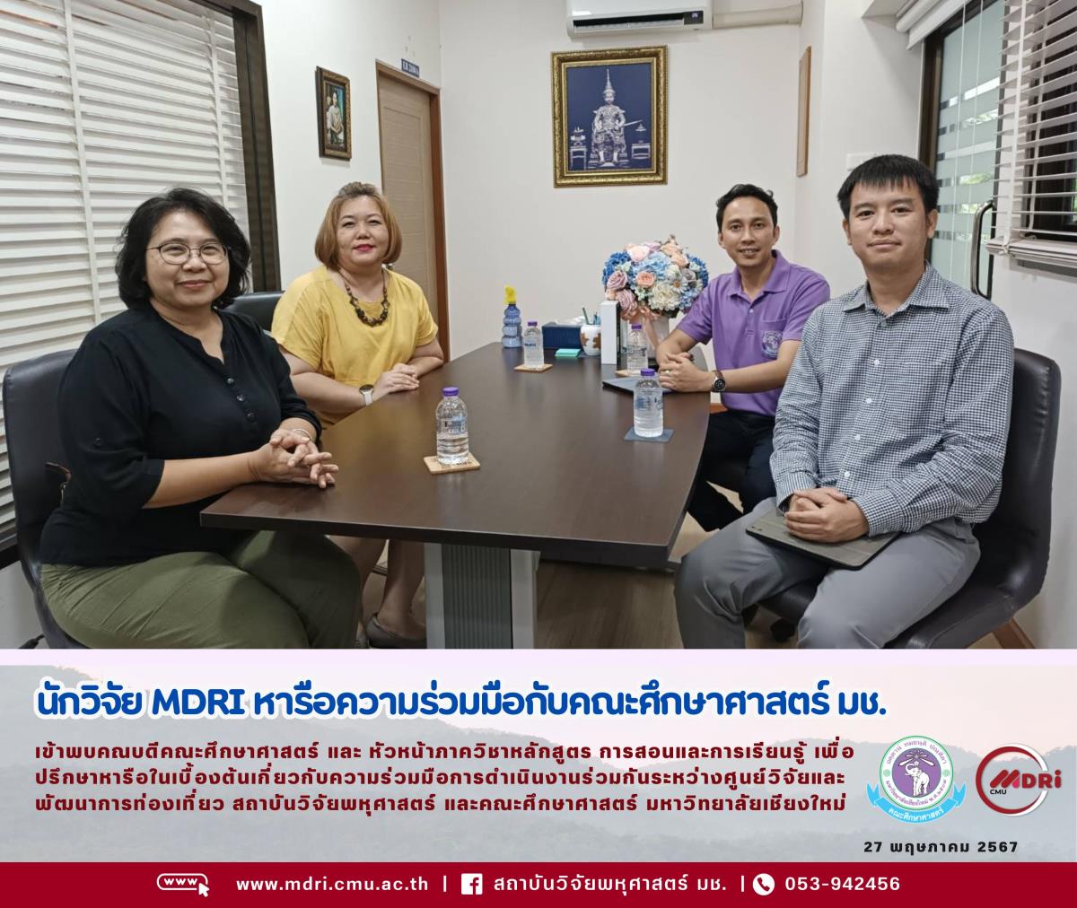 วันที่ 27 พฤษภาคม 2567 คุณธิตินัดดา จินาจันทร์ นักวิจัยประจำศูนย์วิจัยและพัฒนาการท่องเที่ยว สถาบันวิจัยพหุศาสตร์ มหาวิทยาลัยเชียงใหม่ พร้อมด้วยอาจารย์ณัฐพงษ์ ปัญจบุรี อาจารย์ประจำสาขาวิชาภาษาไทย ภาควิชาหลักสูตร การสอนและการเรียนรู้ เข้าพบผู้ช่วยศาสตราจารย์ ดร.ทิพย์รัตน์ นพฤทธิ์ คณบดีคณะศึกษาศาสตร์ และผู้ช่วยศาสตราจารย์ ดร.สิระ สมนาม หัวหน้าภาควิชาหลักสูตร การสอนและการเรียนรู้ เพื่อหารือในเบื้องต้นเกี่ยวกับความร่วมมือการดำเนินงานร่วมกันระหว่างศูนย์วิจัยและพัฒนาการท่องเที่ยว สถาบันวิจัยพหุศาสตร์ และคณะศึกษาศาสตร์ ในด้านการผลิตสื่อวัฒนธรรมและการท่องเที่ยว และความร่วมมือด้านการวิจัยในอนาคต