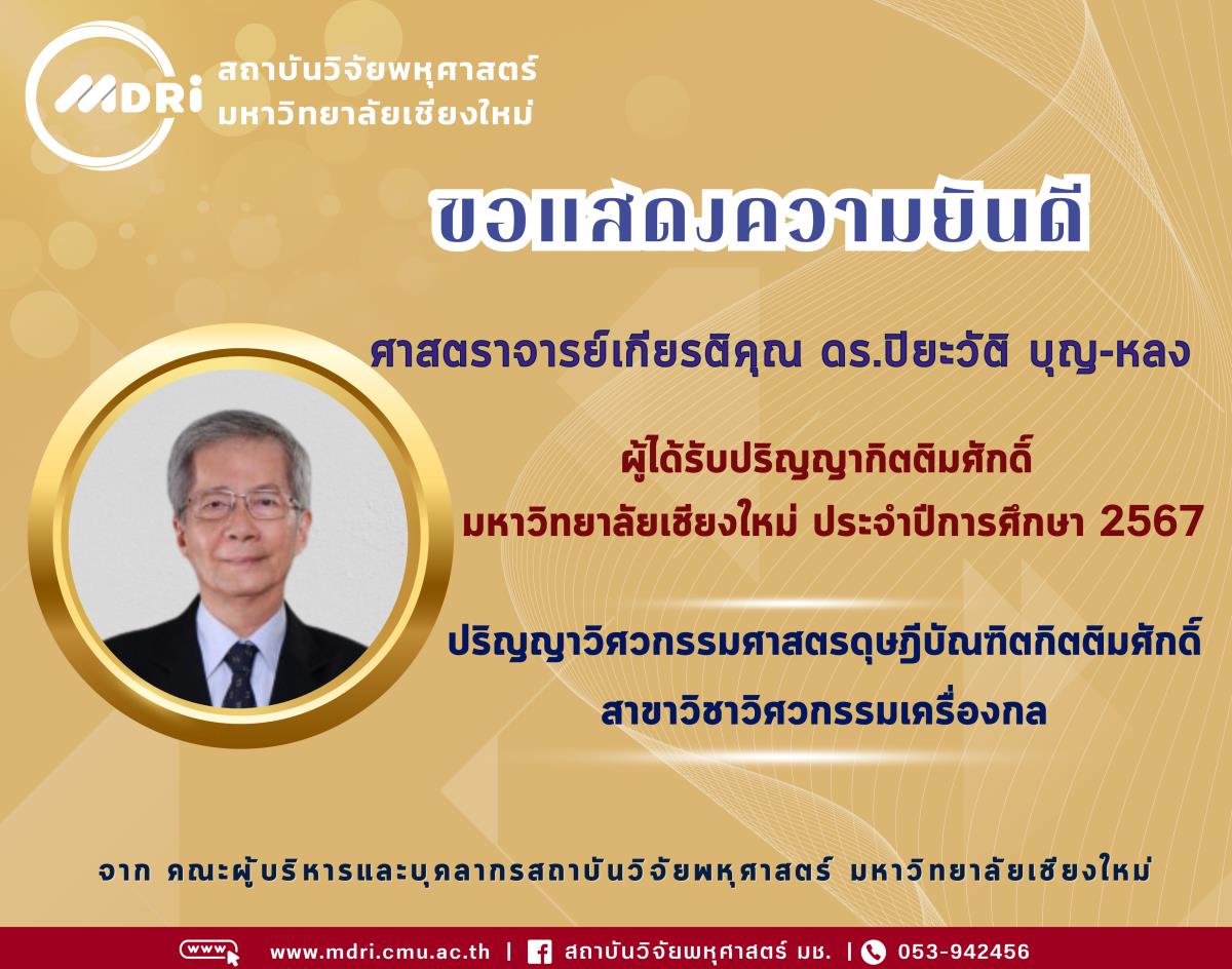 ศาสตราจารย์เกียรติคุณ ดร.สัญชัย จตุรสิทธา ผู้อำนวยการสถาบันวิจัยพหุศาสตร์ มหาวิทยาลัยเชียงใหม่ พร้อมด้วยผู้บริหารและผู้แทนบุคลากร ร่วมแสดงความยินดีในโอกาสที่ ศาสตราจารย์เกียรติคุณ ดร.ปิยะวัติ บุญ-หลง ได้รับพระราชทานปริญญากิตติมศักดิ์ "วิศวกรรมศาสตรดุษฎีบัณฑิตกิตติมศักดิ์ สาขาวิชาวิศวกรรมเครื่องกล" ของมหาวิทยาลัยเชียงใหม่