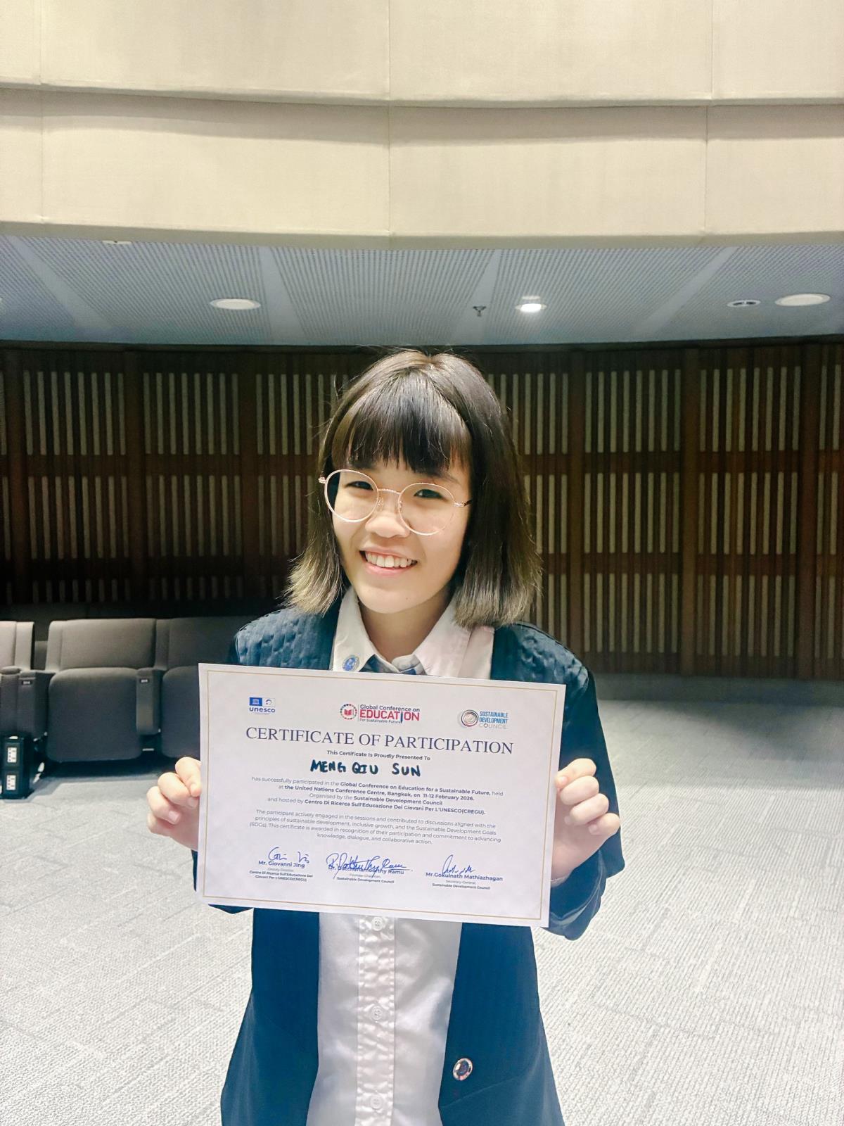 Meng Qui Sun, a first-year student in the Bachelor of Science Program in Sustainability Science, has been selected to participate in the Global Conference on Education for a Sustainable Future (GCE 2026), held on 11–12 February 2026 at the United Nations Conference Centre, Bangkok.