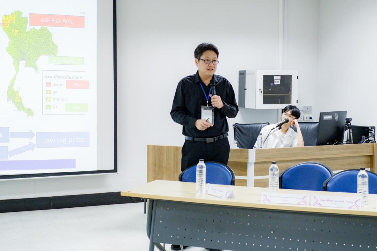 โอกาสนี้ ผศ.ดร.น.สพ.เทิดศักดิ์ ได้ร่วมอภิปรายในประเด็นสำคัญเกี่ยวกับ “เชื้อโรคสัตว์ข้ามแดน” โดยยกกรณีศึกษา โรคอหิวาต์แอฟริกาในสุกร (African Swine Fever: It is not only a pig disease) เพื่อสะท้อนให้เห็นถึงการให้ความสำคัญการโรคระบาดในสัตว์ ที่ไม่เพียงส่งผลต่อภาคปศุสัตว์และเศรษฐกิจเท่านั้น หากยังเชื่อมโยงกับความมั่นคงด้านอาหาร สุขภาพของมนุษย์ การเคลื่อนย้ายข้ามพรมแดน รวมถึงปัญหาสิ่งแวดล้อมและมลพิษที่ไม่อาจจำกัดอยู่ภายในประเทศใดประเทศหนึ่ง นอกจากนี้ ยังได้แลกเปลี่ยนมุมมองร่วมกับนักวิชาการจากหลากหลายสาขาในประเด็น ผู้ป่วยข้ามแดนและมลพิษข้ามแดน ซึ่งสะท้อนความซับซ้อนของวิกฤตสุขภาพและสิ่งแวดล้อมในโลกปัจจุบัน ที่จำเป็นต้องอาศัยความร่วมมือเชิงนโยบายและองค์ความรู้แบบสหวิทยาการ
