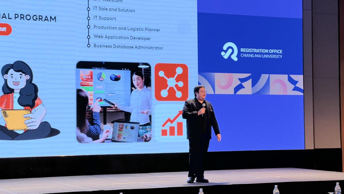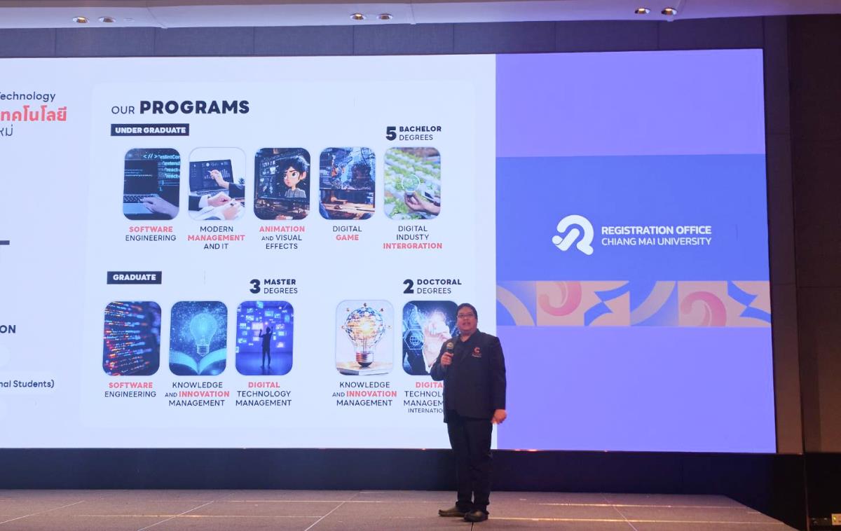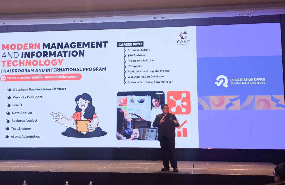 ภายในงาน รองศาสตราจารย์ ดร.ภาสิทธิ์ เจริญขวัญ ประธานสาขาวิชาการจัดการสมัยใหม่และเทคโนโลยีสารสนเทศ ได้ให้เกียรติเป็นผู้แทนวิทยาลัยฯ ในการประชาสัมพันธ์ข้อมูลหลักสูตรและเกณฑ์การรับเข้าศึกษา โดยเน้นย้ำถึงความพร้อมของวิทยาลัยฯ ในการผลิตบัณฑิตที่มีทักษะแห่งอนาคต เพื่อรองรับการเปลี่ยนแปลงของอุตสาหกรรมดิจิทัล ในวันที่ 29 มกราคม 2569 ณ โรงแรมเชียงใหม่ แมริออท โฮเทล จ.เชียงใหม่
