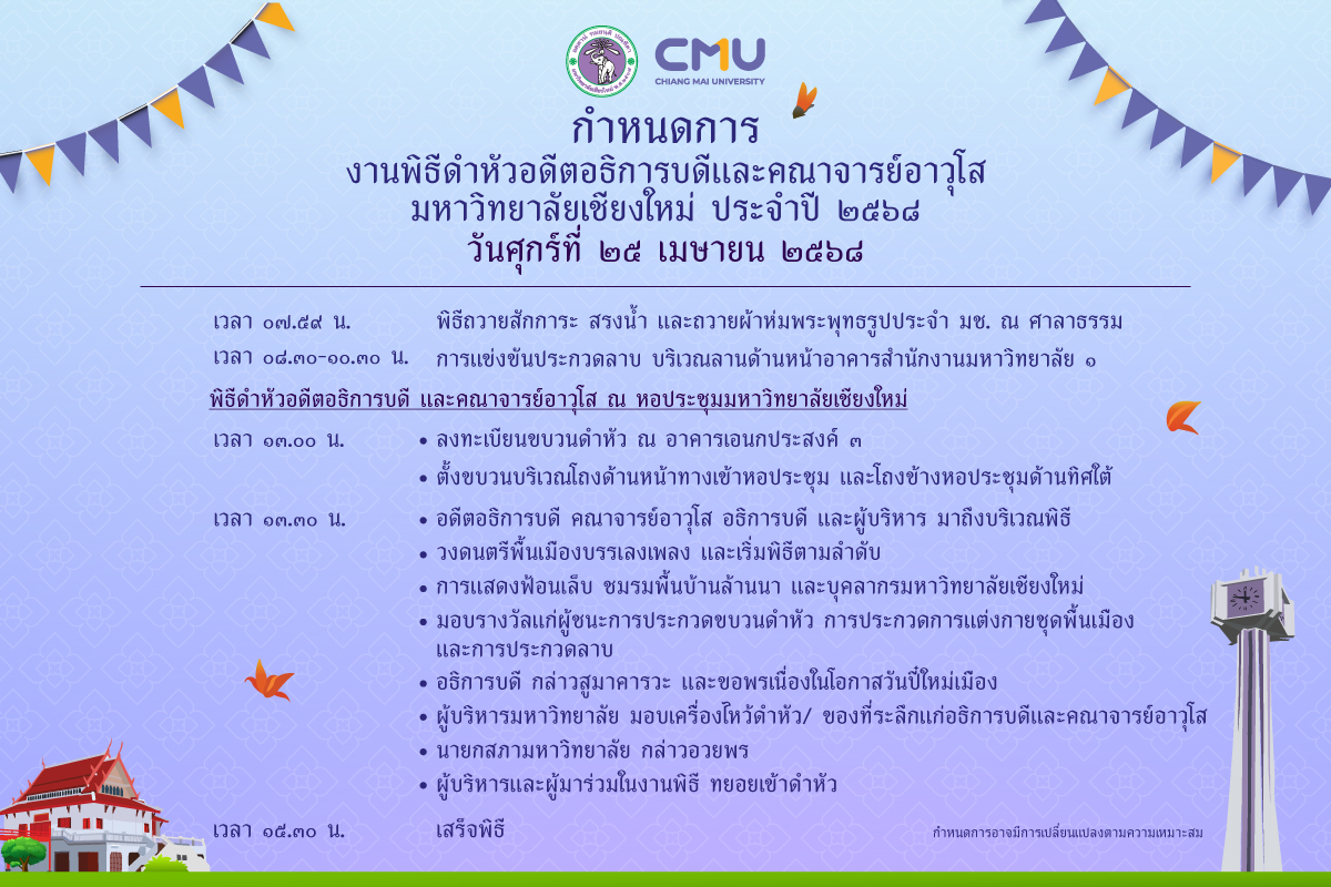 ขอเชิญชาว มช. ร่วมพิธีดำหัวอดีตอธิการบดี อธิการบดี และอาจารย์อาวุโส ศุกร์ที่ 25 เม.ย.นี้ ที่หอประชุม มหาวิทยาลัยเชียงใหม่