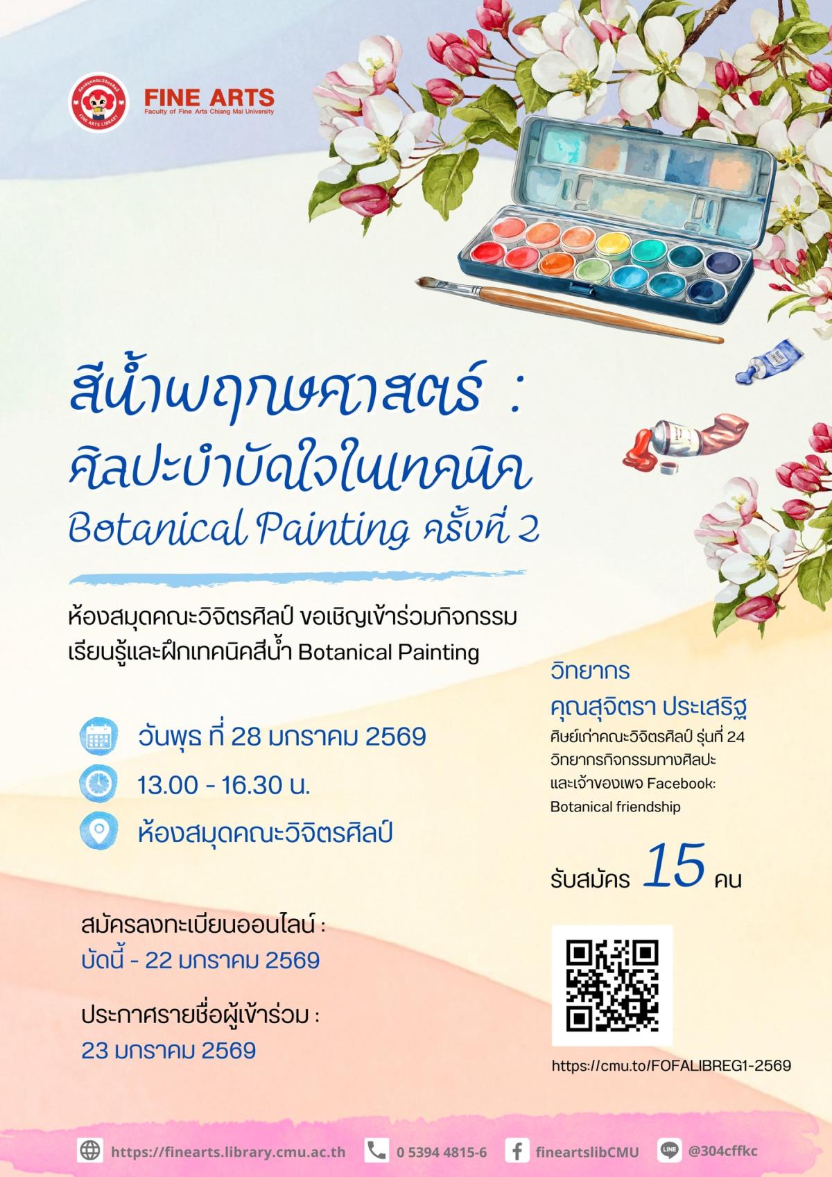 ห้องสมุดคณะวิจิตรศิลป์ มช. ได้จัดโครงการ "สีน้ำพฤกษศาสตร์: ศิลปะบำบัดใจในเทคนิค Botanical Painting ครั้งที่ 2"