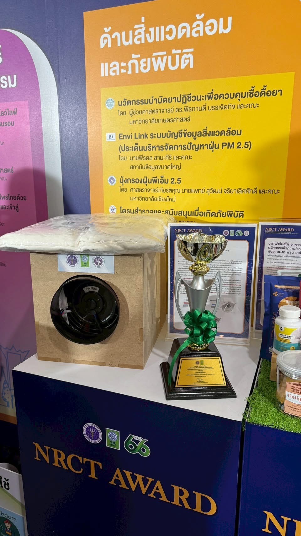 โดยผลงานที่ได้รับรางวัล ได้แก่ มุ้งกรองฝุ่น PM2.5 ซึ่งเป็นผลงานที่พัฒนาร่วมกันระหว่างคณะวิศวกรรมศาสตร์ โดยผู้ช่วยศาสตราจารย์ ดร.ภาสกร แช่มประเสริฐ และคณะสาธารณสุขศาสตร์ มหาวิทยาลัยเชียงใหม่ ซึ่งอยู่ภายใต้การดำเนินงานของโครงการการพัฒนาระบบเฝ้าระวังทางสาธารณสุขที่สัมพันธ์กับการเปลี่ยนแปลงสภาพอากาศ ในเขตภาคเหนือตอนบน ทุนสนับสนุนการวิจัยโดย สำนักงานการวิจัยแห่งชาติ (วช.)