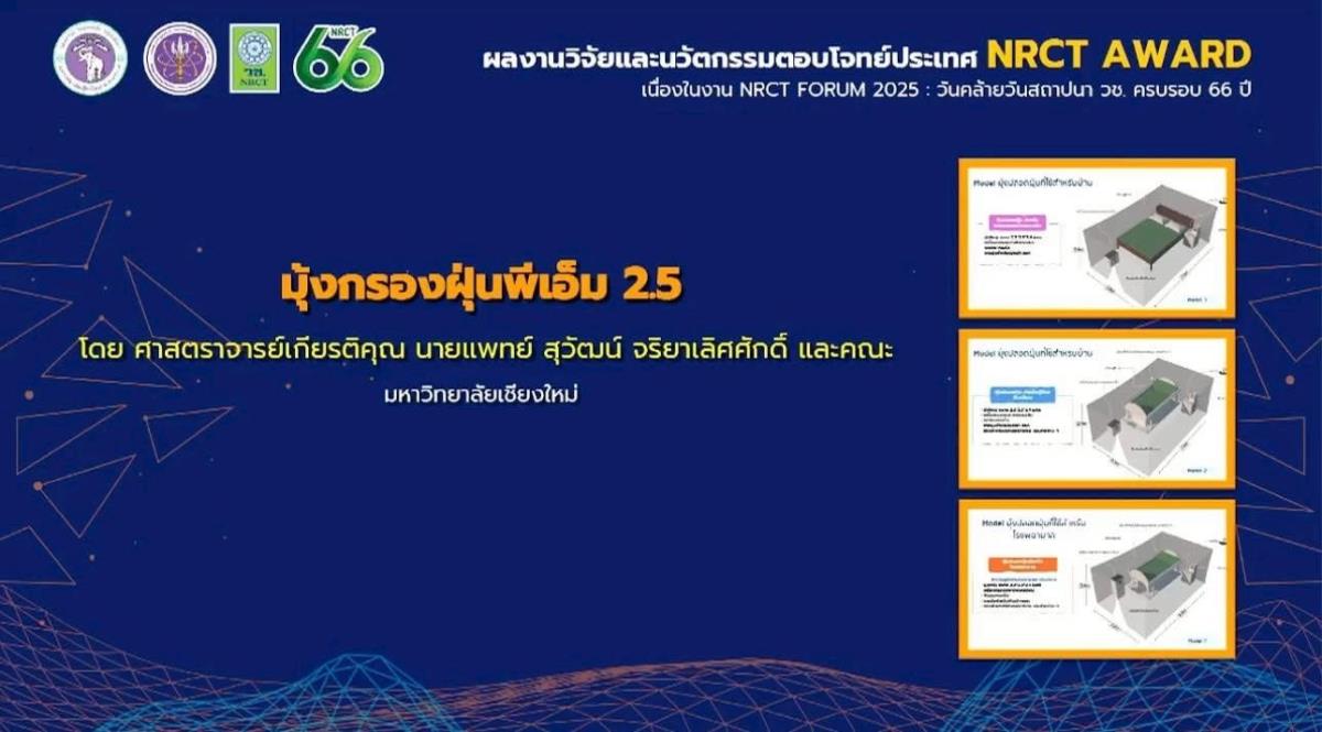 ศาสตราจารย์เกียรติคุณ นายแพทย์สุวัฒน์ จริยาเลิศศักดิ์ ที่ปรึกษาคณะสาธารณสุขศาสตร์ มหาวิทยาลัยเชียงใหม่ ได้เข้ารับรางวัลผลงานวิจัยและนวัตกรรมตอบโจทย์ประเทศ NRCT AWARD ด้านสิ่งแวดล้อมและภัยพิบัติ ในงาน “NRCT FORUM 2025” เนื่องในโอกาสวันคล้ายวันสถาปนา วช. ครบรอบ 66 ปี ในวันพุธที่ 29 ตุลาคม 2568 ณ ห้องประชุมจอมพลสฤษดิ์ ธนะรัชต์ ชั้น 2 อาคาร วช. 1 สำนักงานการวิจัยแห่งชาติ (วช.)