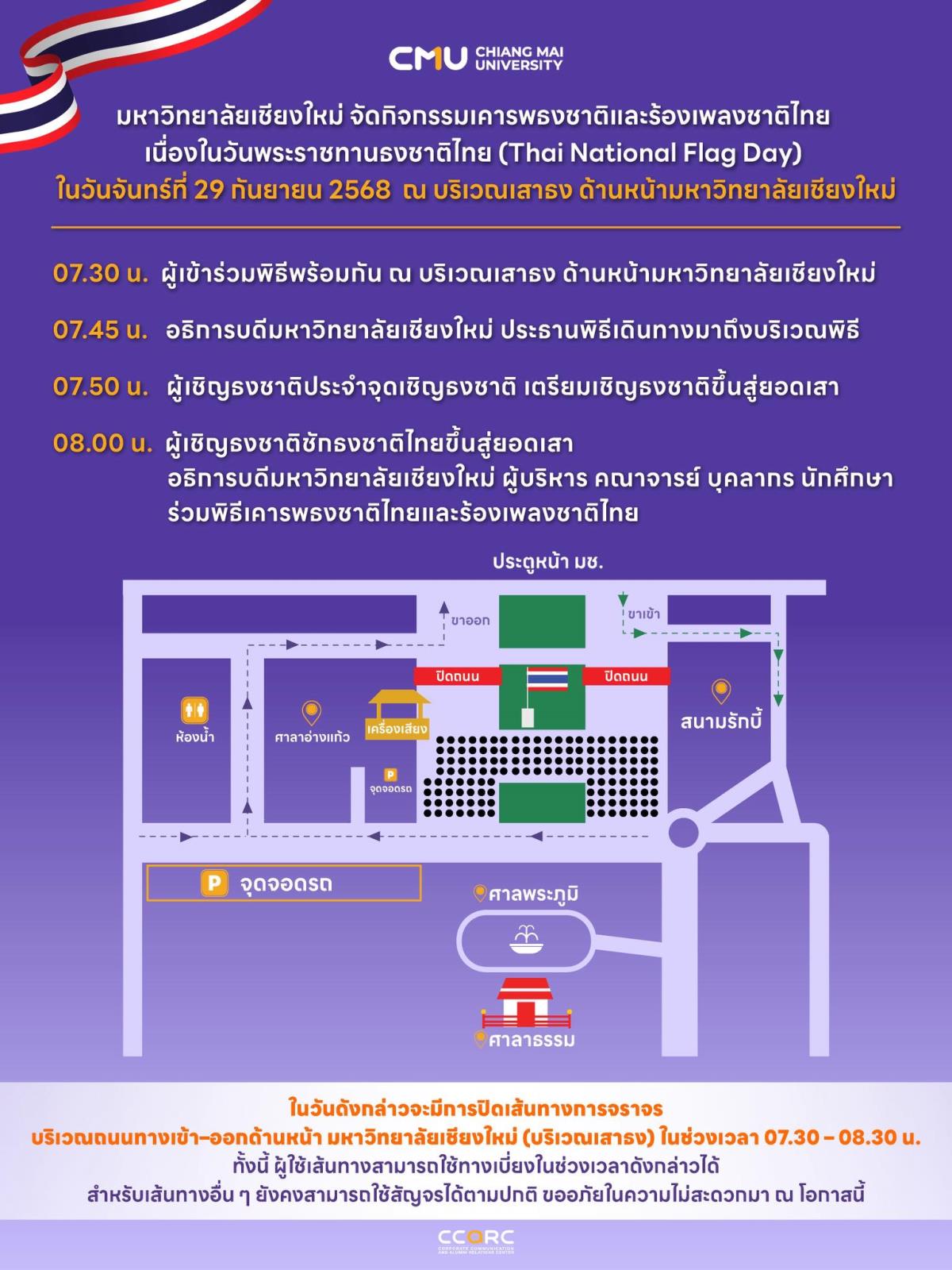 เวลา 07.30 น. - ผู้เข้าร่วมพิธีพร้อมกัน ณ บริเวณเสาธง ด้านหน้ามหาวิทยาลัยเชียงใหม่