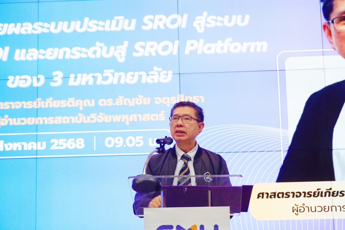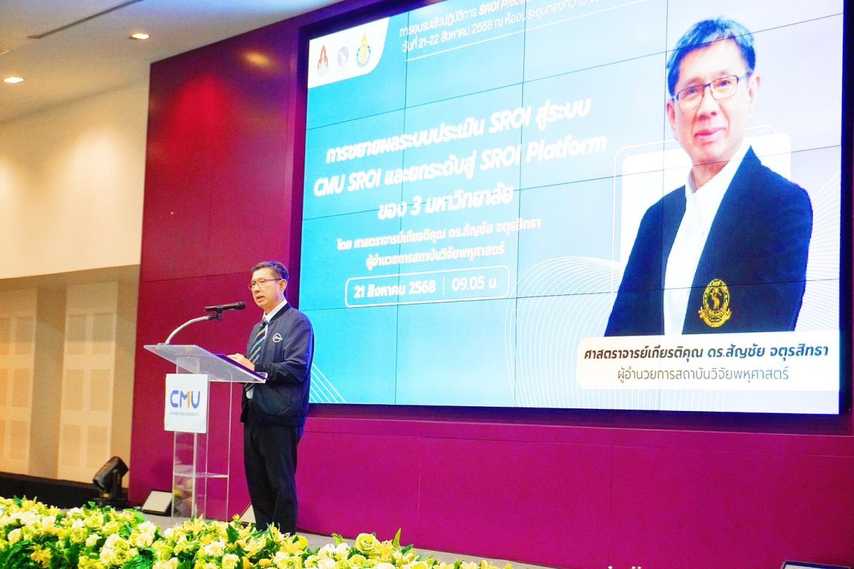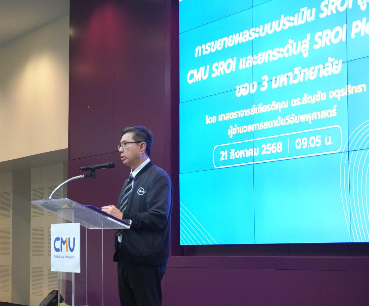 ในงานนี้ ยังได้รับเกียรติจาก ศาสตราจารย์เกียรติคุณ ดร.สัญชัย จตุรสิทธา ผู้อำนวยการสถาบันวิจัยพหุศาสตร์ มหาวิทยาลัยเชียงใหม่ ซึ่งกล่าวถึงการขยายผลระบบประเมิน SROI สู่ระบบ CMU SROI และการยกระดับสู่ SROI Platform ของ 3 มหาวิทยาลัย