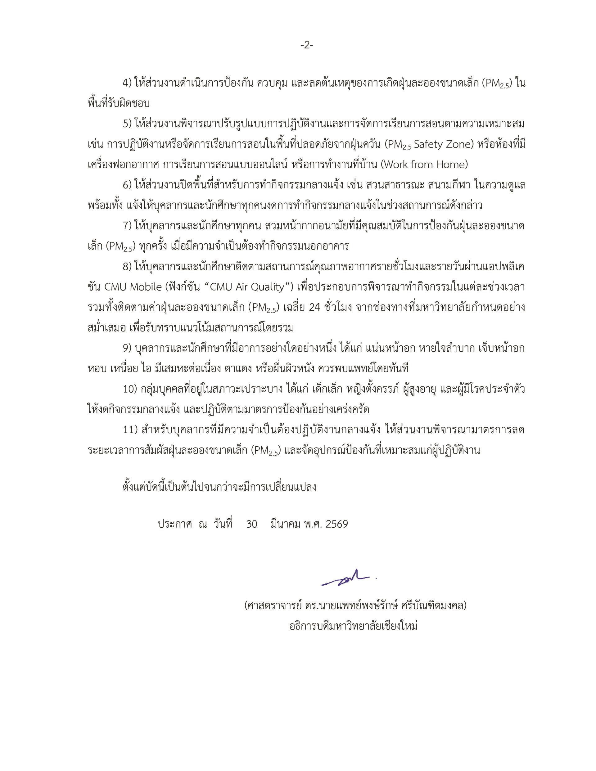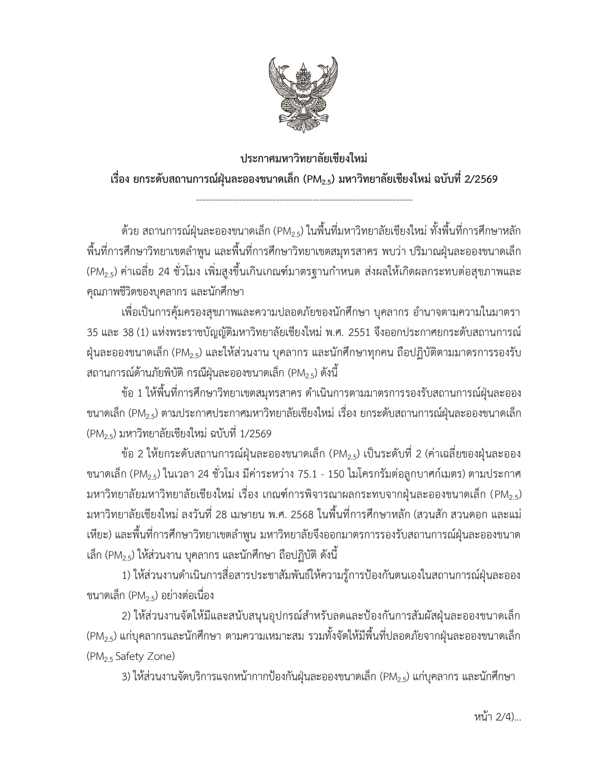 ประกาศ มช. เรื่อง ยกระดับสถานการณ์ฝุ่นละอองขนาดเล็ก (PM2.5) มหาวิทยาลัยเชียงใหม่ ฉบับที่ 2/2569