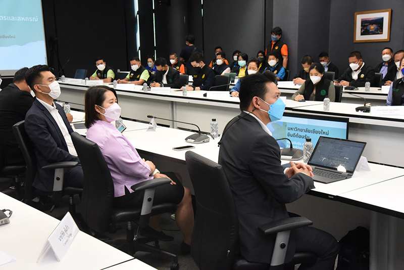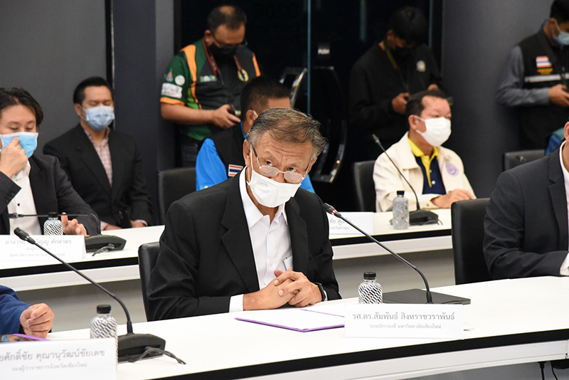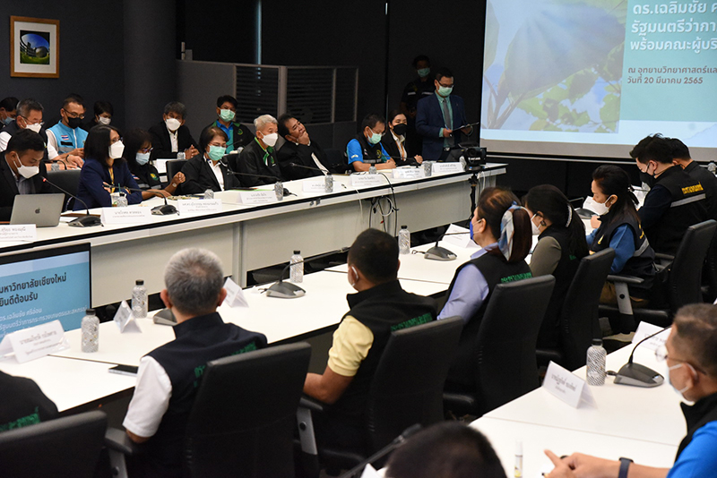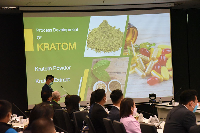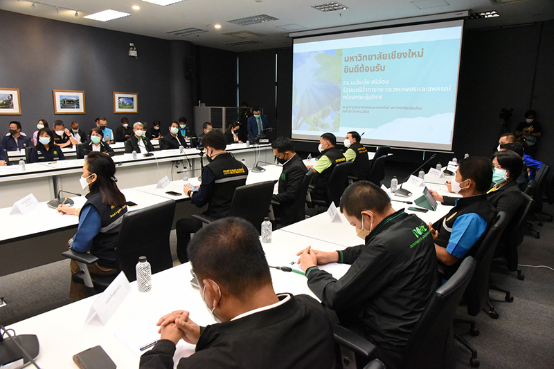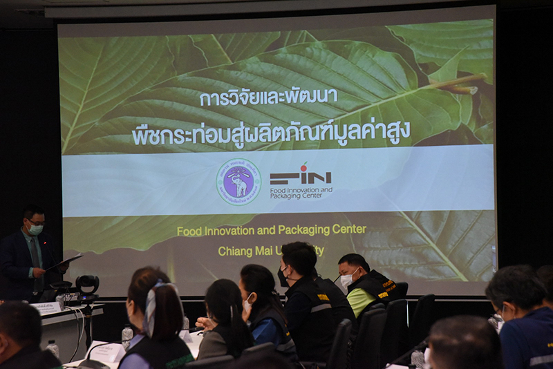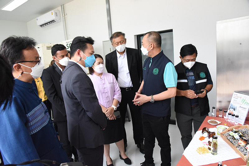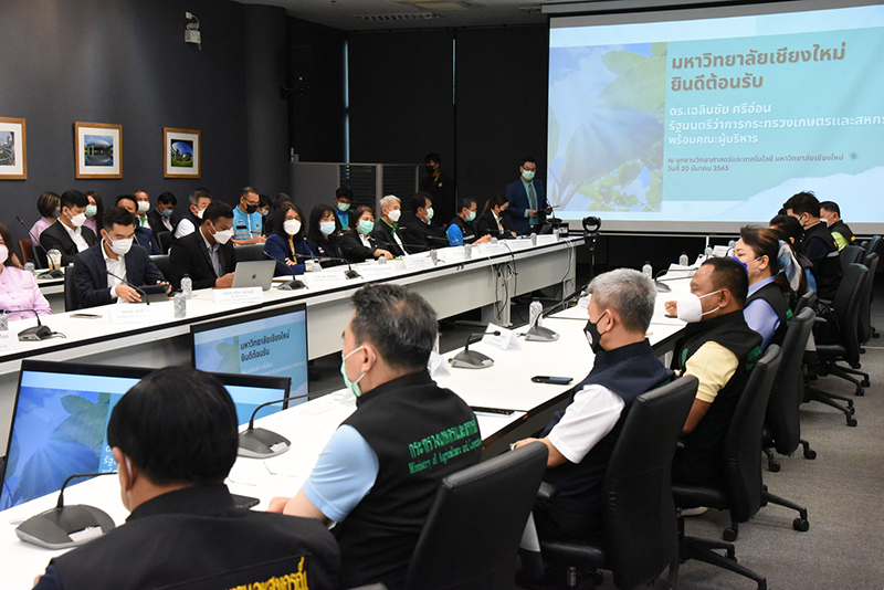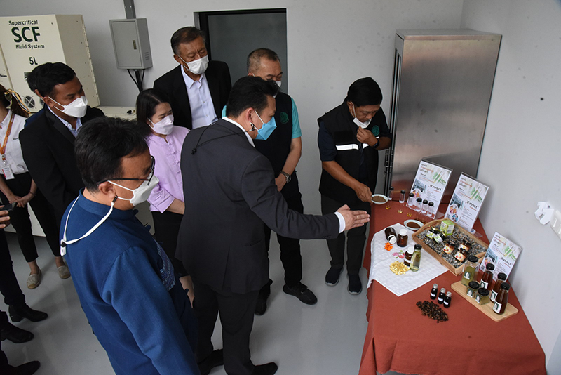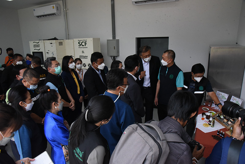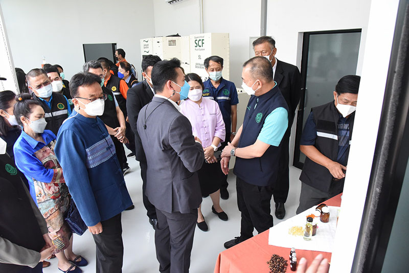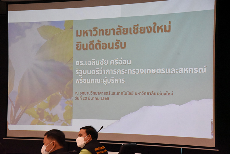 รองศาสตราจารย์ ดร.สัมพันธ์ สิงหราชวราพันธ์ รองอธิการบดี รองศาสตราจารย์ ดร.ยุทธนา พิมลศิริผล ผู้อำนวยการศูนย์นวัตกรรมอาหารและบรรจุภัณฑ์ ผู้ช่วยศาสตราจารย์ ดร.ดรุณี นาพรหม คณบดีคณะเกษตรศาสตร์ พร้อมด้วยนักวิจัย คณาจารย์ และเจ้าหน้าที่ของมหาวิทยาลัยเชียงใหม่ ให้การต้อนรับ ดร.เฉลิมชัย ศรีอ่อน รัฐมนตรีว่าการกระทรวงเกษตรและสหกรณ์ และคณะ ในโอกาสที่มารับฟังการบรรยายสรุปเกี่ยวกับการวิจัยและพัฒนาพืชกระท่อมสู่ผลิตภัณฑ์มูลค่าสูง เป็นประธานเปิดอาคารนวัตกรรมสารสกัดมูลค่าสูง iExtract และเยี่ยมชมโรงงานต้นแบบสารสกัดพืชกระท่อมคุณภาพสูง ณ อุทยานวิทยาศาสตร์และเทคโนโลยี และศูนย์นวัตกรรมอาหารและบรรจุภัณฑ์ มหาวิทยาลัยเชียงใหม่ วันอาทิตย์ที่ 20 มีนาคม พ.ศ. 2565
