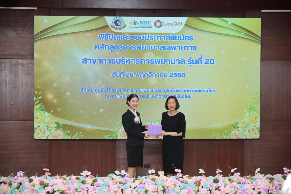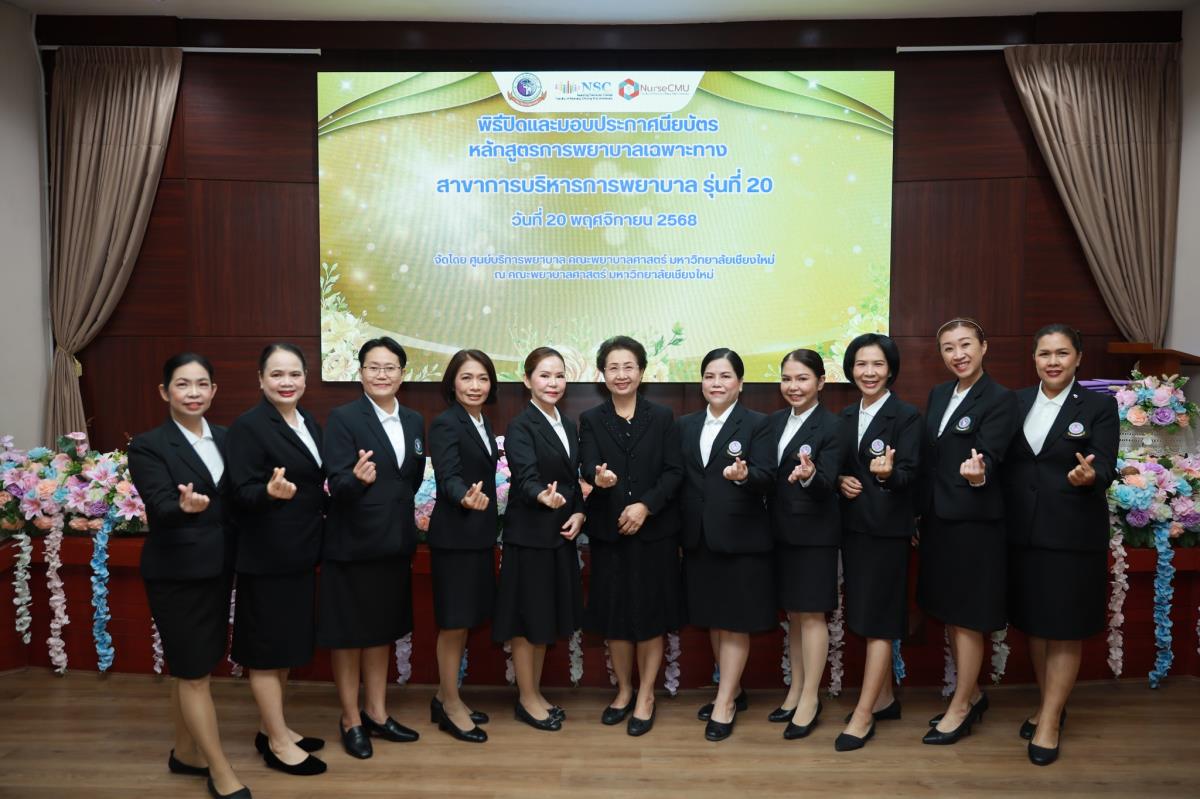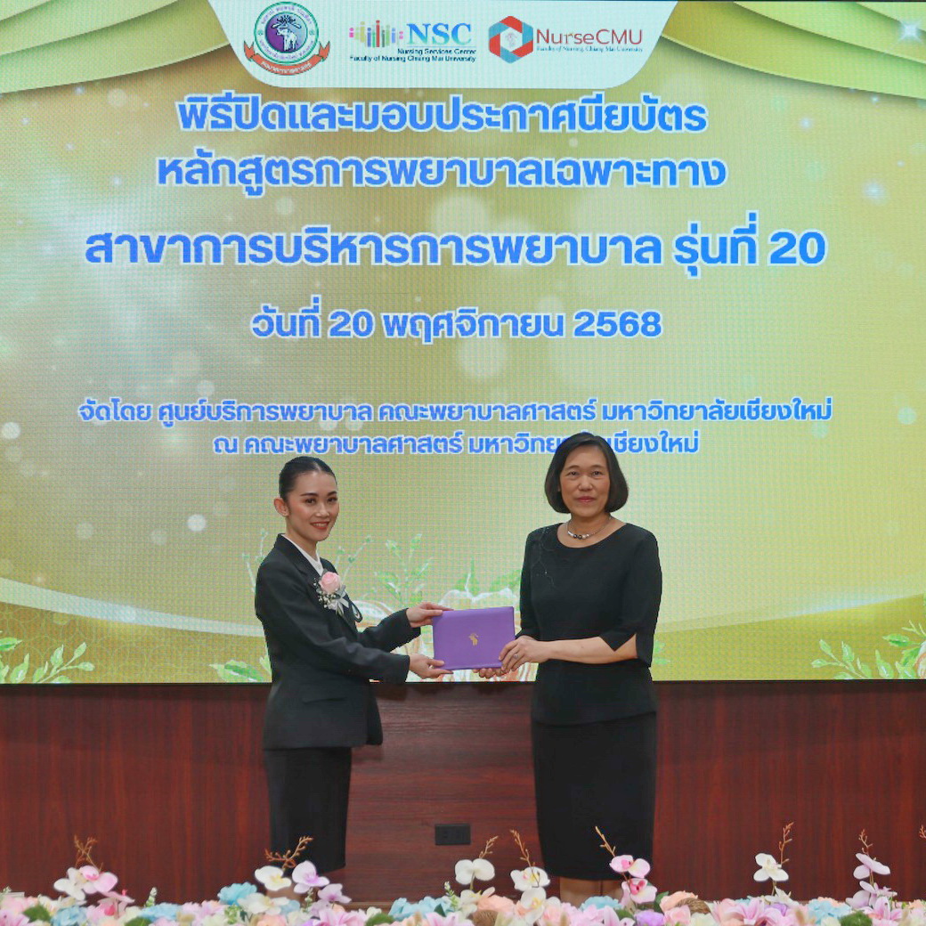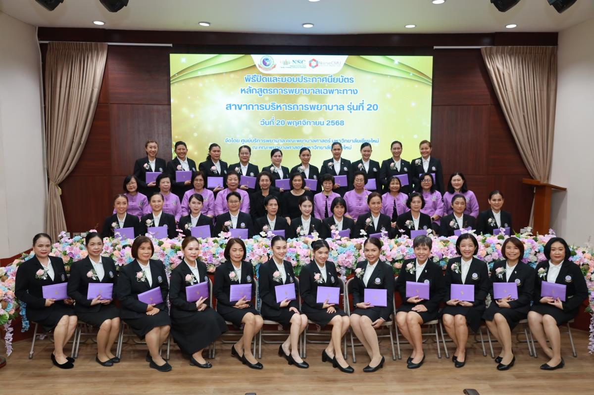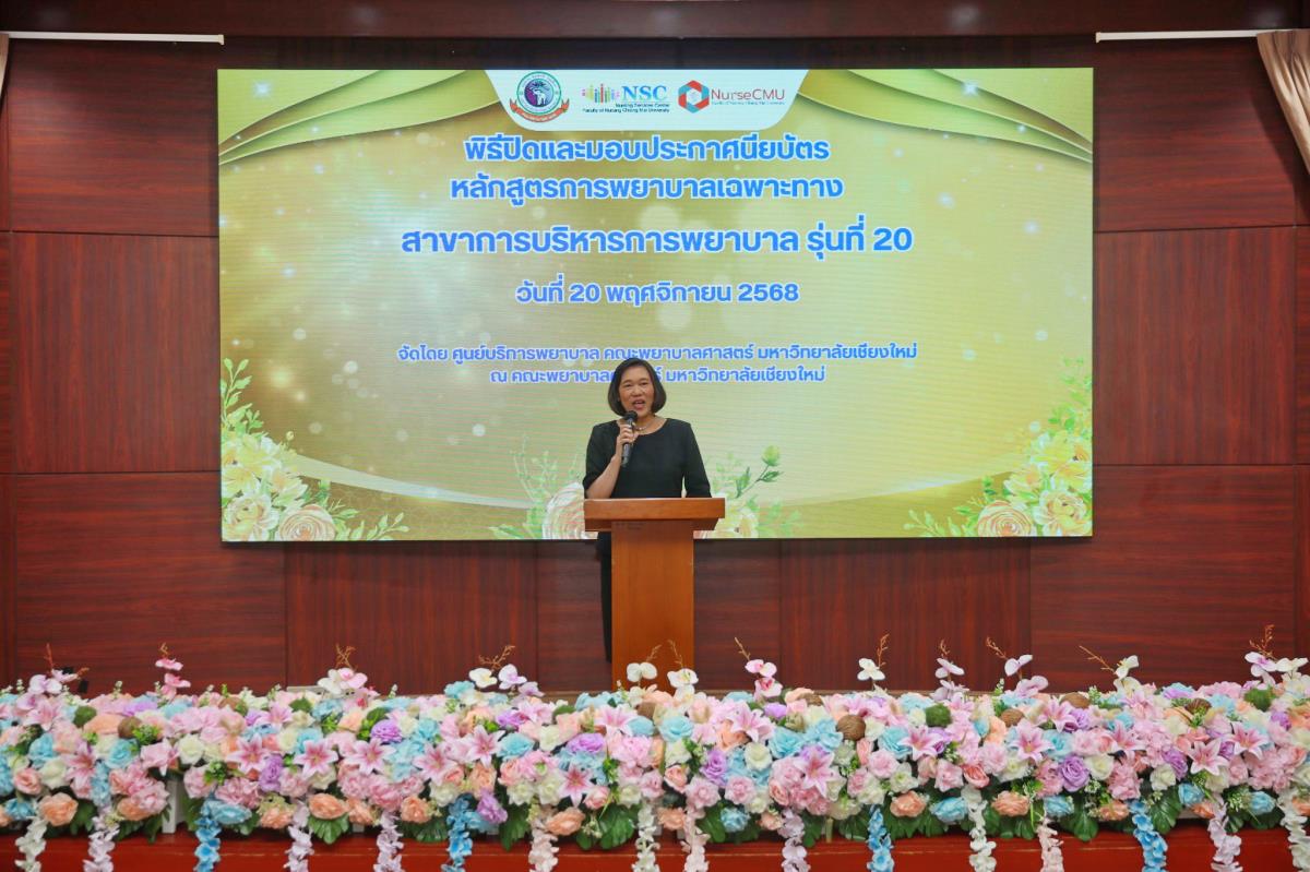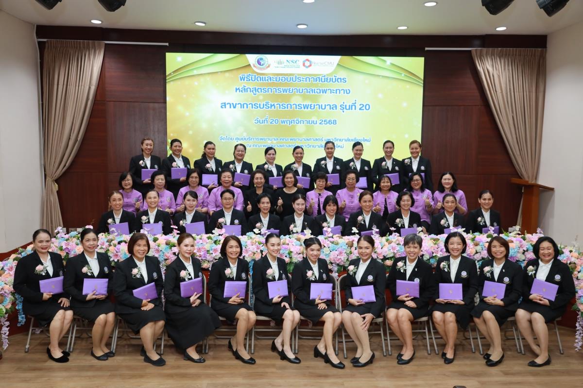 ศูนย์บริการพยาบาล คณะพยาบาลศาสตร์ มหาวิทยาลัยเชียงใหม่ จัดพิธีปิดและมอบประกาศนียบัตรหลักสูตรการพยาบาลเฉพาะทางสาขาการบริหารการพยาบาล รุ่นที่ 20 โดยมี ผู้ช่วยศาสตราจารย์ ดร.สุภารัตน์ วังศรีคูณ คณบดีคณะพยาบาลศาสตร์ เป็นประธาน ผู้ช่วยศาสตราจารย์ ดร.บุญพิชชา จิตต์ภักดี ประธานกรรมการหลักสูตรฯ กล่าวรายงาน และ ศาสตราจารย์คลินิก ดร.พรรณพิไล ศรีอาภรณ์ ผู้อำนวยการศูนย์บริการพยาบาล กล่าวแสดงความยินดี ณ ห้องประชุมชั้น 5 อาคาร 4 คณะพยาบาลศาสตร์ เมื่อวันพฤหัสบดีที่ 20 พฤศจิกายน 2568