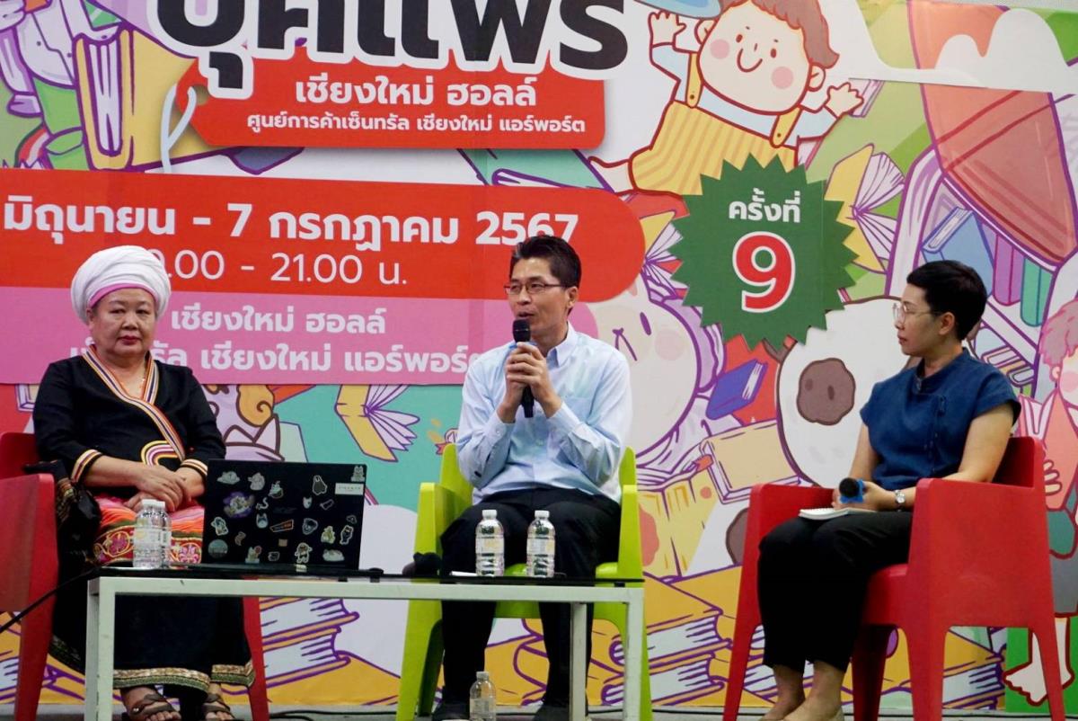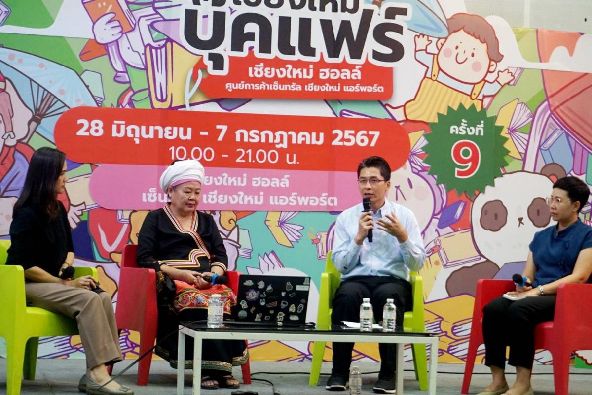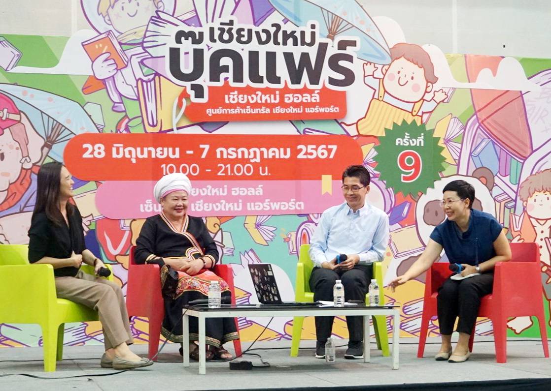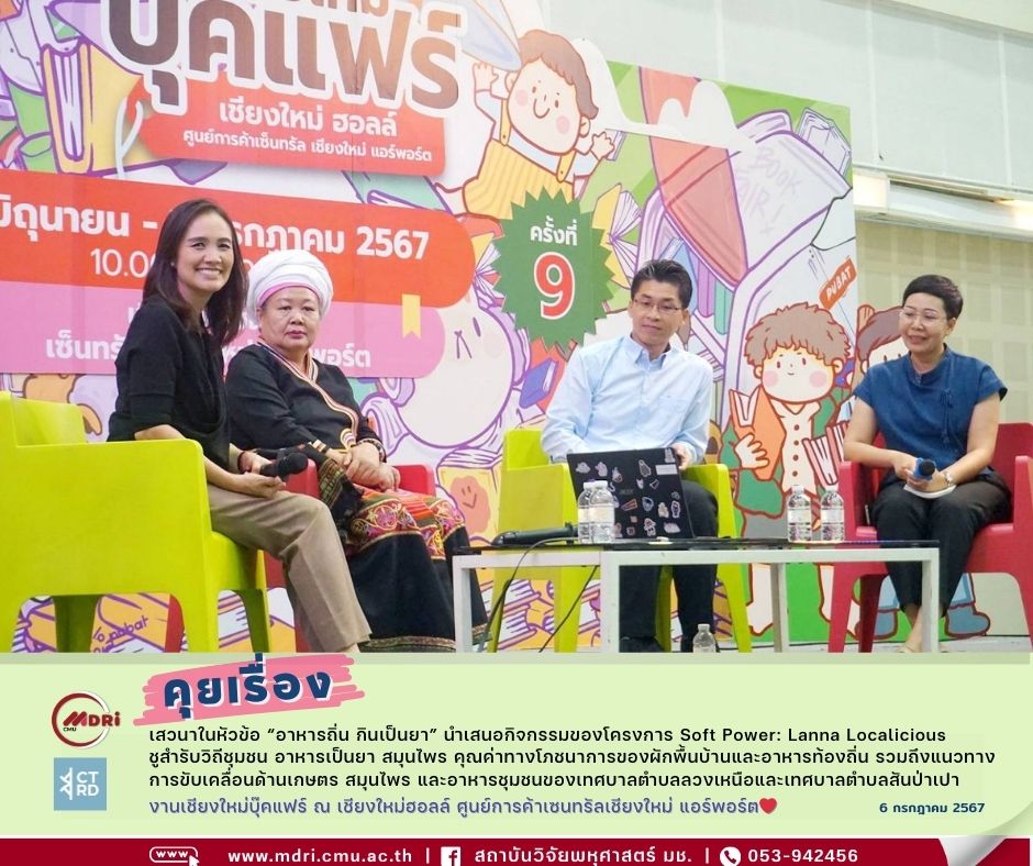 วันที่ 3 กรกฎาคม พ.ศ. 2567 เวลา 16:00 – 17:00 น. ดร.ศันสนีย์ กระจ่างโฉม นักวิจัย ศูนย์วิจัยและพัฒนาการท่องเที่ยว สถาบันวิจัยพหุศาสตร์ มหาวิทยาลัยเชียงใหม่ ร่วมกับ คุณพรรษา บัวมะลิ ผู้ก่อตั้งศูนย์การเรียนรู้ภูมิปัญญาไทยไตลื้อบ้านใบบุญ คุณเจษฎา ชคทันต์บดี นักวิชาการเกษตรชำนาญการ เทศบาลตำบลลวงเหนือ และคุณกาญจนา ศรีประเสริฐ หัวหน้าฝ่ายอำนวยการ สำนักปลัด เทศบาลตำบลสันป่าเปา ร่วมกิจกรรมการเสวนาในหัวข้อ “อาหารถิ่น กินเป็นยา” ในงานเชียงใหม่บุ๊คแฟร์ ในช่วง Education Talk ณ เชียงใหม่ฮอลล์ ศูนย์การค้าเซนทรัลชียงใหม่ แอร์พอร์ต โดยได้นำเสนอกิจกรรมของโครงการ Soft Power: Lanna Localicious ชูสำรับวิถีชุมชน อาหารเป็นยา สมุนไพร คุณค่าทางโภชนาการของผักพื้นบ้านและอาหารท้องถิ่น รวมถึงแนวทางการขับเคลื่อนด้านเกษตร สมุนไพร และอาหารชุมชนของเทศบาลตำบลลวงเหนือและเทศบาลตำบลสันป่าเปา