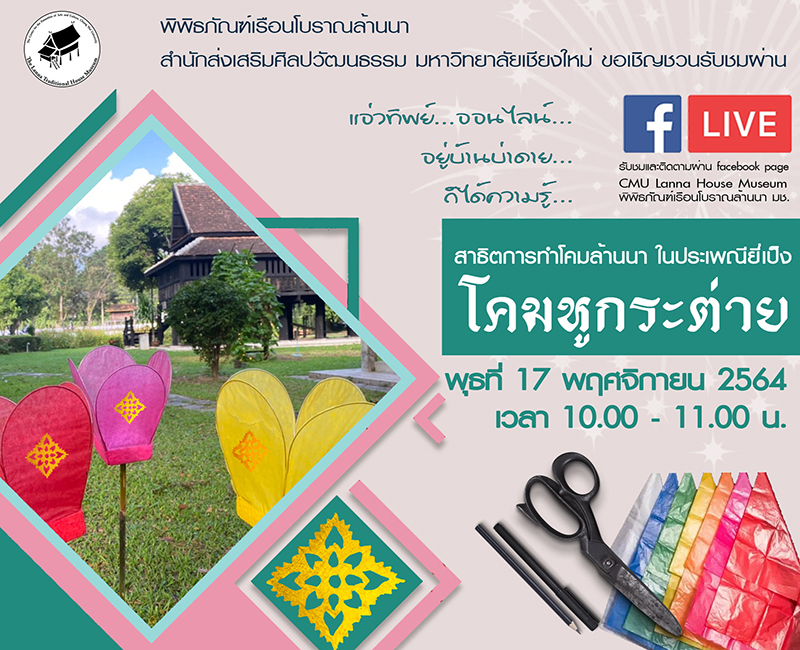 พิพิธภัณฑ์เรือนโบราณล้านนา สำนักส่งเสริมศิลปวัฒนธรรม มหาวิทยาลัยเชียงใหม่ ขอเชิญรับชม Facebook Live การสาธิตทำโคมล้านนา ในประเพณียี่เป็ง “โคมหูกระต่าย” ผ่าน Facebook Page : CMU Lanna House Museum พิพิธภัณฑ์เรือนโบราณล้านนา มช. --> https://www.facebook.com/CMULHM