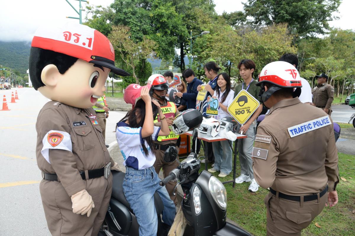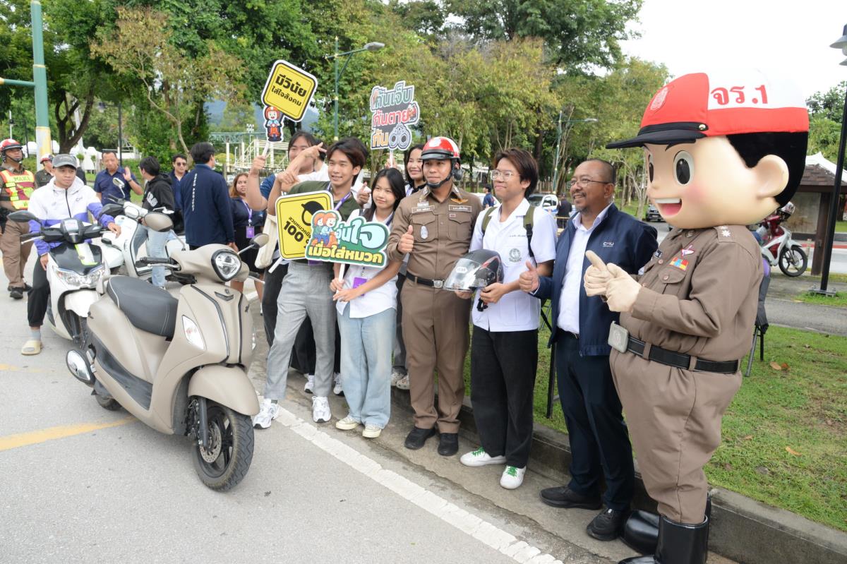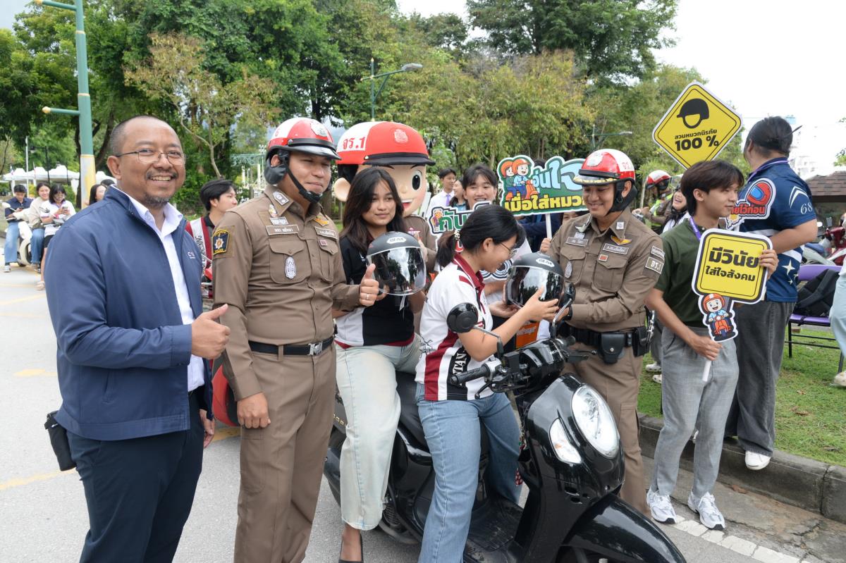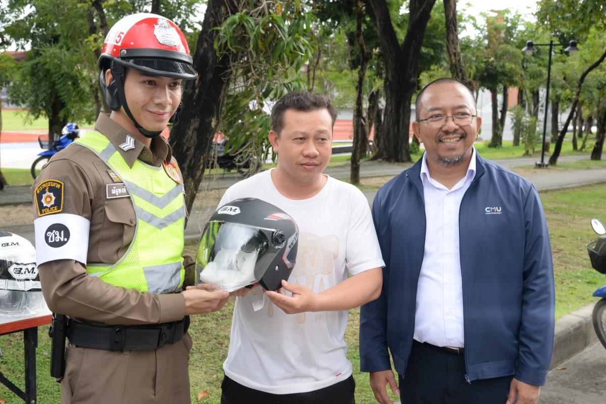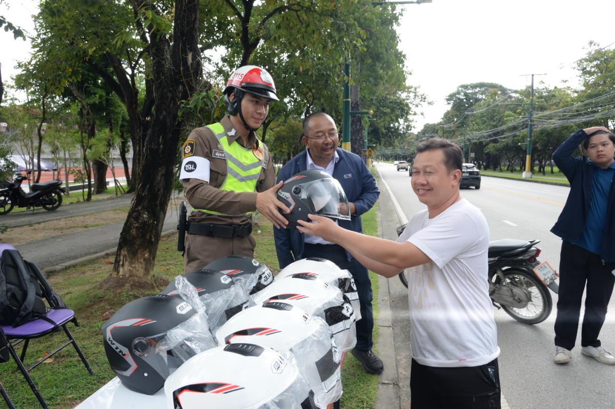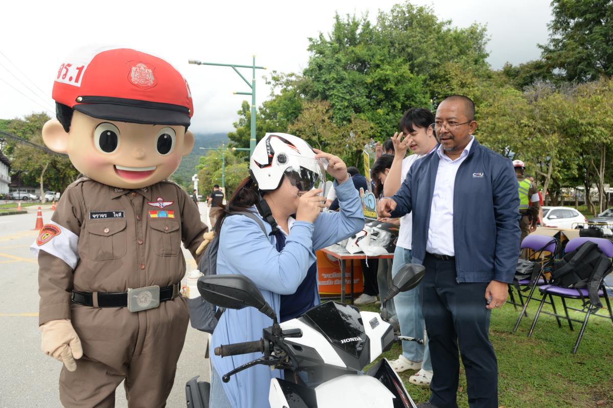 ผู้ช่วยศาสตราจารย์ ดร.จิรวัฒน์ พัสระ ผู้ช่วยอธิการบดีมหาวิทยาลัยเชียงใหม่ และพันตำรวจเอก เจน โสภา ผู้กำกับการกลุ่มงานจราจร ตำรวจภูธรจังหวัดเชียงใหม่ ร่วมกิจกรรมรณรงค์แจกหมวกนิรภัย ให้แก่นักศึกษาและบุคคลที่สัญจรภายในมหาวิทยาลัยเชียงใหม่ เพื่อสร้างความปลอดภัยในการขับขี่รถจักรยานยนต์ ลดปัญหาของการบาดเจ็บและเสียชีวิตจากอุบัติเหตุ ตลอดจนการสร้างระเบียบวินัยในการขับขี่ยานพาหนะให้ถูกต้องตามกฎจราจร ณ ลานด้านหน้า CMU 60th Years Main Stadium ศูนย์กีฬาและสุขภาพ มหาวิทยาลัยเชียงใหม่ วันพุธที่ 1 ตุลาคม พ.ศ. 2568