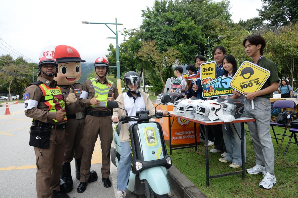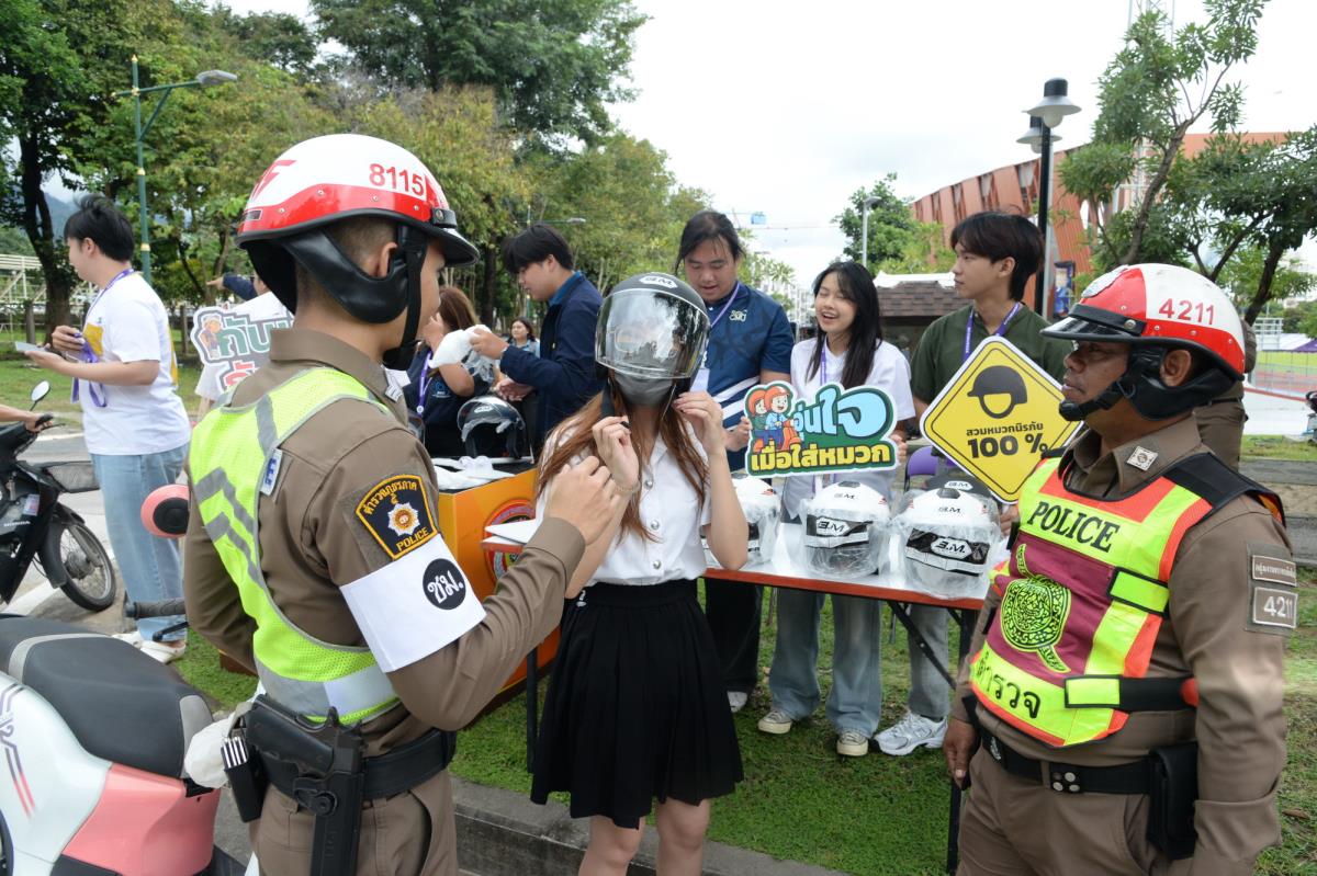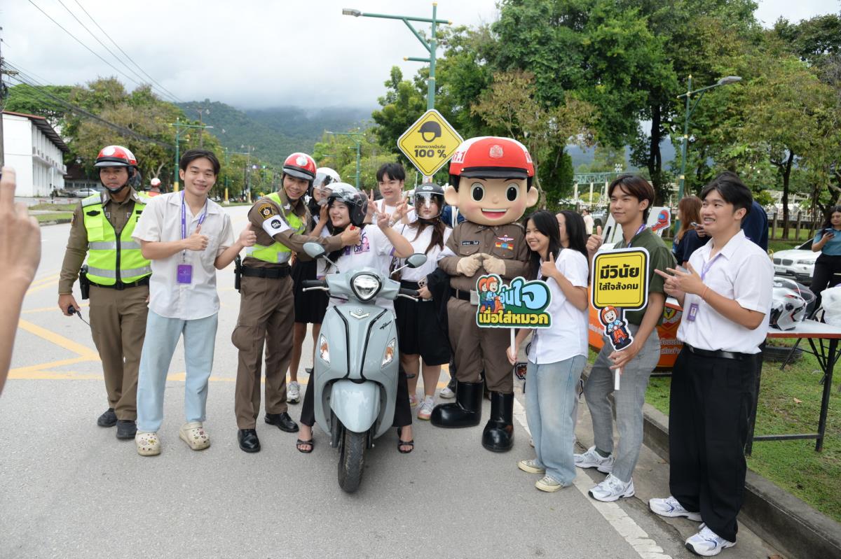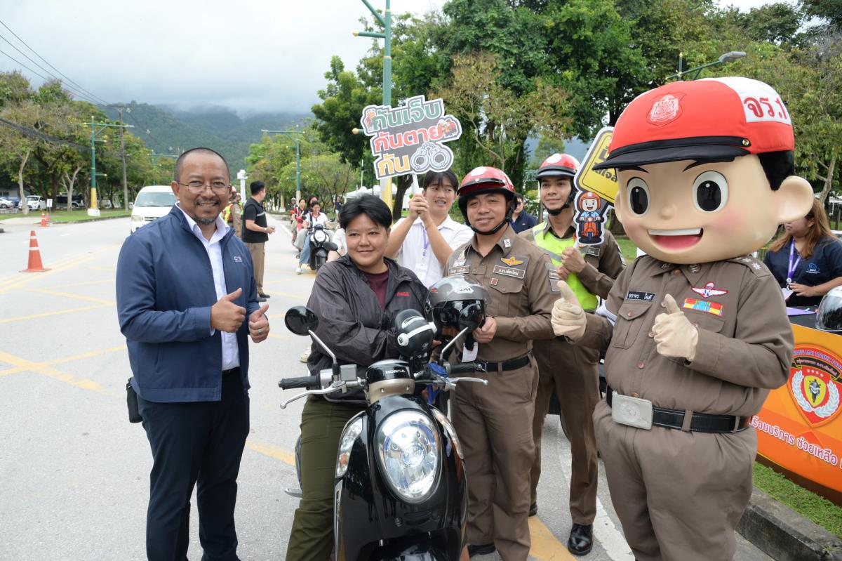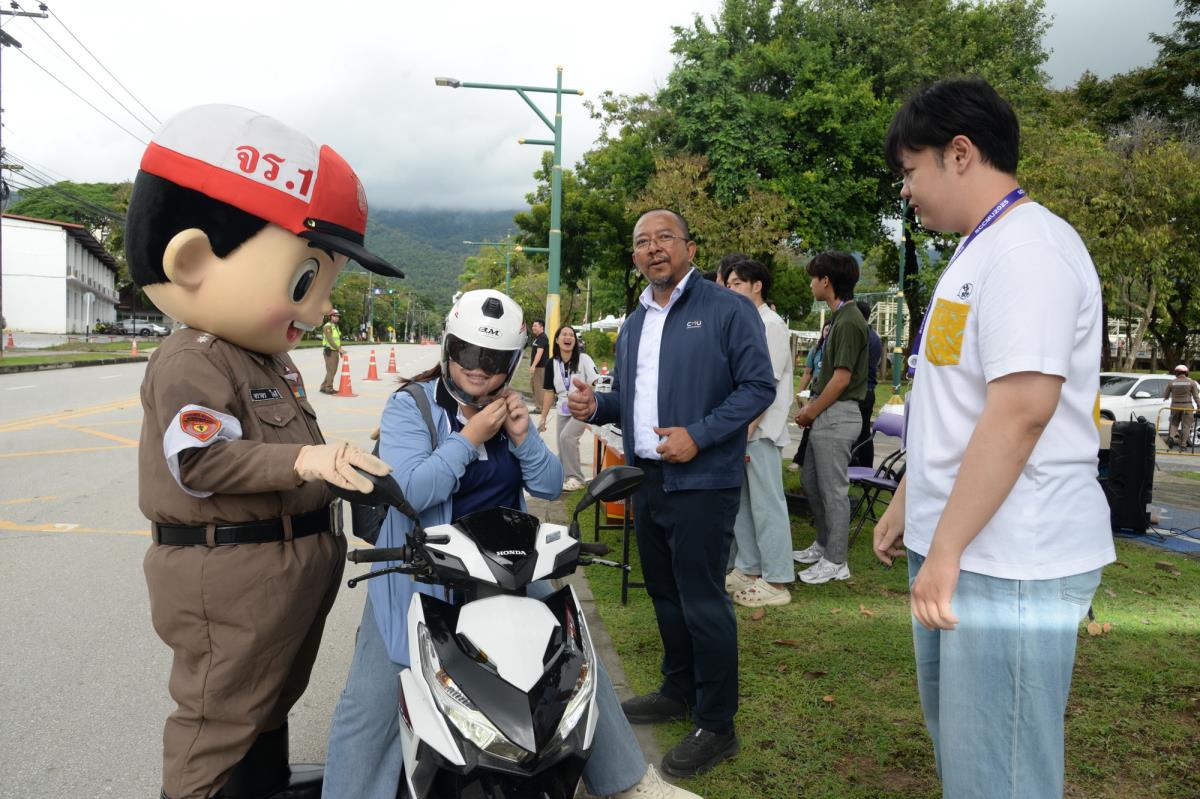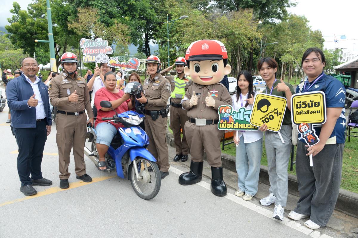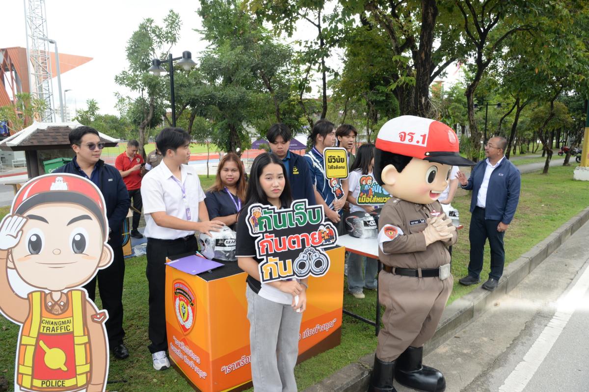 ผู้ช่วยศาสตราจารย์ ดร.จิรวัฒน์ พัสระ ผู้ช่วยอธิการบดีมหาวิทยาลัยเชียงใหม่ และพันตำรวจเอก เจน โสภา ผู้กำกับการกลุ่มงานจราจร ตำรวจภูธรจังหวัดเชียงใหม่ ร่วมกิจกรรมรณรงค์แจกหมวกนิรภัย ให้แก่นักศึกษาและบุคคลที่สัญจรภายในมหาวิทยาลัยเชียงใหม่ เพื่อสร้างความปลอดภัยในการขับขี่รถจักรยานยนต์ ลดปัญหาของการบาดเจ็บและเสียชีวิตจากอุบัติเหตุ ตลอดจนการสร้างระเบียบวินัยในการขับขี่ยานพาหนะให้ถูกต้องตามกฎจราจร ณ ลานด้านหน้า CMU 60th Years Main Stadium ศูนย์กีฬาและสุขภาพ มหาวิทยาลัยเชียงใหม่ วันพุธที่ 1 ตุลาคม พ.ศ. 2568