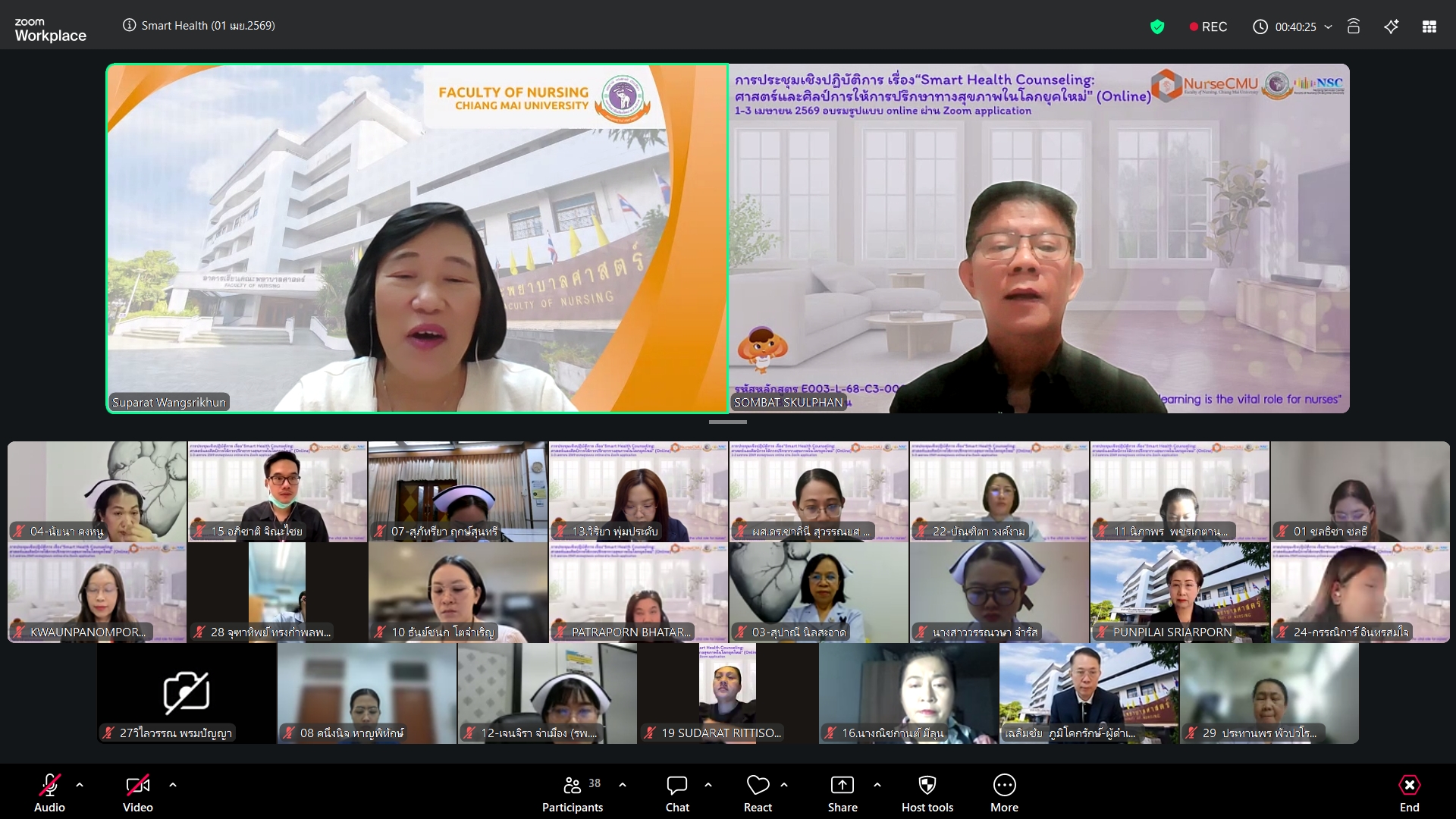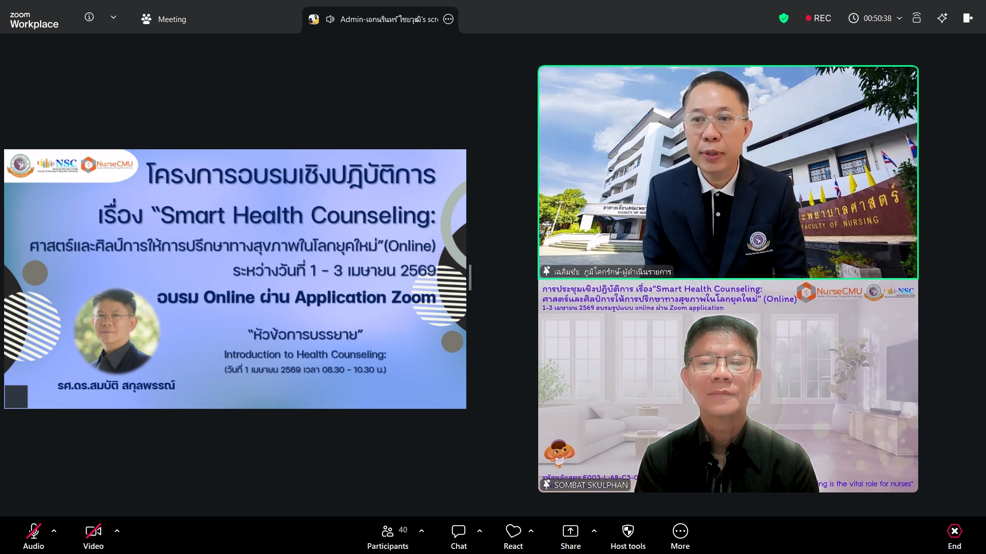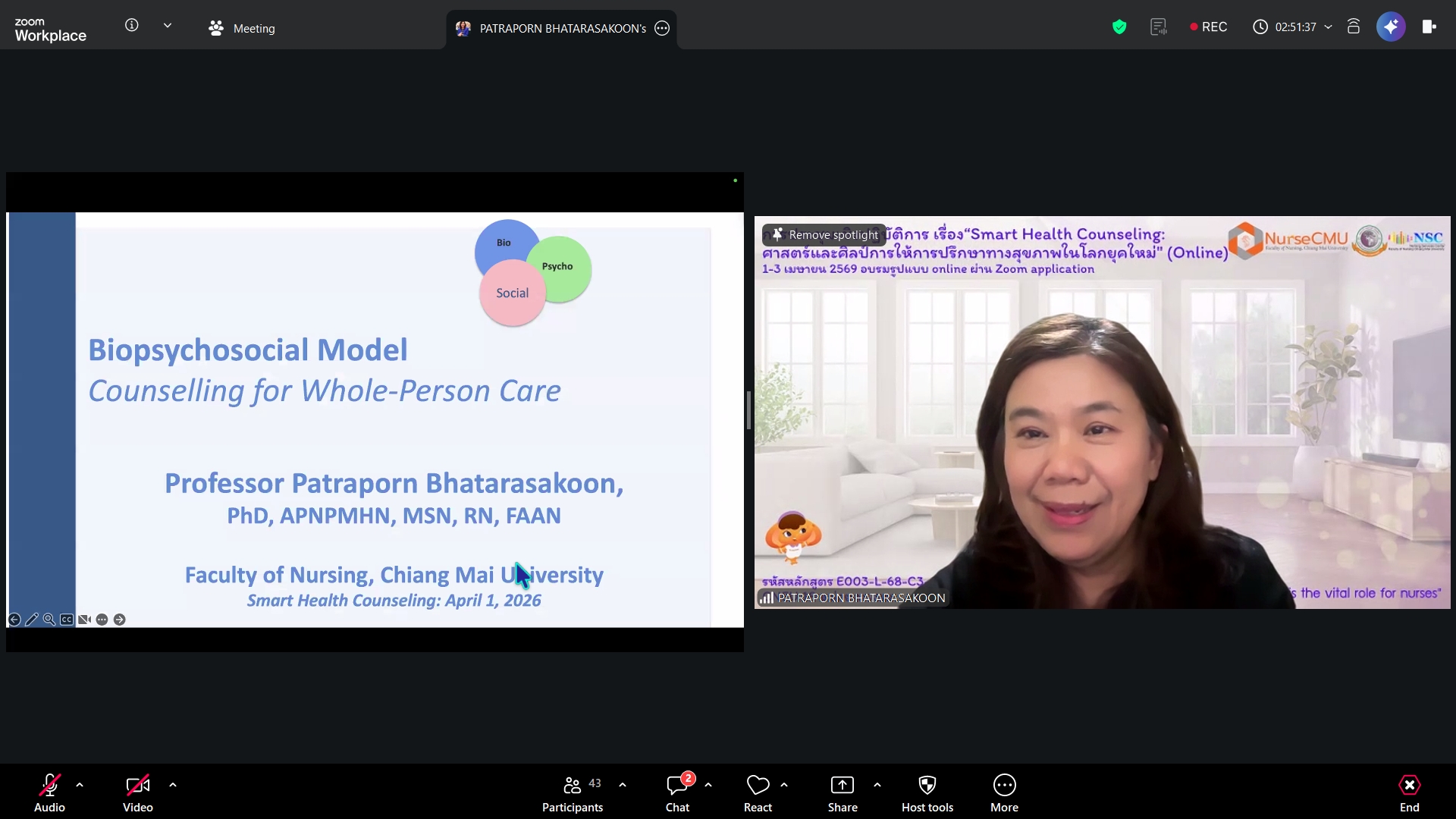 วันพุธที่ 1 เมษายน 2569 ศูนย์บริการพยาบาล คณะพยาบาลศาสตร์ มหาวิทยาลัยเชียงใหม่ จัดพิธีเปิดโครงการอบรมเชิงปฏิบัติการ "Smart Health Counseling: ศาสตร์และศิลป์การให้การปรึกษาทางสุขภาพในโลกยุคใหม่" โดยมี ผู้ช่วยศาสตราจารย์ ดร.สุภารัตน์ วังศรีคูณ คณบดีคณะพยาบาลศาสตร์ เป็นประธาน รองศาสตราจารย์ ดร.สมบัติ สกุลพรรณ์ ประธานโครงการฯ กล่าวรายงาน ศาสตราจารย์คลินิก ดร. พรรณพิไล ศรีอาภรณ์ ผู้อำนวยการศูนย์บริการพยาบาล กล่าวต้อนรับผู้เข้าอบรมจากทั่วประเทศ
