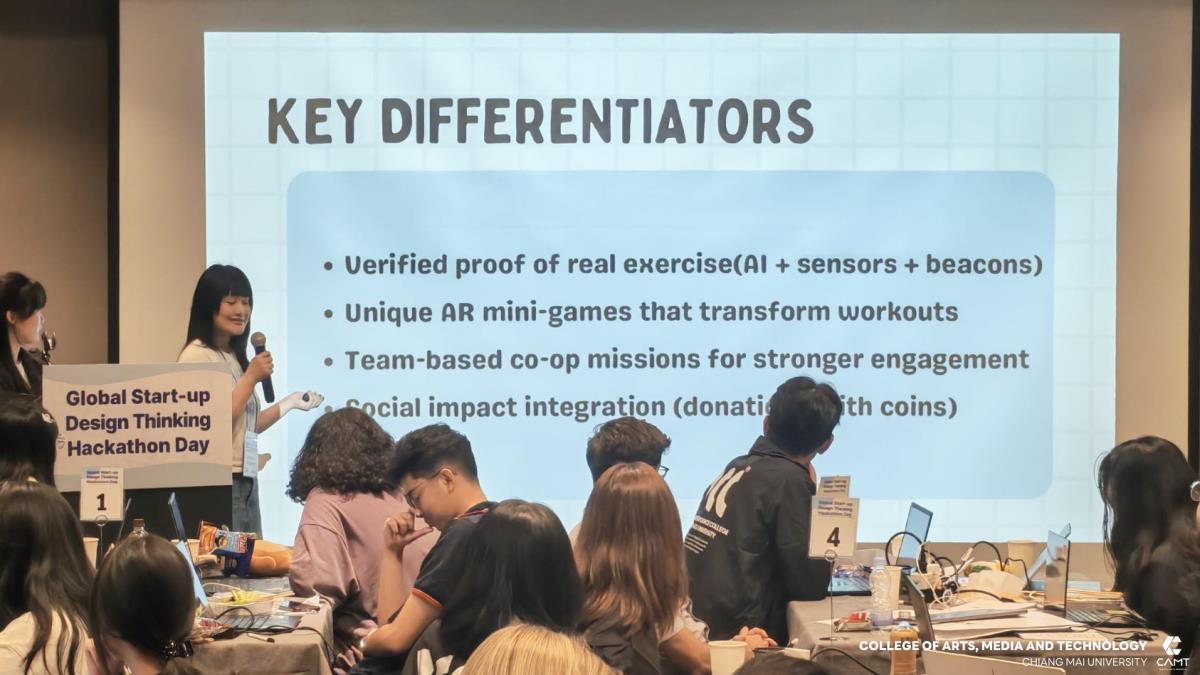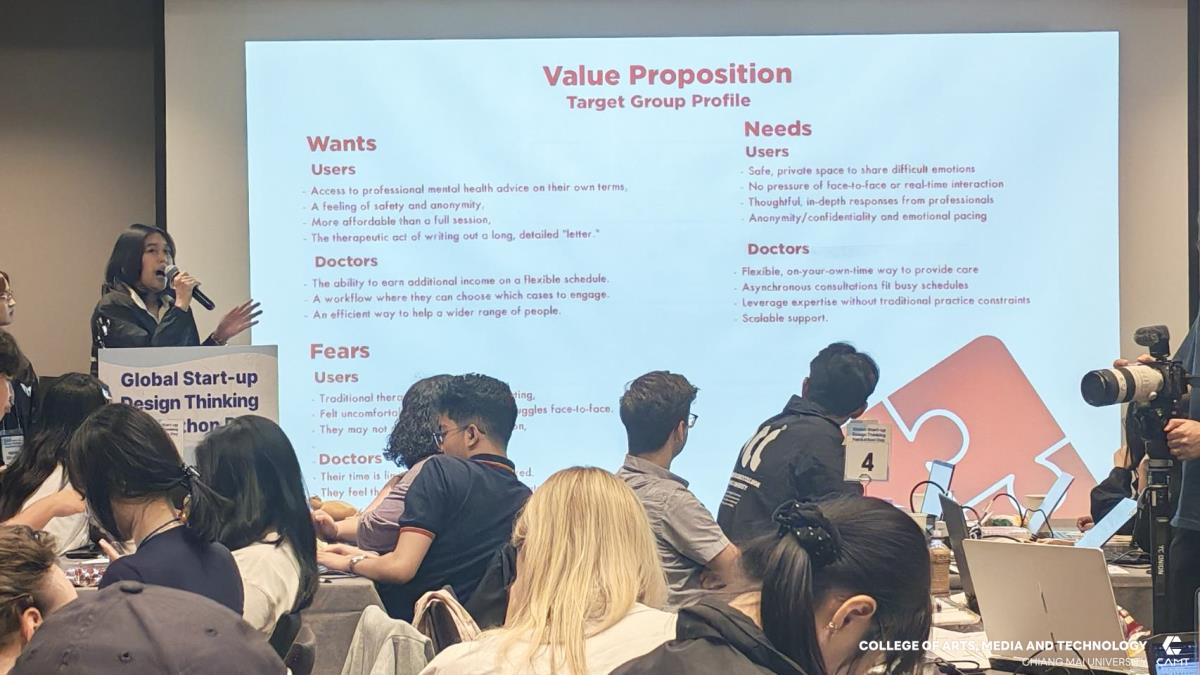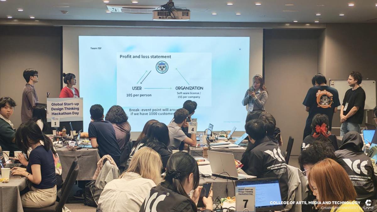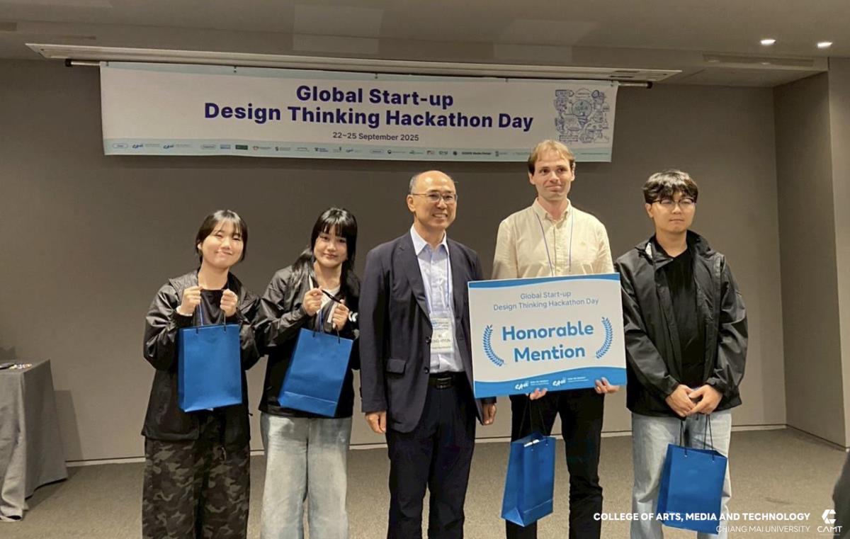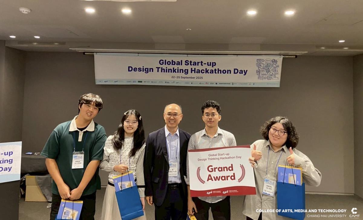 วิทยาลัยศิลปะ สื่อ และเทคโนโลยี มหาวิทยาลัยเชียงใหม่ ขอแสดงความยินดีกับนักศึกษาที่ได้รับรางวัลจากกิจกรรมการแข่งขัน Global Start-up Design Thinking Hackathon day 2025 ซึ่งจัดการแข่งขันโดย Chung-Ang University สาธารณรัฐเกาหลี เพื่อส่งเสริมและสนับสนุนให้นักศึกษาจากทั้งในสาธารณรัฐเกาหลีและนักศึกษาต่างชาติ อาทิ สาธารณรัฐสังคมนิยมเวียดนาม ประเทศอินโดนีเซีย และประเทศฮังการี จาก 12 มหาวิทยาลัย จำนวนกว่า 43 ราย ได้ทำงานร่วมกันเป็นทีมในการคิดค้นนวัตกรรมและวางแผนพัฒนาธุรกิจ นอกจากนี้ ยังเป็นโอกาสสำคัญในการเสริมสร้าง ทักษะการทำงานร่วมกับเพื่อนต่างชาติ เพื่อให้นักศึกษาได้ฝึกฝนทักษะการทำงานในระดับสากล ซึ่งสอดคล้องกับยุทธศาสตร์ของวิทยาลัยฯ ในด้าน SO1 : Excellent learning ecosystem (learning playground) ที่มุ่งเน้นการสร้างสภาพแวดล้อมการเรียนรู้ที่ยอดเยี่ยมและส่งเสริมพื้นที่ให้นักศึกษาได้พัฒนาศักยภาพอย่างเต็มที่ โดยในการแข่งขัน Hackathon ครั้งนี้ นักศึกษาจากวิทยาลัยฯ สามารถคว้ารางวัลจากการแข่งขัน รวม 4 รางวัล ได้แก่