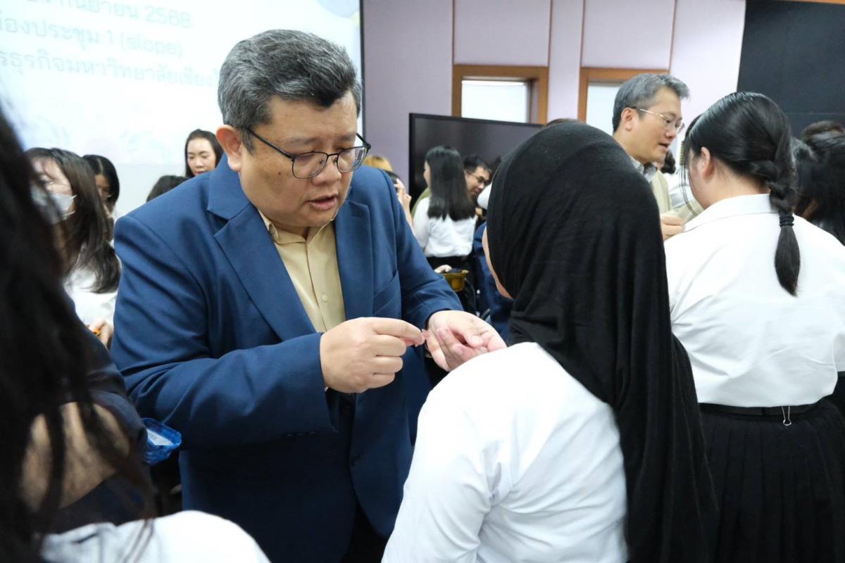 วันที่ 24 กันยายน 2568 สโมสรนักศึกษาคณะบริหารธุรกิจ มหาวิทยาลัยเชียงใหม่ จัดพิธีผูกไทใส่เข็มนักศึกษาใหม่ ชั้นปีที่ 1 ประจำปีการศึกษา 2568 โดยได้รับเกียรติจาก ผศ. เอก บุญเจือ รองคณบดีคณะบริหารธุรกิจ มหาวิทยาลัยเชียงใหม่ เป็นประธาน พร้อมมอบโอวาทแก่นักศึกษา ณ ห้องประชุม 1 คณะบริหารธุรกิจ มหาวิทยาลัยเชียงใหม่ เพื่อต้อนรับนักศึกษาใหม่เข้าสู่ครอบครัวคณะบริหารธุรกิจอย่างเป็นทางการ