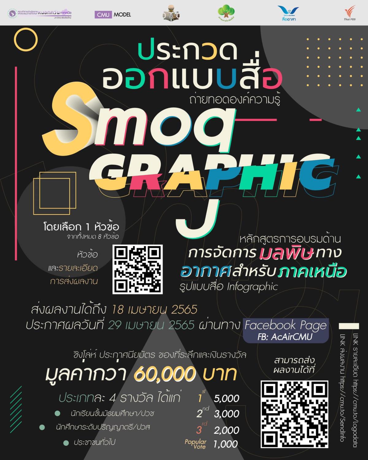 ขอเชิญ นักเรียน/ปวช. นักศึกษา/ปวส. และประชาชนทั่วไป ร่วมส่งผลงานออกแบบสื่อ Infographic เพื่อเผยแพร่องค์ความรู้เกี่ยวกับหลักสูตรการอบรมด้านการจัดการมลพิษทางอากาศสำหรับภาคเหนือ เพื่อให้เยาวชนและประชาชนทั่วไปสามารถเข้าใจได้ง่าย สร้างความตระหนักรู้เกี่ยวกับปัญหามลพิษหมอกควันให้มากยิ่งขึ้น