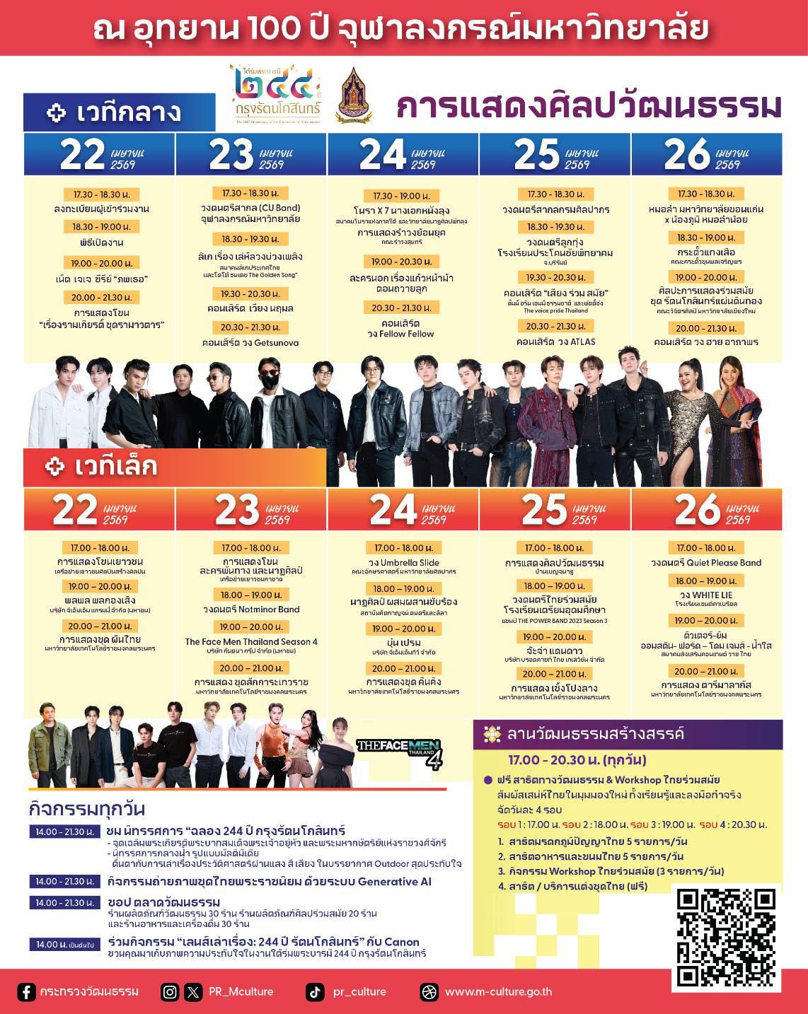อุทยาน 100 ปี จุฬาลงกรณ์มหาวิทยาลัย: พลิกโฉมสวนสาธารณะให้เป็นพื้นที่ "รัตนโกสินทร์มีชีวิต" (Living Rattanakosin) จัดเต็มด้วยนิทรรศการมัลติมีเดีย การแสดงศิลปะร่วมสมัยจากสถาบันการศึกษา และคอนเสิร์ตจากศิลปินชั้นนำ เพื่อดึงดูดคนรุ่นใหม่ให้เข้าถึงรากเหง้าวัฒนธรรมได้ง่ายขึ้น