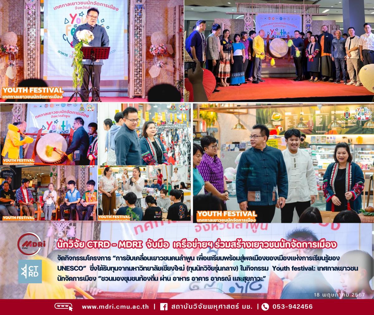 โครงการ “การขับเคลื่อนเยาวชนคนลำพูน เพื่อเตรียมพร้อมสู่พลเมืองของเมืองแห่งการเรียนรู้ของ UNESCO” ซึ่งได้รับทุนจากมหาวิทยาลัยเชียงใหม่ (ทุนนักวิจัยรุ่นกลาง) โดยมี ดร.สุดารัตน์ อุทธารัตน์ นักวิจัยชำนาญการพิเศษ สถาบันวิจัยพหุศาสตร์ เป็นหัวหน้าโครงการ ได้ร่วมกับร่วมกับสำนักงานกองทุนสนับสนุนการสร้างเสริมสุขภาพ (สสส.), หน่วยจัดการสุขภาวะเด็กและเยาวชนภาคเหนือตอนบน, เครือข่ายสร้างเสริมสุขภาพเยาวชน (ขสย.), สภาเด็กและเยาวชนจังหวัดลำพูนและเชียงใหม่,สำนักงานเครือข่ายองค์กรงดเหล้า ได้ร่วมกันจัดกิจกรรม Youth festival: เทศกาลเยาวชนนักจัดการเมือง “ชวนมองชุมชนท้องถิ่น ผ่าน อาหาร อาคาร อาภรณ์ และสุขภาวะ” ขึ้น