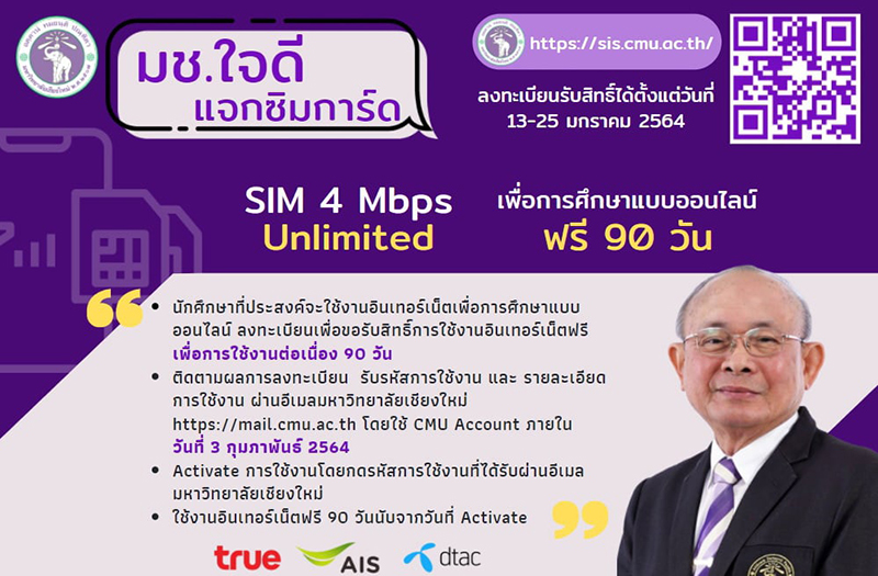 มหาวิทยาลัยเชียงใหม่ มอบ SIM 4 Mbps Unlimited เพื่อการศึกษาแบบออนไลน์ สำหรับนักศึกษา โดยสามารถลงทะเบียนรับสิทธิ์การใช้งานอินเทอร์เน็ตฟรี ซึ่งได้รับการสนับสนุนจากมหาวิทยาลัยเชียงใหม่ ได้ตั้งแต่วันที่ 13 - 25 มกราคม 2564 นี้ ที่ http://sis.cmu.ac.th