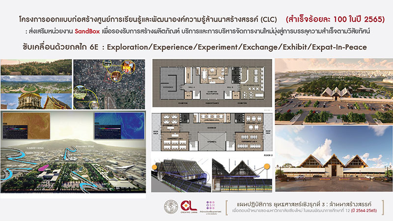 5.โครงการออกแบบก่อสร้างศูนย์การเรียนรู้และพัฒนาองค์ความรู้ล้านนาสร้างสรรค์ (Creative Lanna Center: CLC) (สำเร็จร้อยละ 100 ในปี พ.ศ. 2565) ส่งเสริมหน่วยงาน Sandbox เพื่อรองรับการสร้างผลิตภัณฑ์ บริการและการบริหารจัดการ มุ่งสู่การบรรลุความสำเร็จตามวิสัยทัศน์